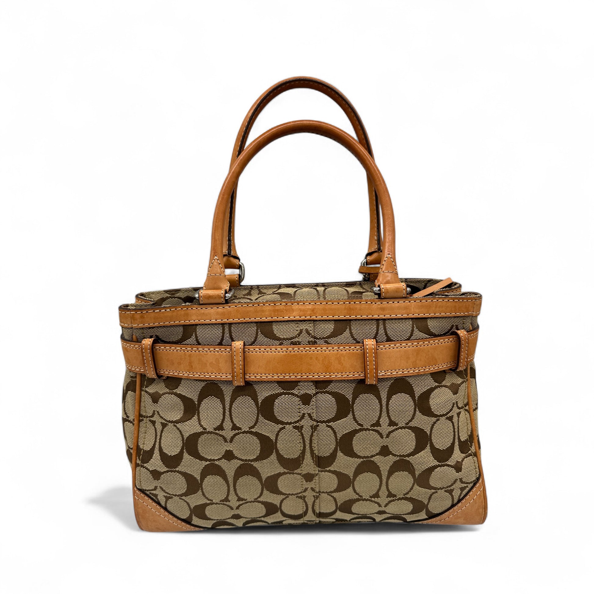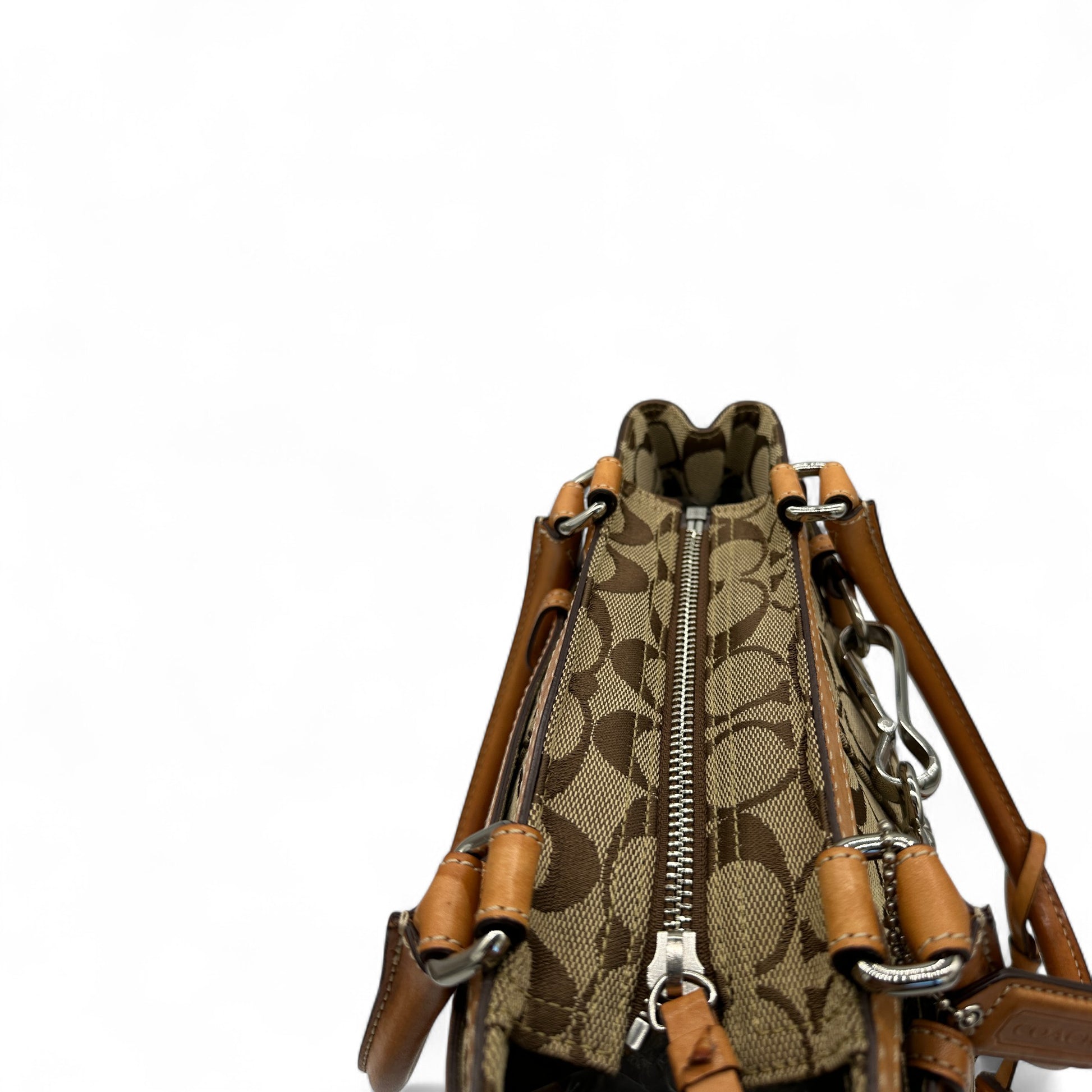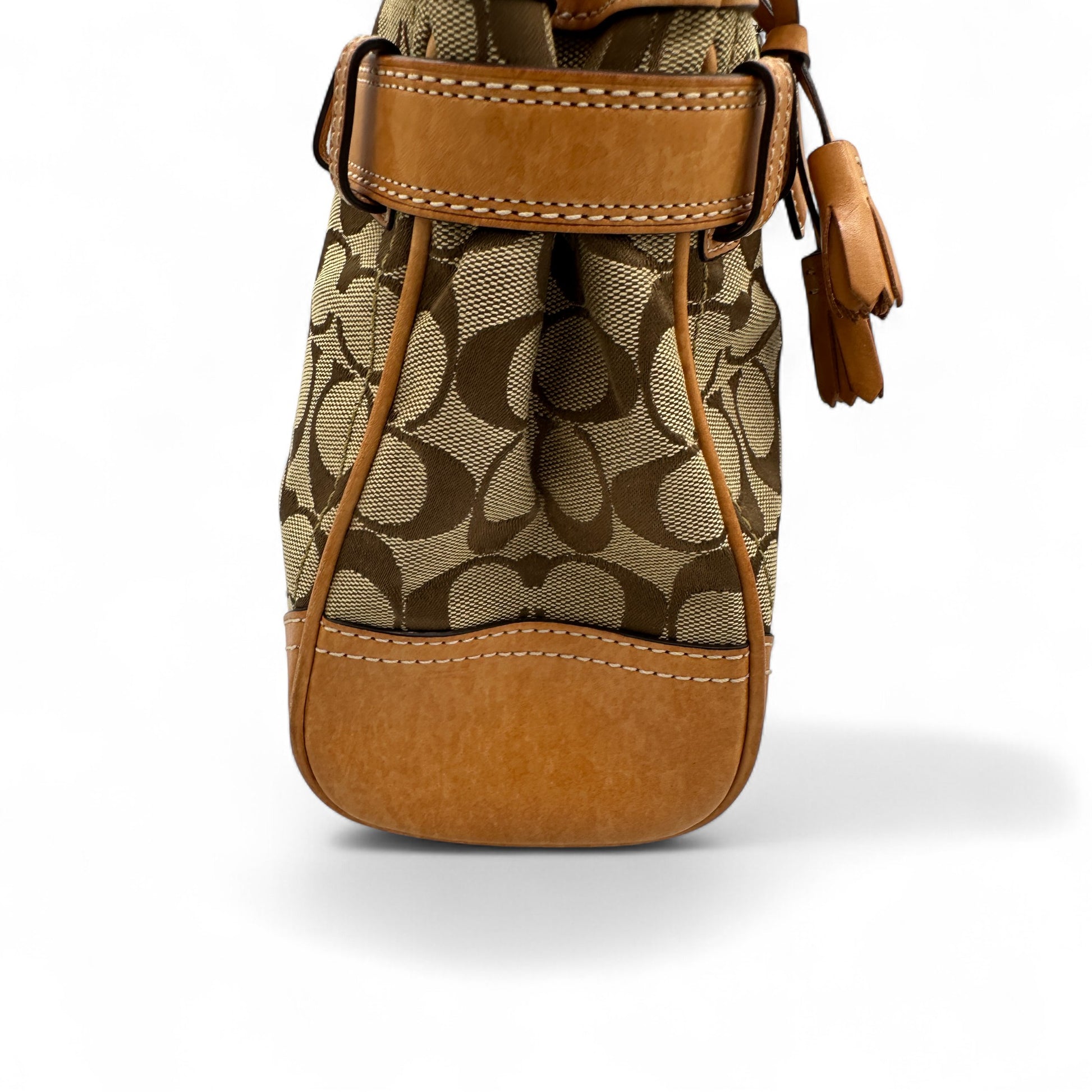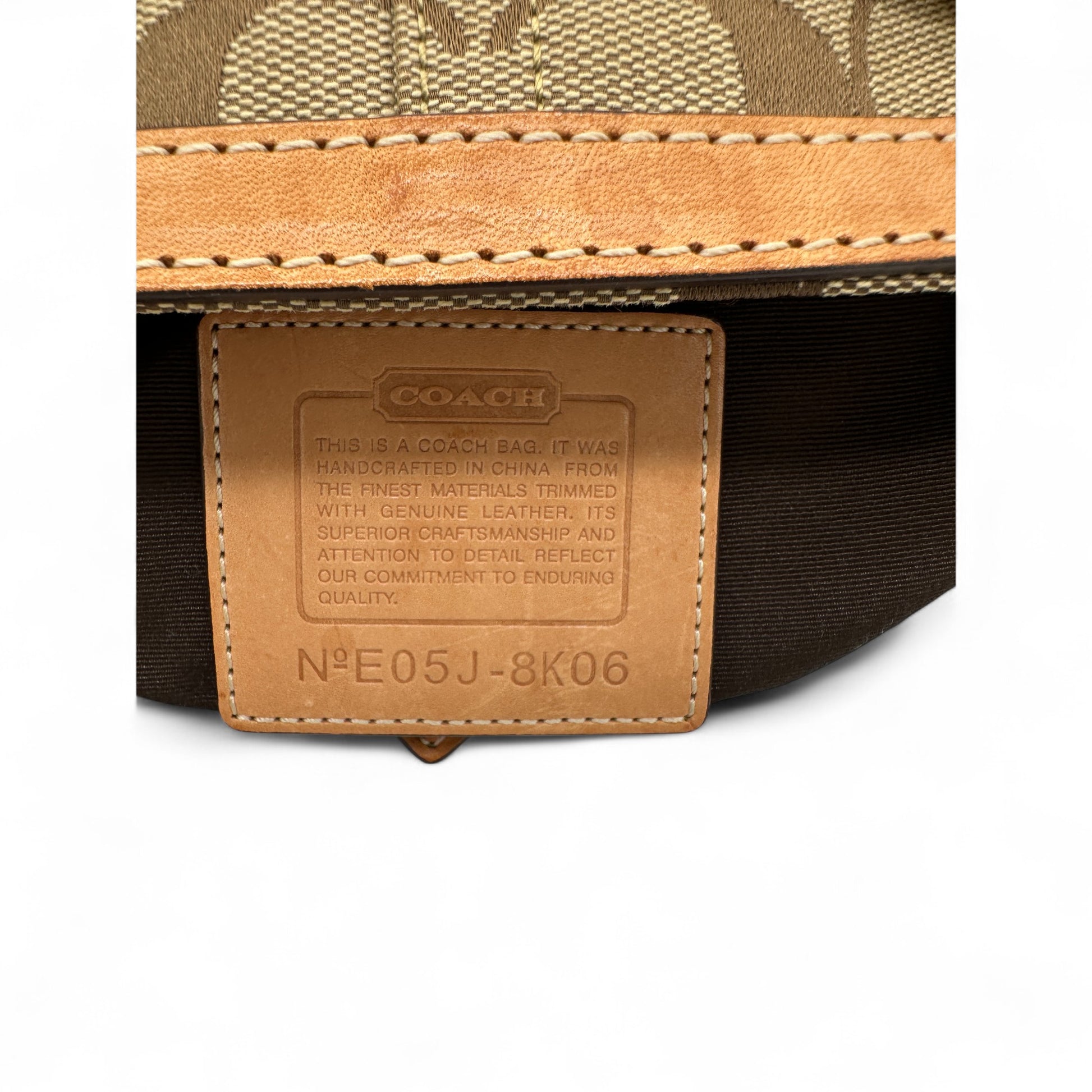 Vintage Coach 8K06 Hampton Clip Handbag. In brown and beige signature monogram with brown leather trim and silver hardware. Vintage Coach tote bag from 2005.