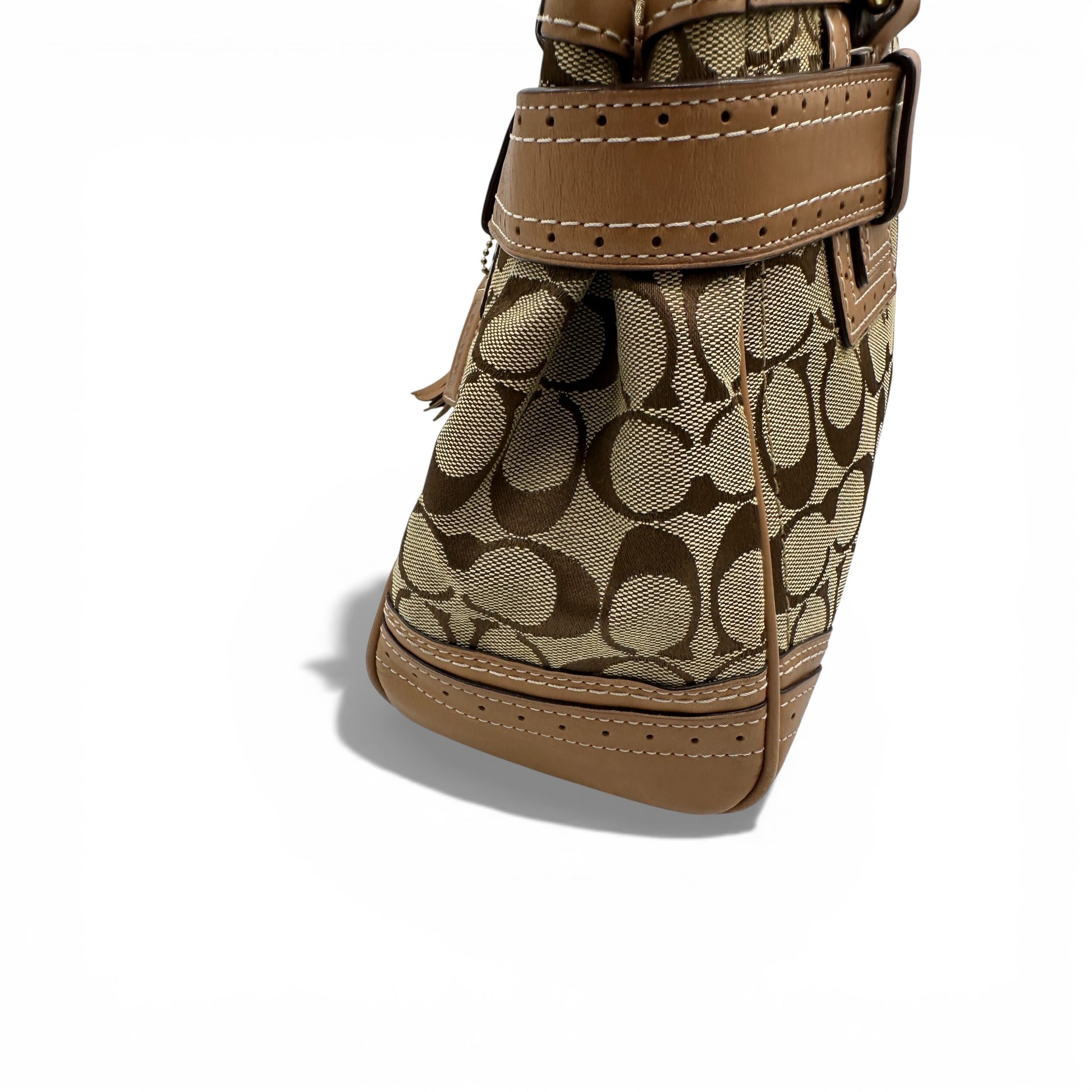 Vintage Coach F10507 Hamptons Clip Handbag. In brown and beige signature monogram, trimmed with tan leather and brass horsebit clip hardware and tassel accent. A Y2K piece from 2011.