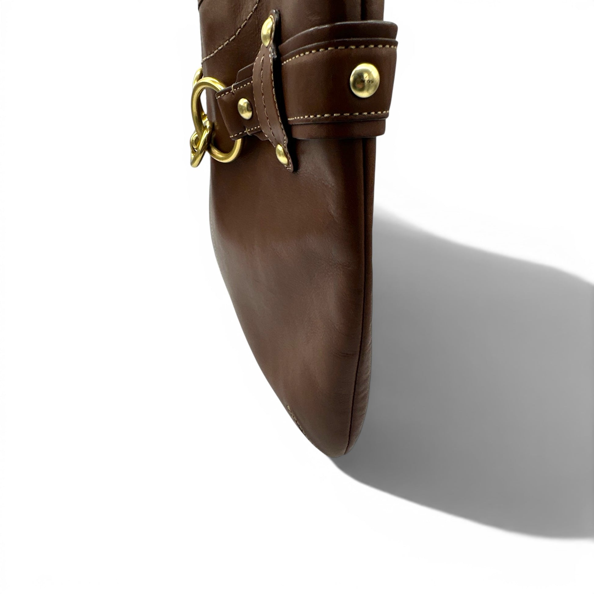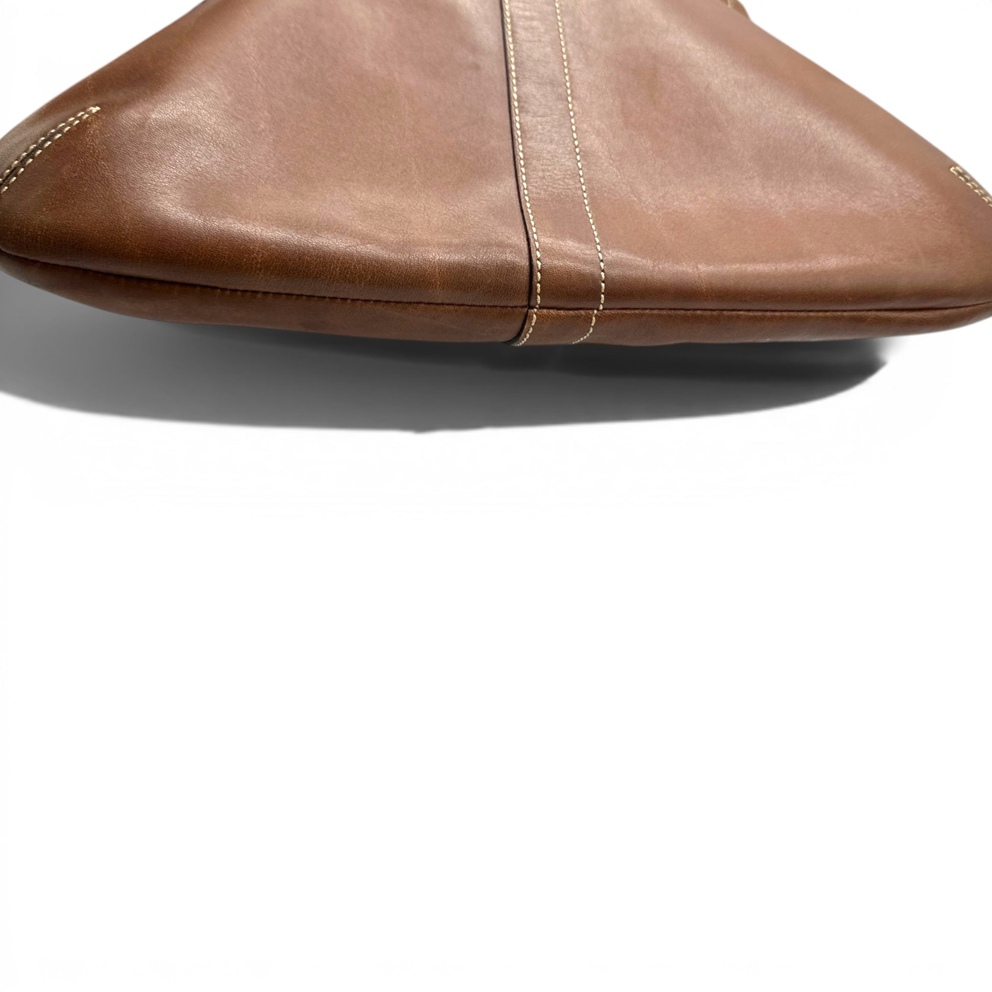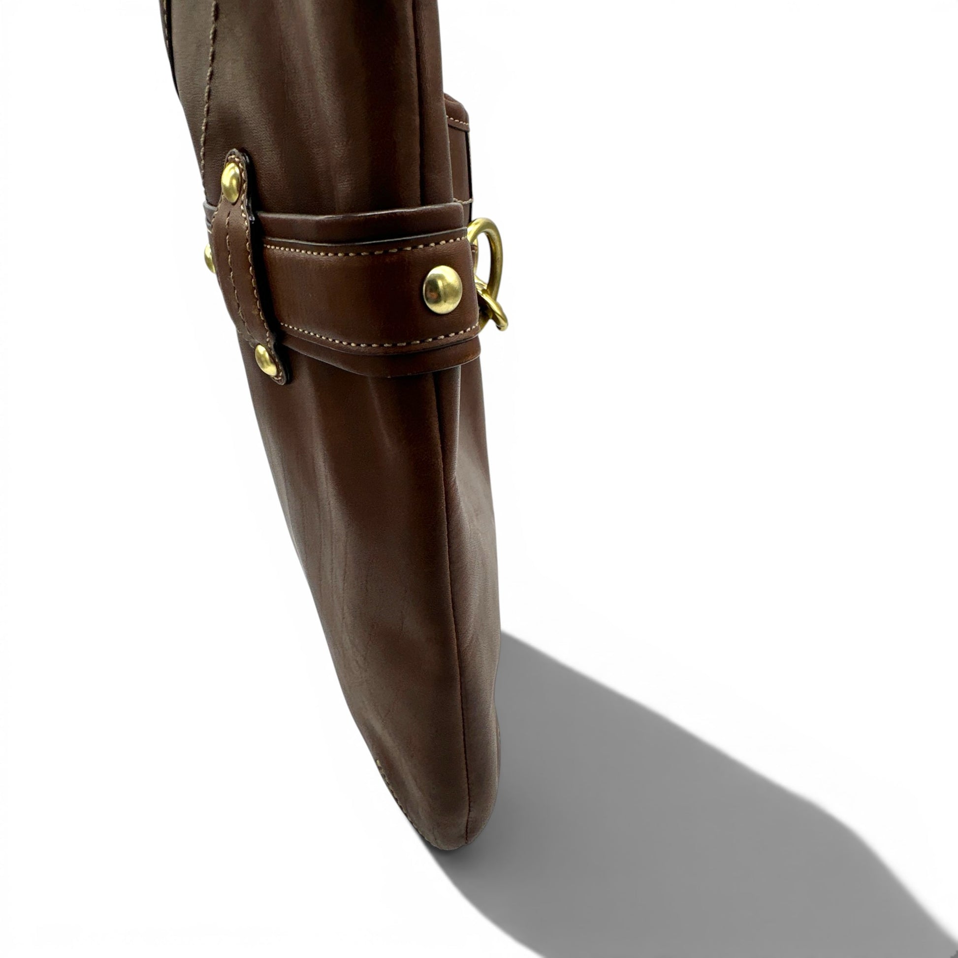 Vintage Coach F11266 Horsebit Tote Shoulder Bag. In brown natural glove-tanned cowhide leather, with brass gold-tone horsebit buckle and belt detailing, with brass stud accents. A comfortable wear on the shoulder or as a handbag. A Y2K piece from 2008.