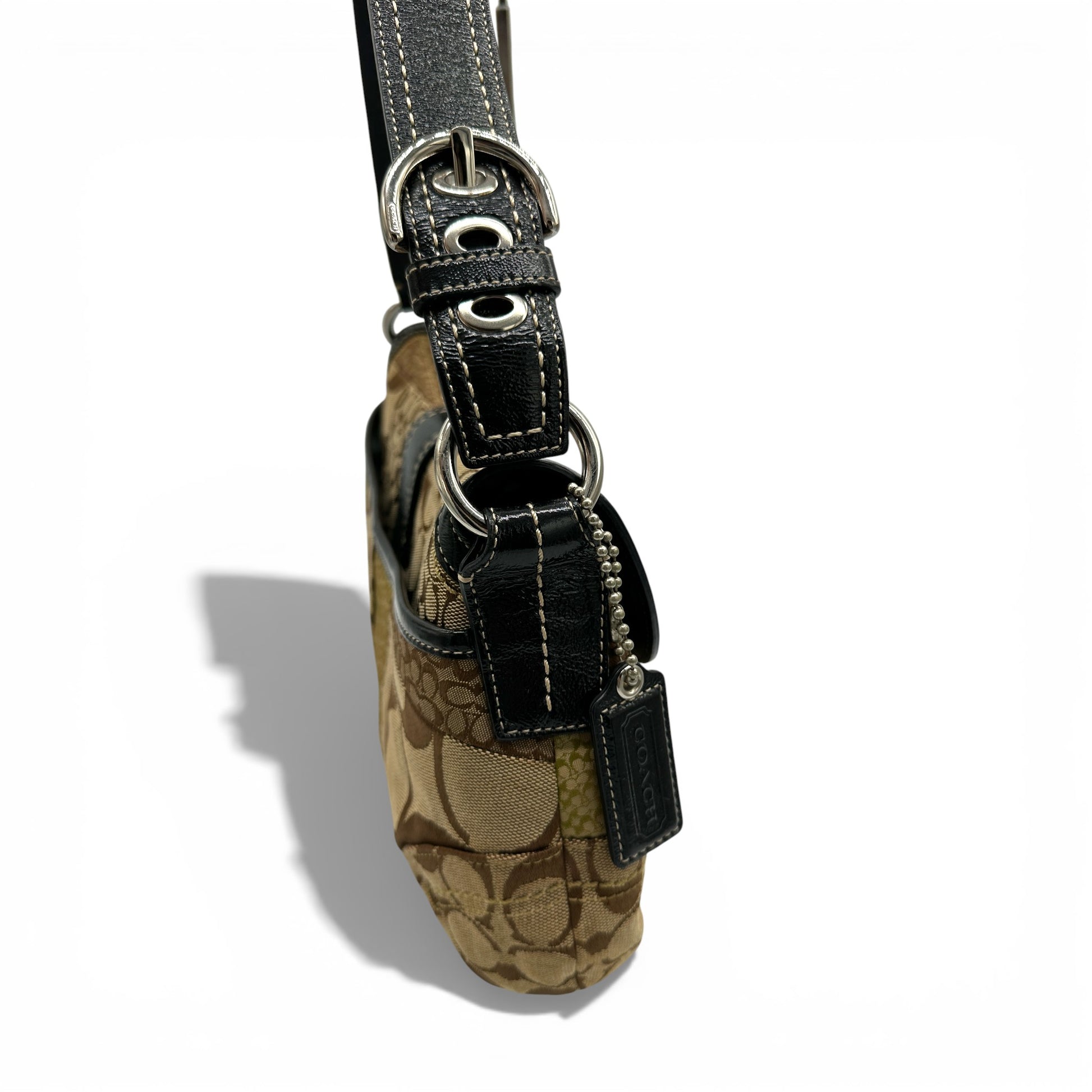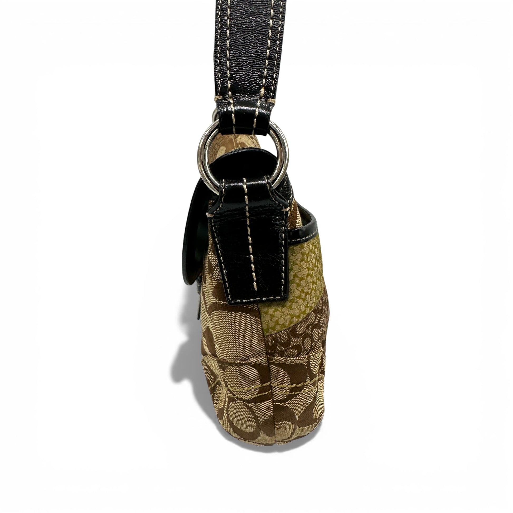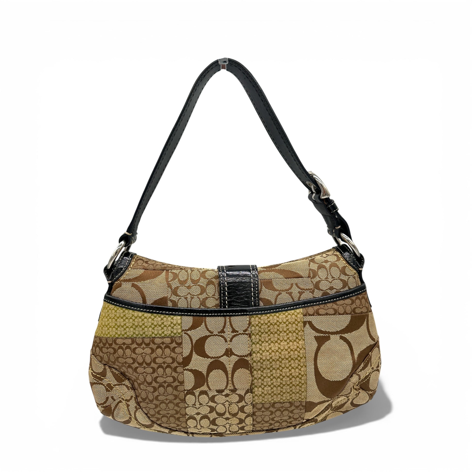 Vintage Coach F12316 Soho Shoulder Bag. In brown, beige and khaki patchwork and monogram, trimmed with black patent leather trim and silver-tone Soho buckle hardware. A Y2K piece from 2008.