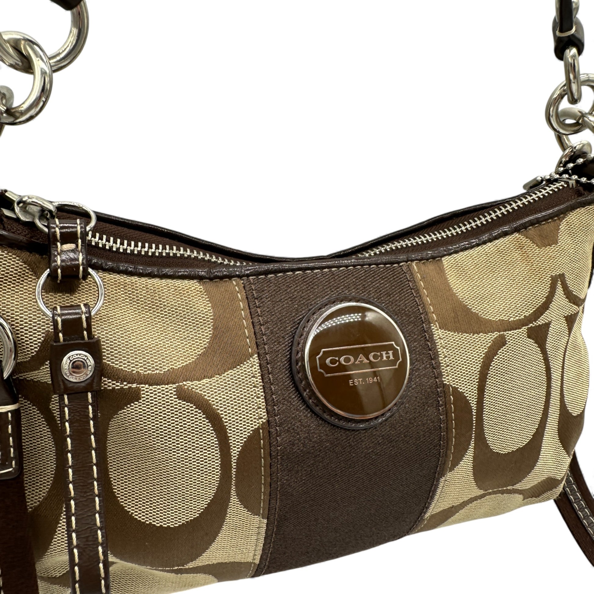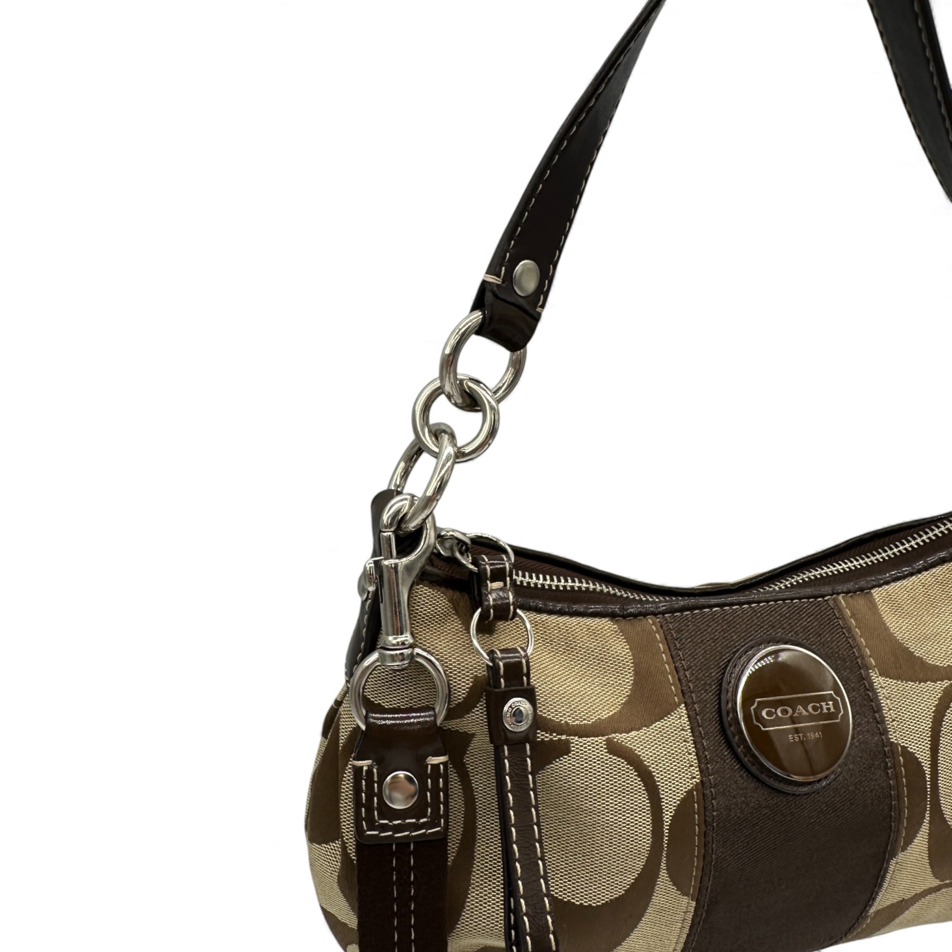 Model and style: Vintage Coach F15111 Shoulder Bag. In brown and beige signature monogram canvas, with brown patent leather trim and silver hardware and a detachable longer strap. A Y2K piece from 2010.