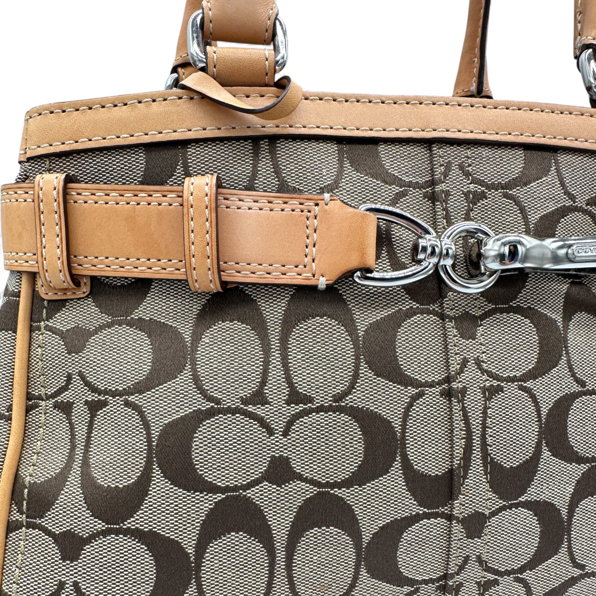 Vintage Coach FS8K06 Hampton Clip Handbag. In brown and beige signature monogram with tan leather trim and silver-tone horsebit clip hardware. A Y2K piece from 2008.
