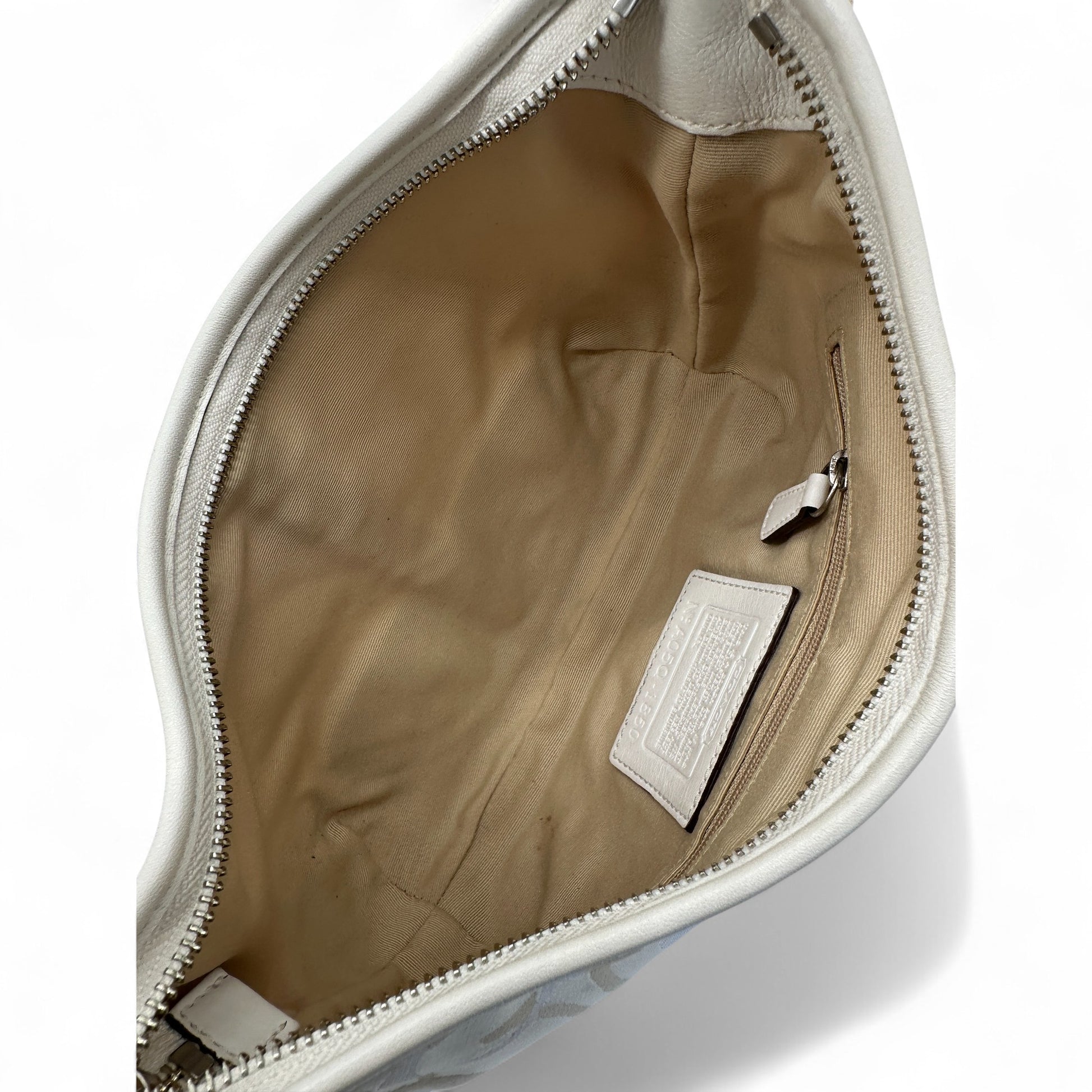 Sac bandoulière Coach 1850 vintage blanc à monogramme Optic. Garniture en cuir blanc et boucle Soho argentée, une pièce emblématique des années 2000 (2005).