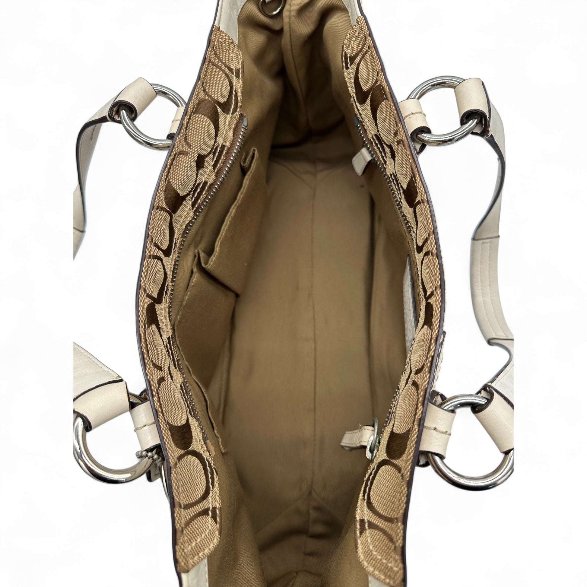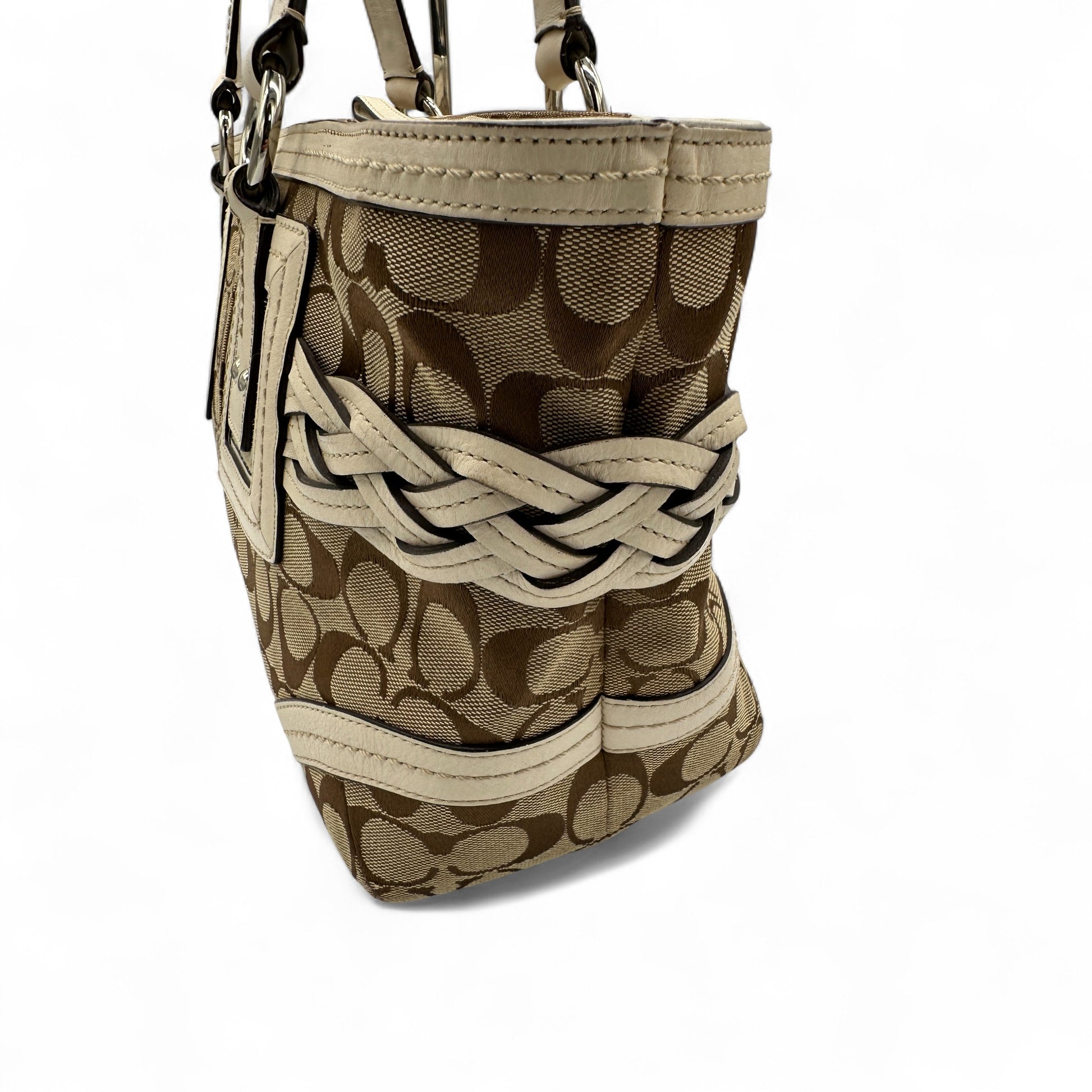 Sac bandoulière Coach 5089 Monogram vintage avec finitions en cuir tressé crème et boucle décorative. Un cabas spacieux Coach Soho de 2006, pouvant se porter à la main ou à l'épaule.