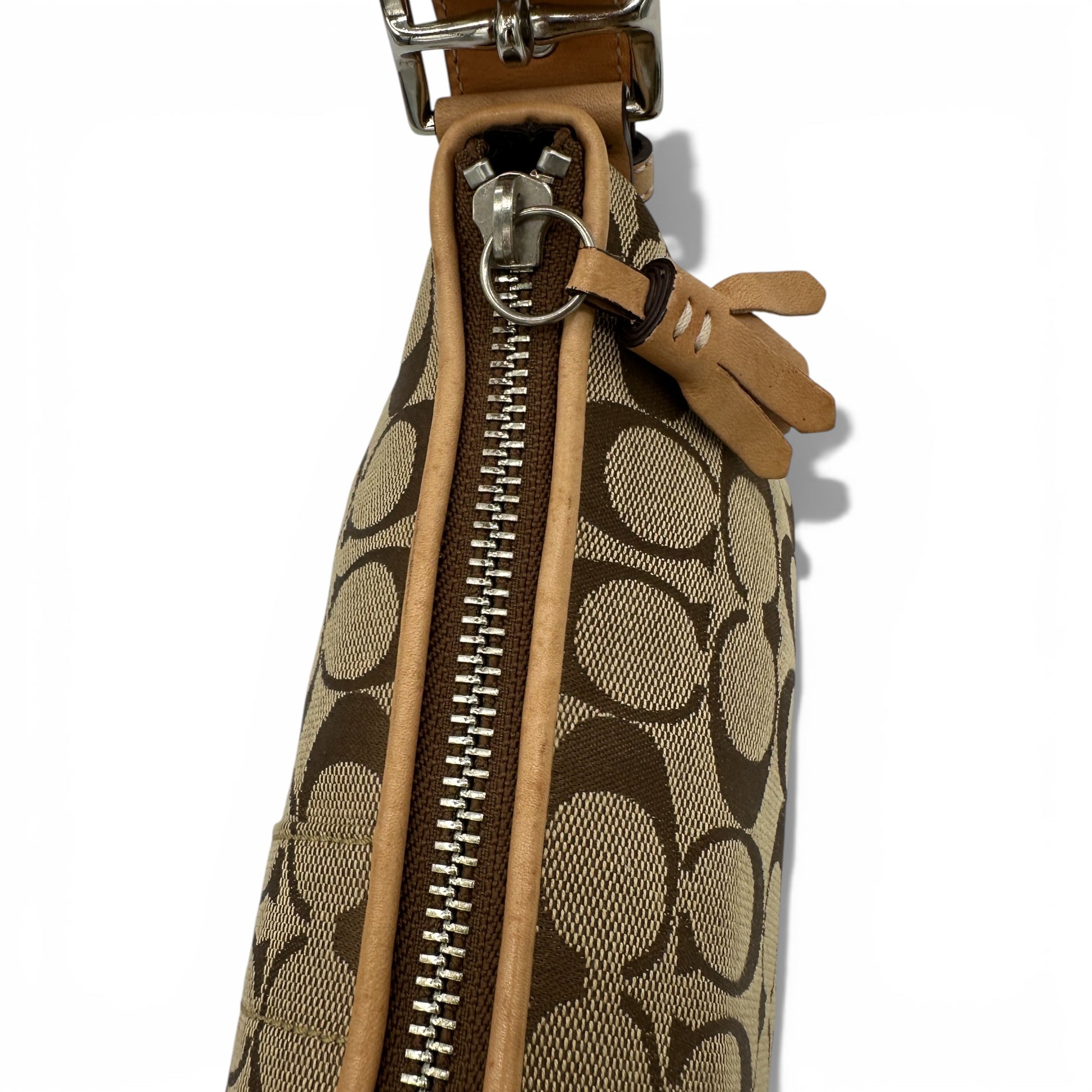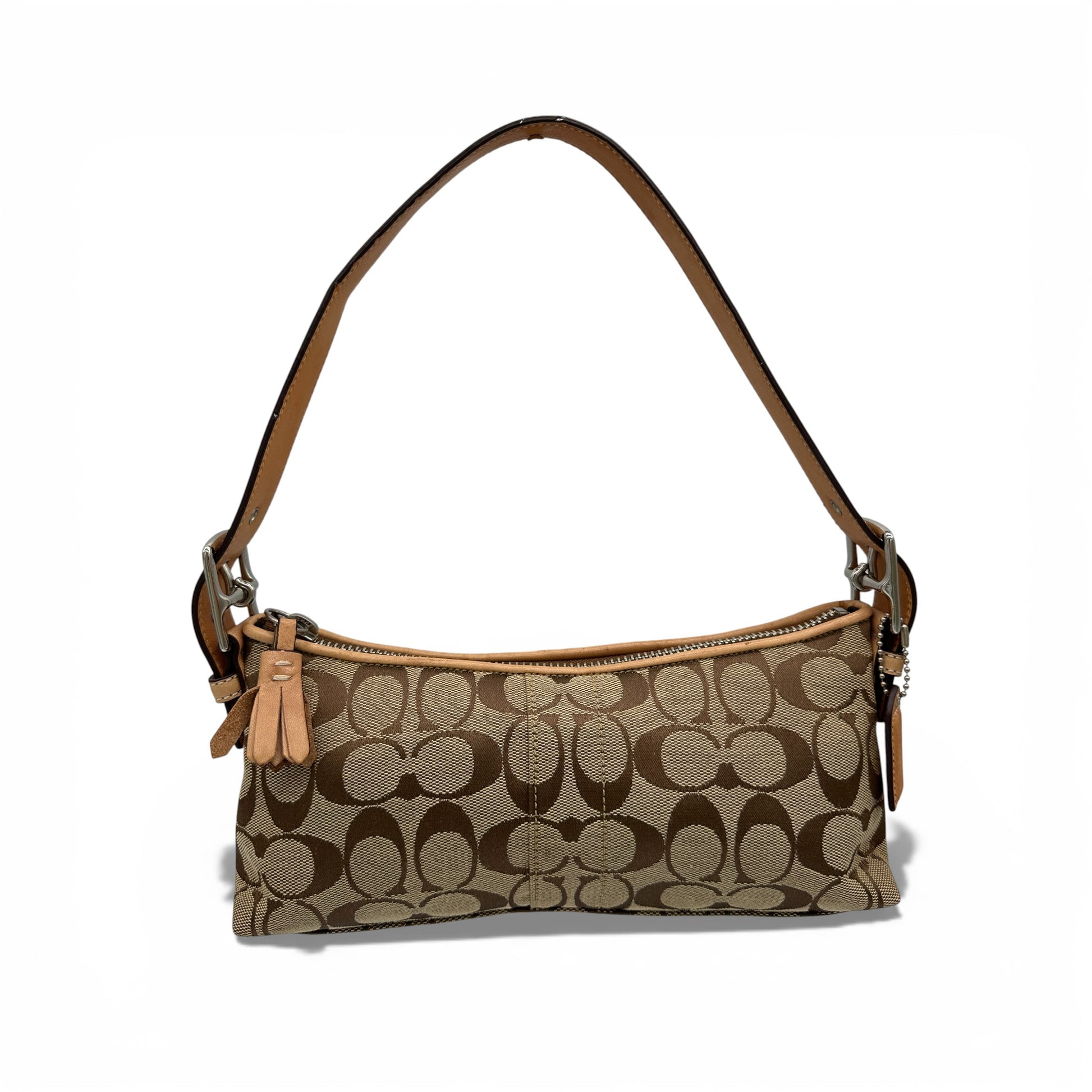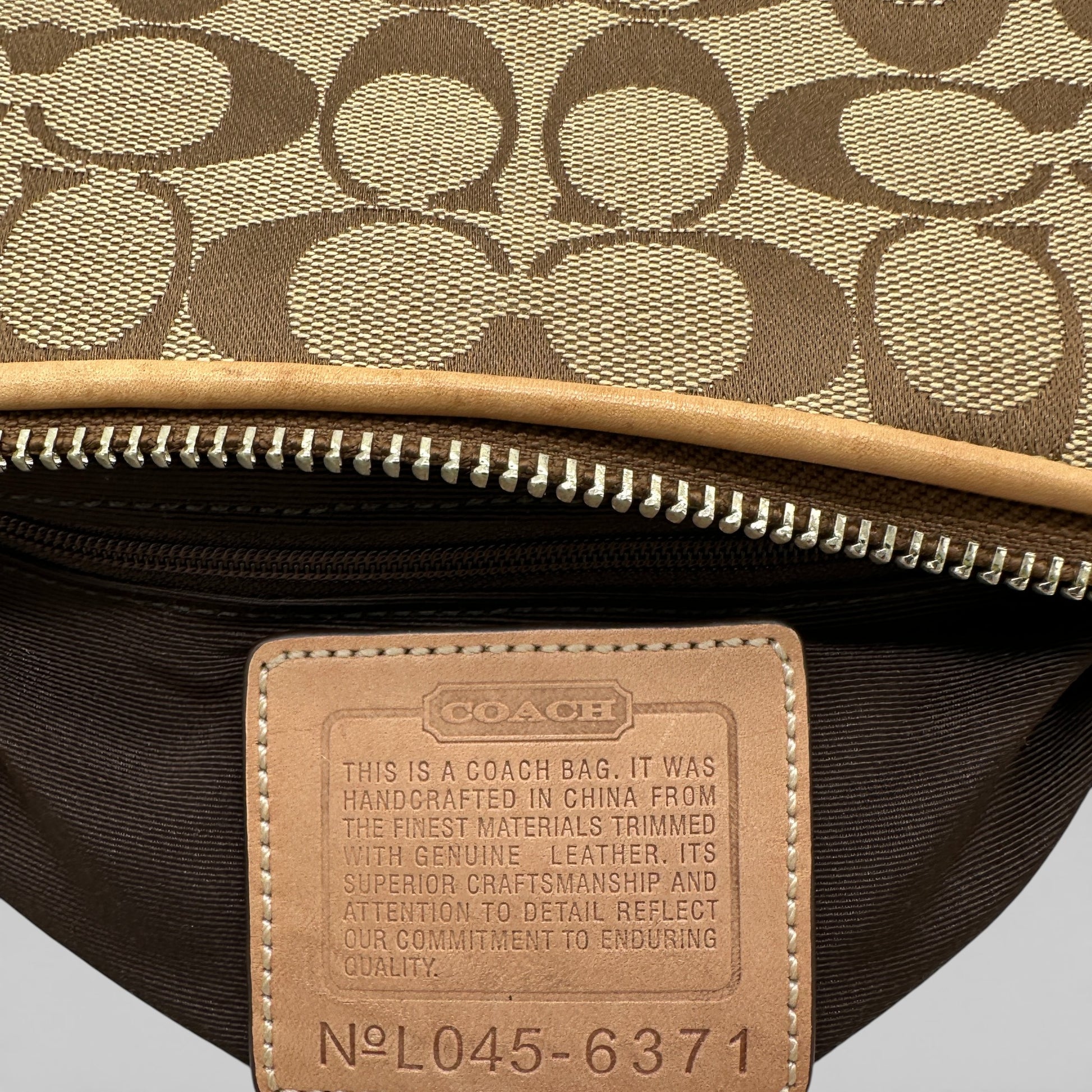 Sac bandoulière Baguette Coach 6371 vintage. En cuir marron et beige à monogramme emblématique, finitions en cuir marron clair et détails argentés. Pièce iconique des années 2000 (2004).
