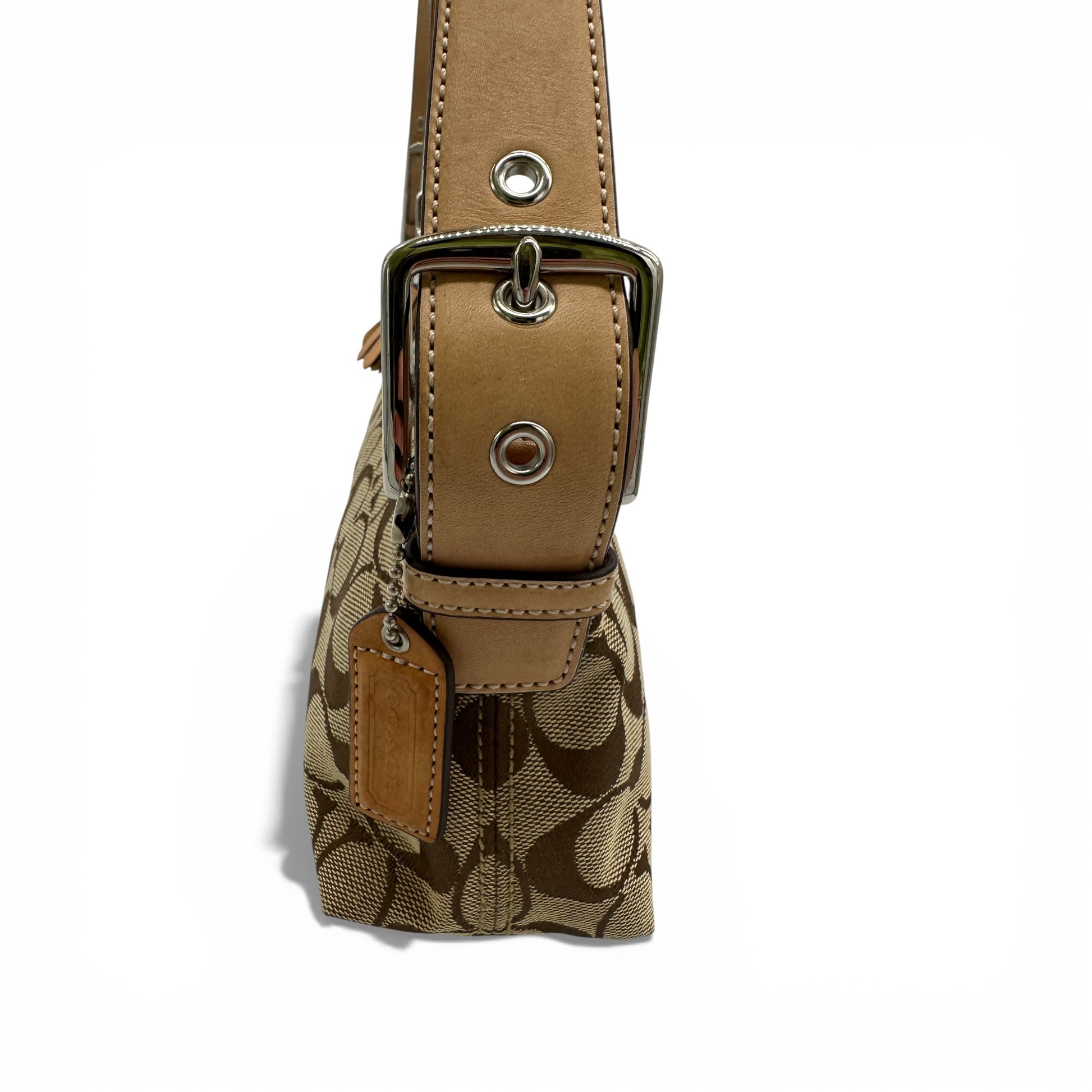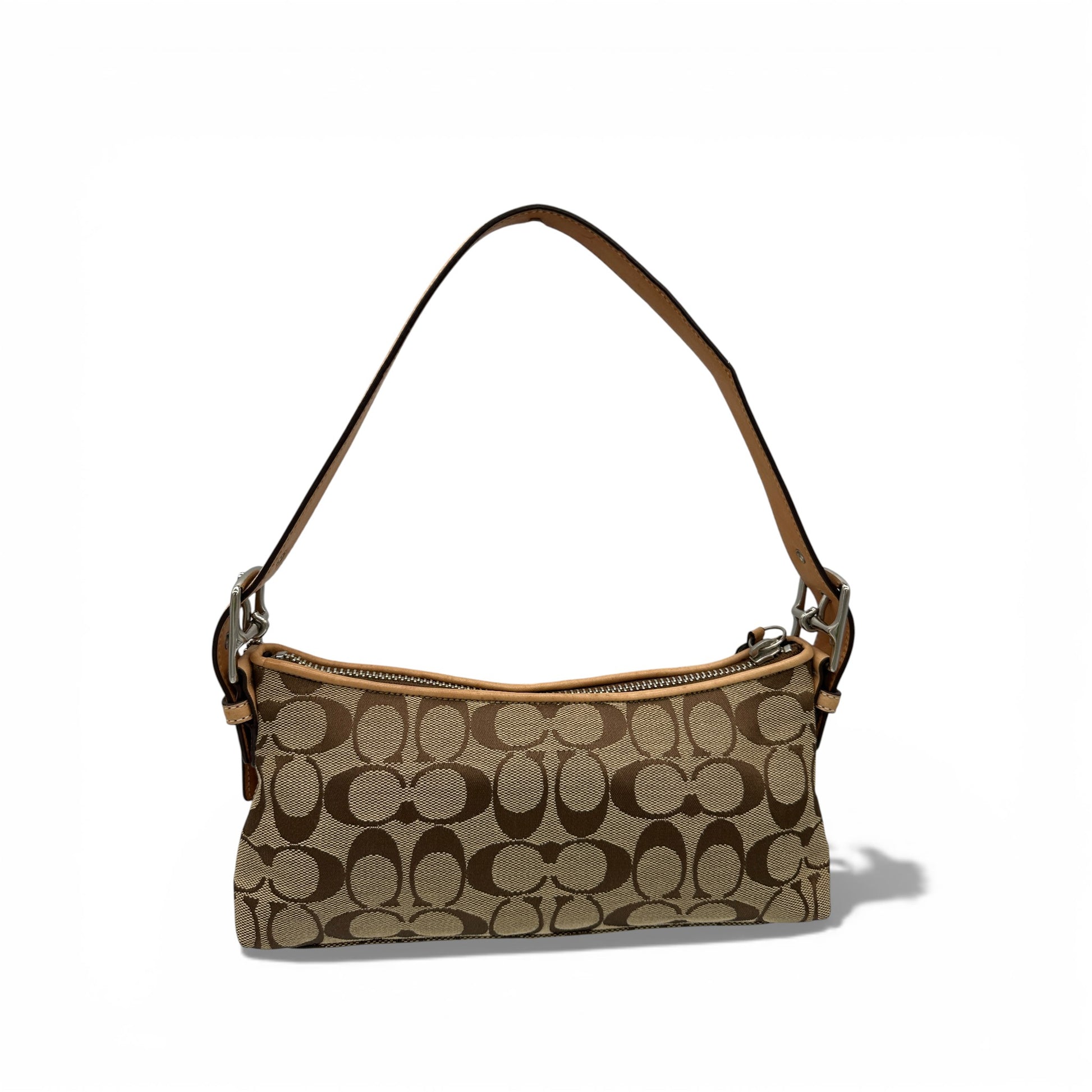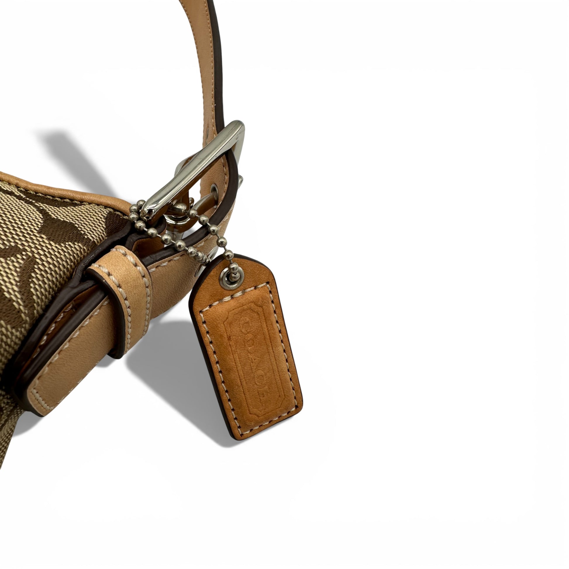 Sac bandoulière Baguette Coach 6371 vintage. En cuir marron et beige à monogramme emblématique, finitions en cuir marron clair et détails argentés. Pièce iconique des années 2000 (2004).