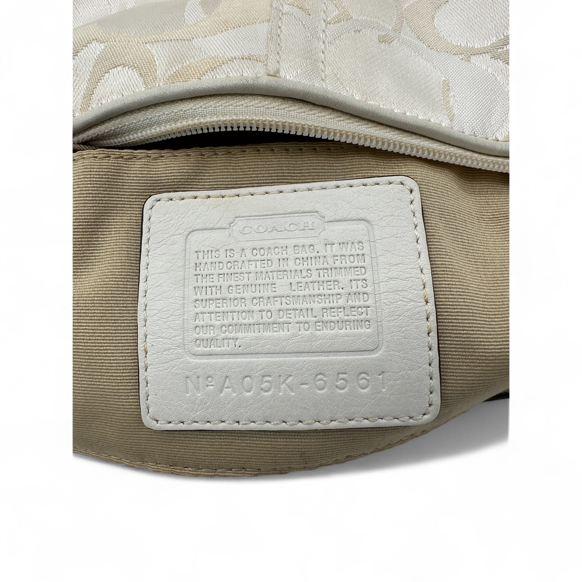 Modèle et style : Sac bandoulière Coach Optic Monogram vintage. Ce mini sac bandoulière est en toile monogrammée blanche, orné de cuir blanc. Un modèle qui épouse parfaitement l’épaule. Une pièce emblématique des années 2000 (Y2K) datant de 2005.