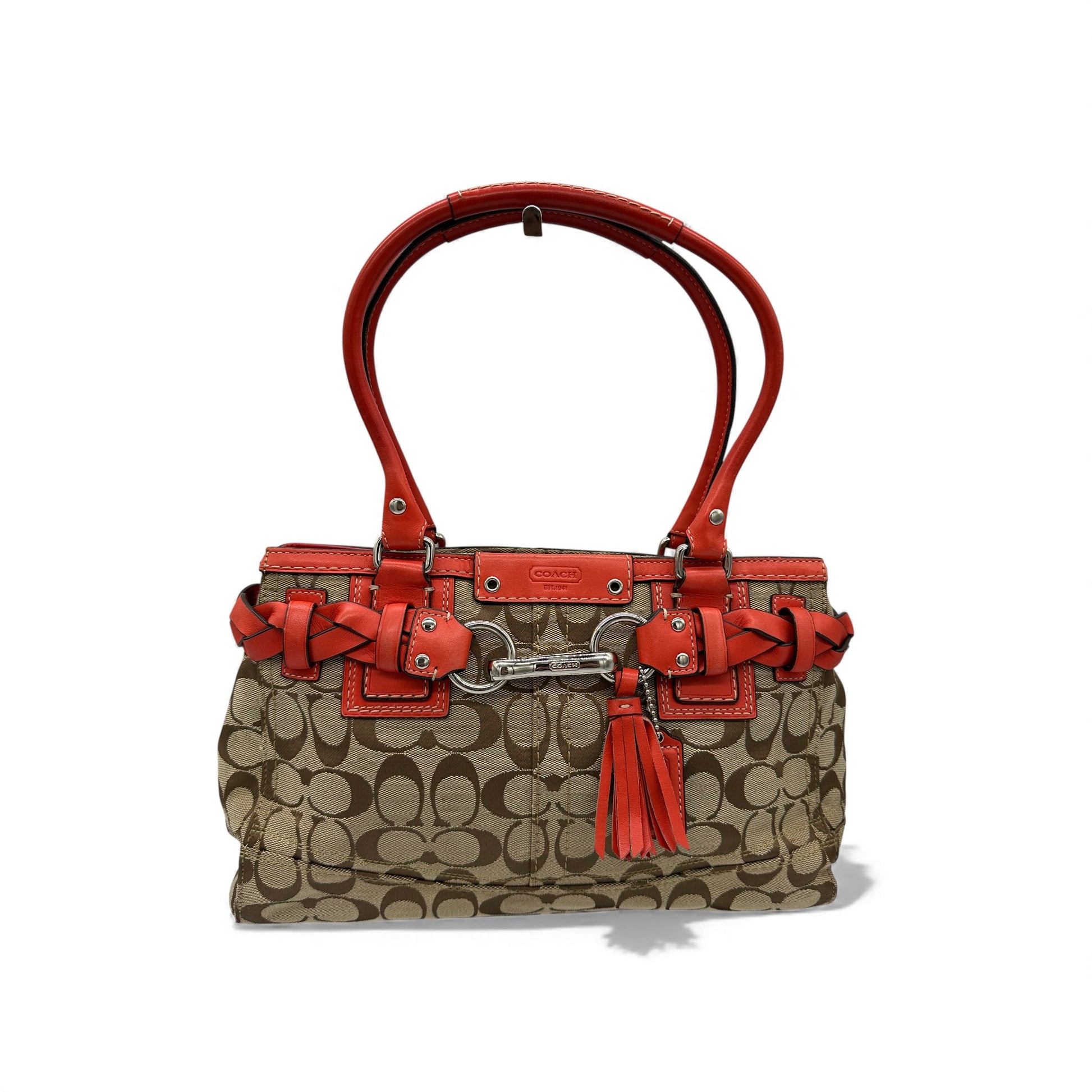 Sac à main vintage Coach F13065 Hampton Clip en cuir beige monogrammé, finitions en cuir rouge et détails argentés. Pièce emblématique des années 2000 (2009).