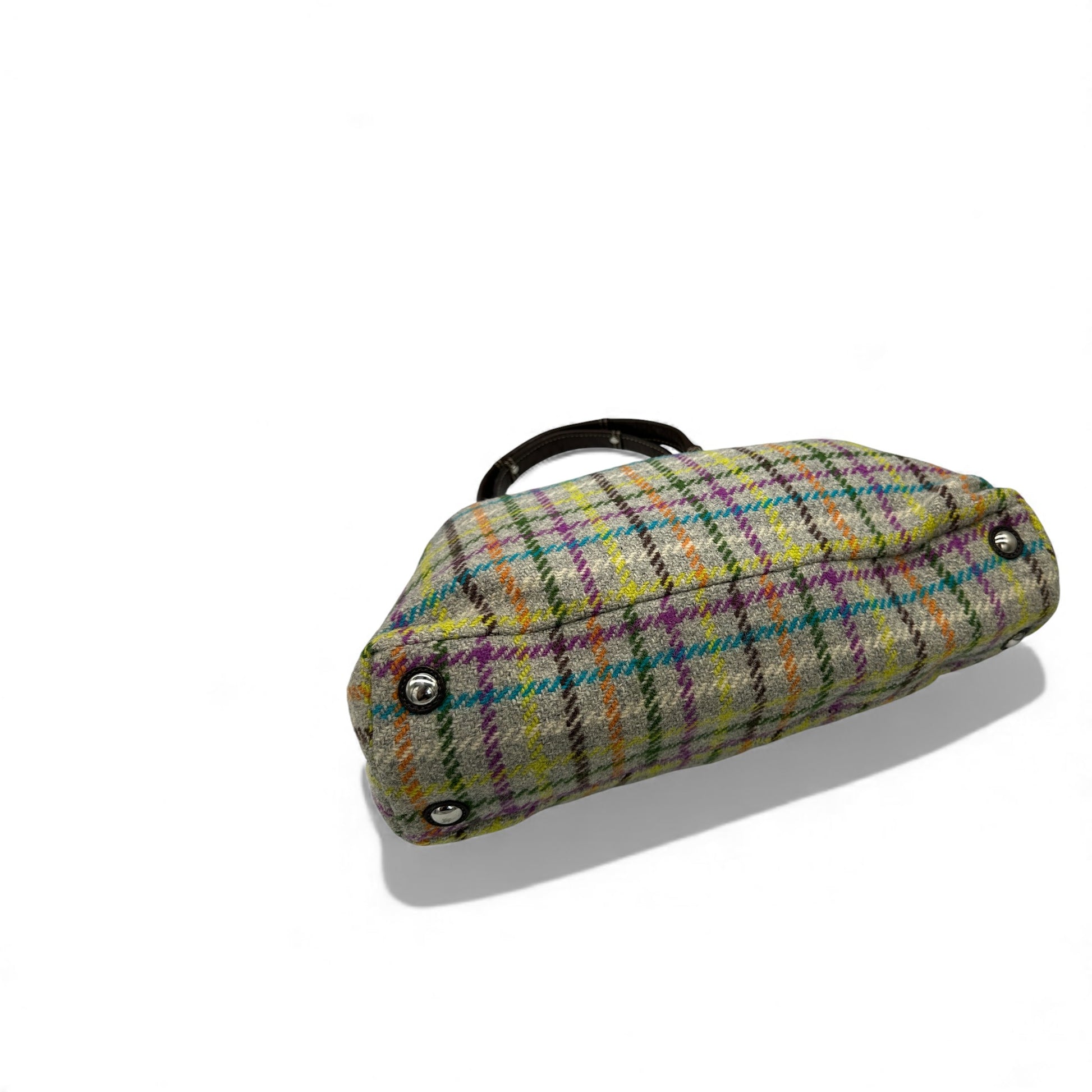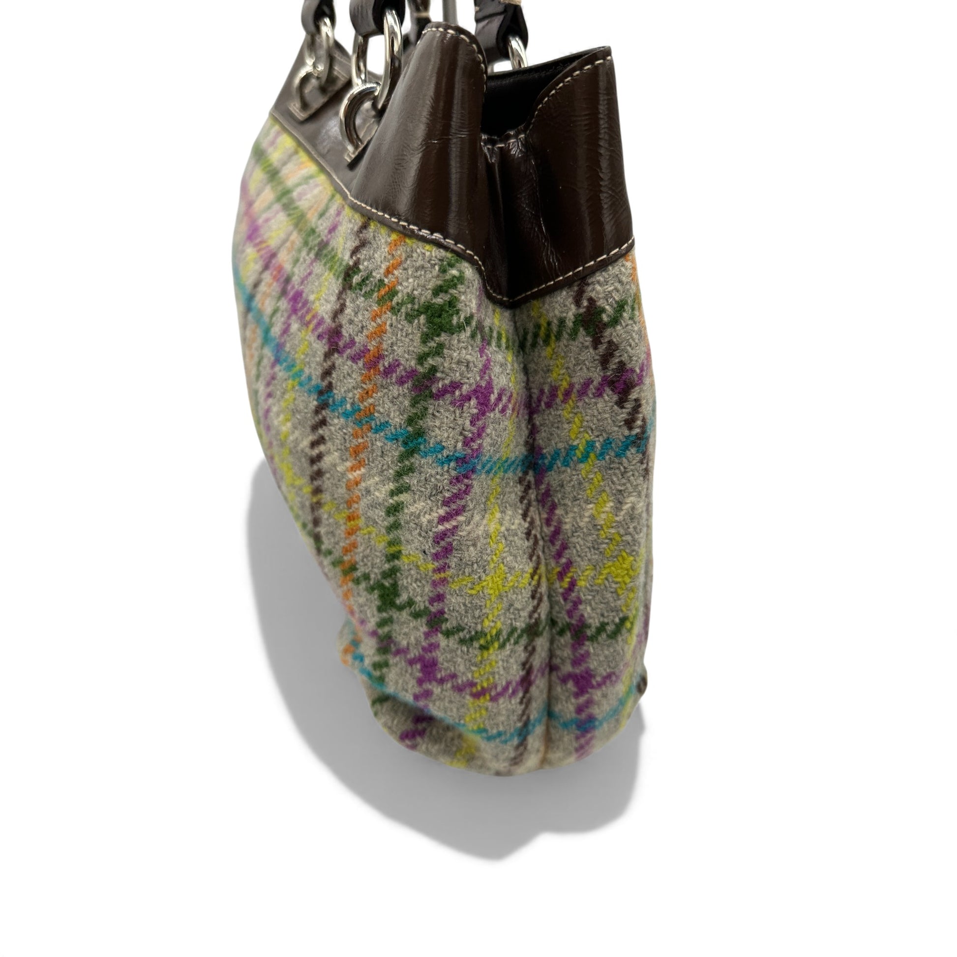 Sac cabas vintage Coach Penelope F15456 en tweed gris, violet et vert, orné de finitions en cuir verni marron foncé et de détails argentés. Un modèle Coach spacieux, idéal pour ranger vos essentiels du quotidien et un ordinateur portable. Une pièce emblématique des années 2000 (2010).
