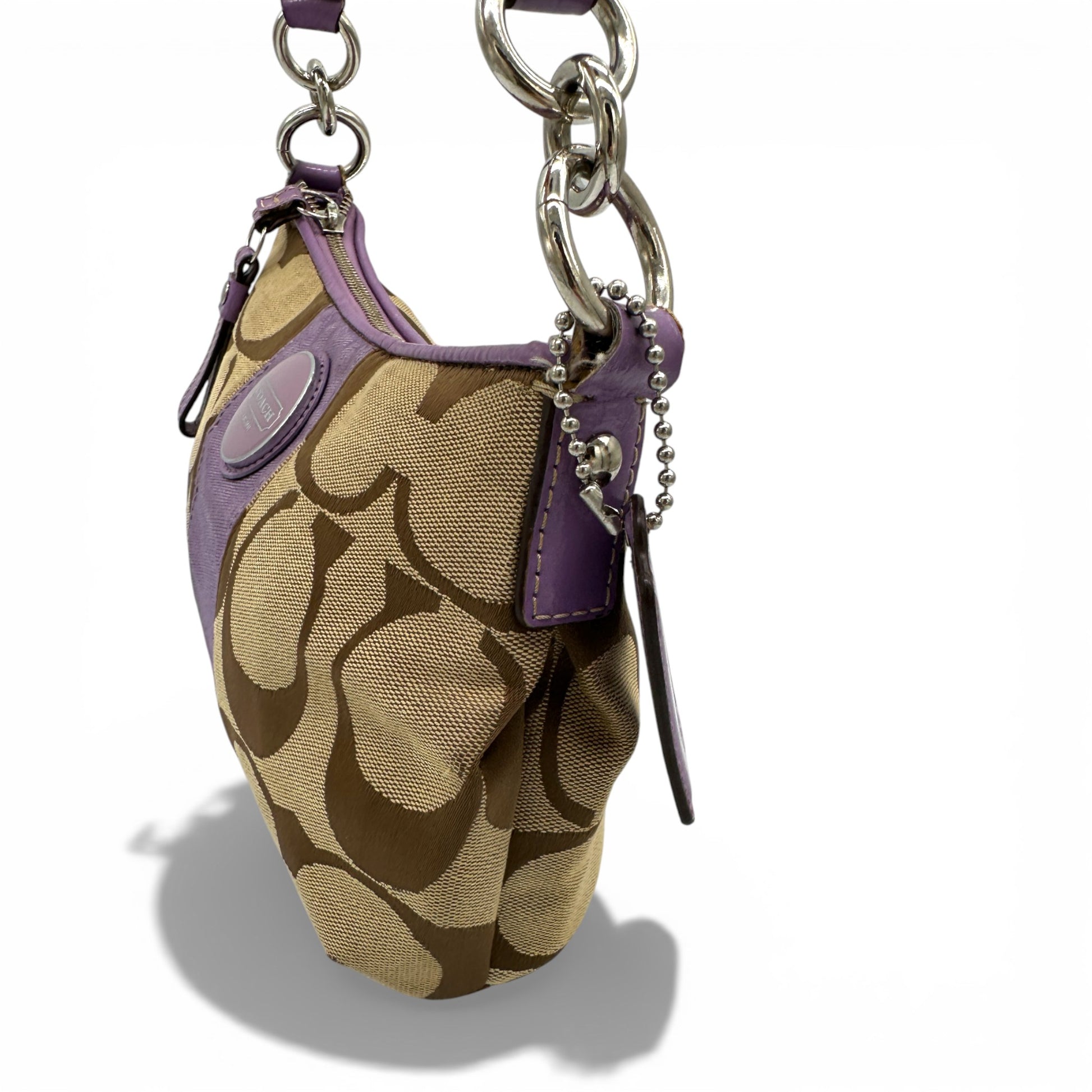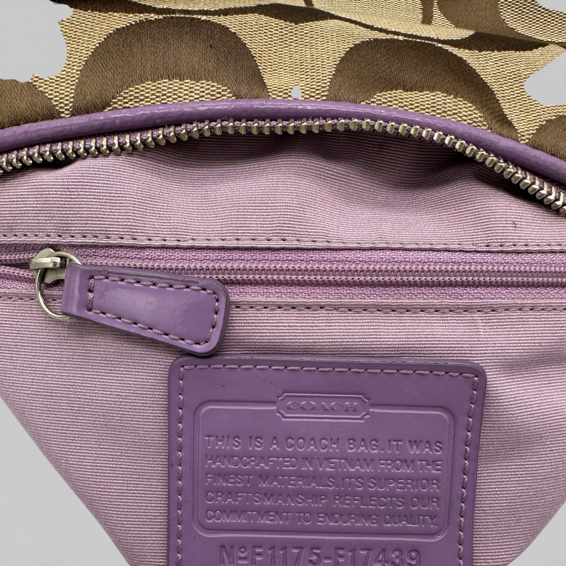 Modèle et style : Sac bandoulière Coach F17439 vintage. En toile monogrammée emblématique marron et beige, avec finitions en cuir verni marron et détails argentés. Porté épaule ou croisé grâce à sa bandoulière amovible.