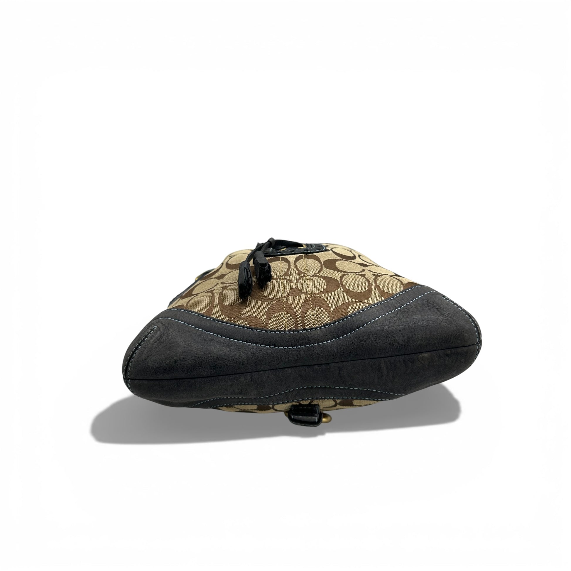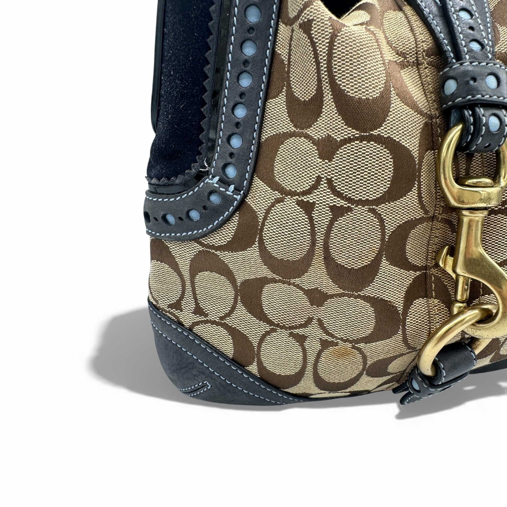 Sac bandoulière Coach 1424 Hampton à clip, modèle vintage. En cuir et daim bleu marine et bleu marine, orné du monogramme signature marron et beige, et doté d'une fermeture à clip en laiton en forme de mors Hampton. Détails perforés et bandoulière ajustable.