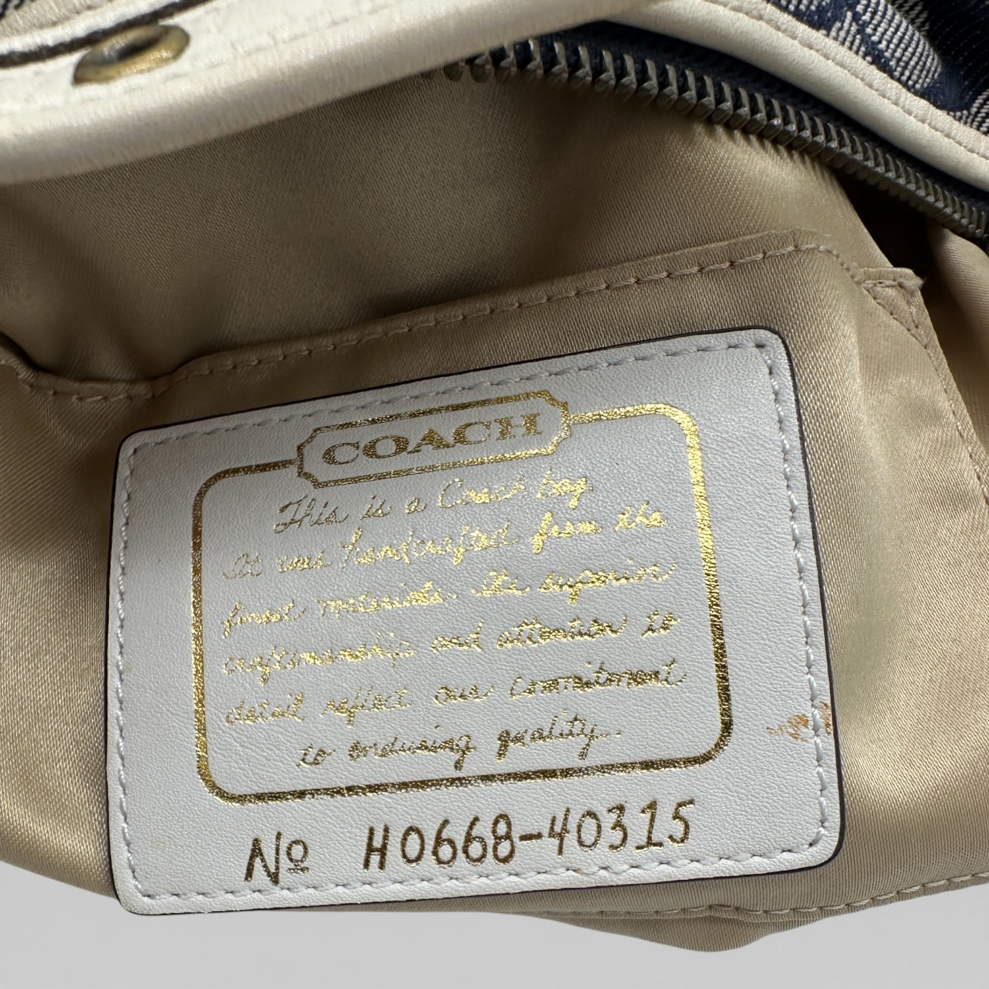Sac bandoulière Coach Mini Legacy vintage (réf. 40224). En cuir marron et beige à monogramme emblématique, orné de finitions en cuir blanc et d'un fermoir tourniquet en laiton. Ce rare mini sac Legacy, issu de la collection du 65e anniversaire de Coach, comprend un compartiment avant à fermoir tourniquet et un compartiment principal zippé, doublé de satin rayé.