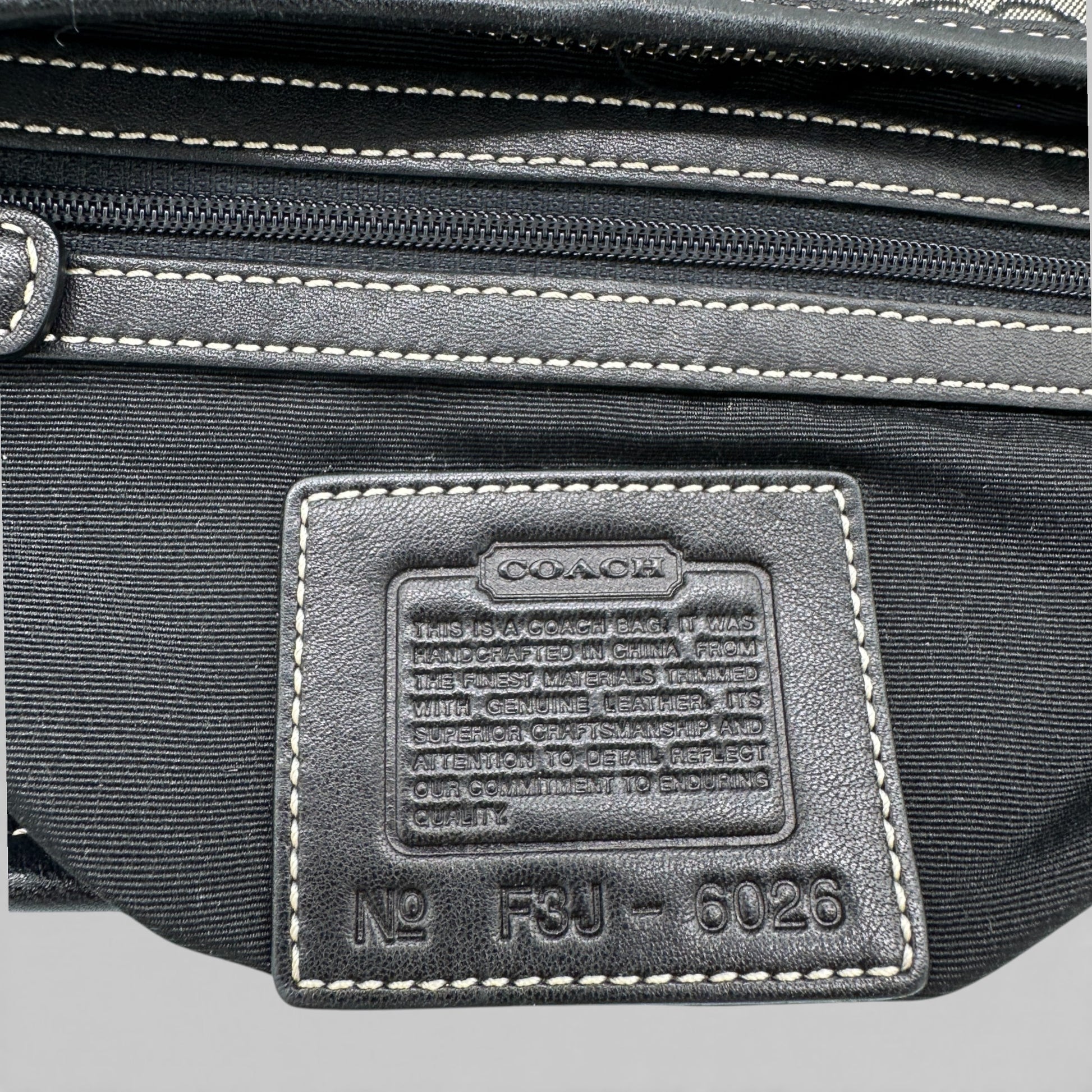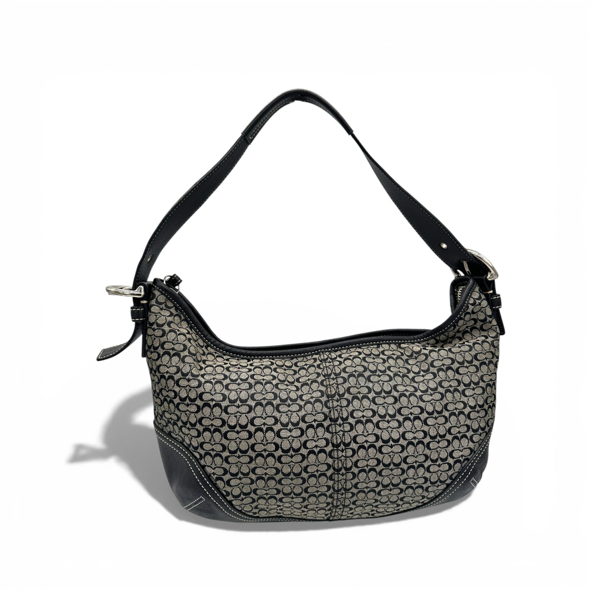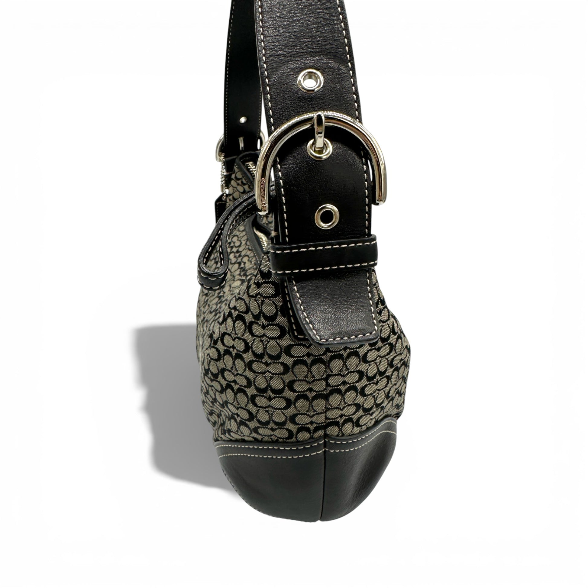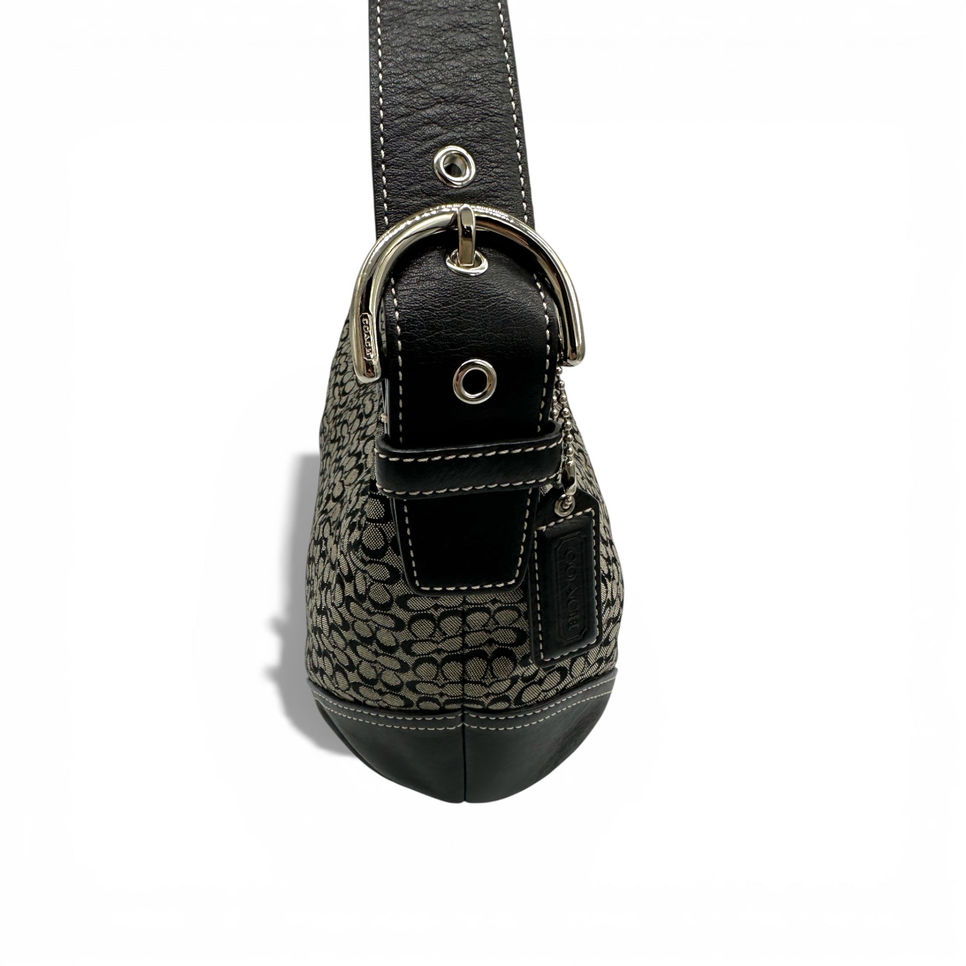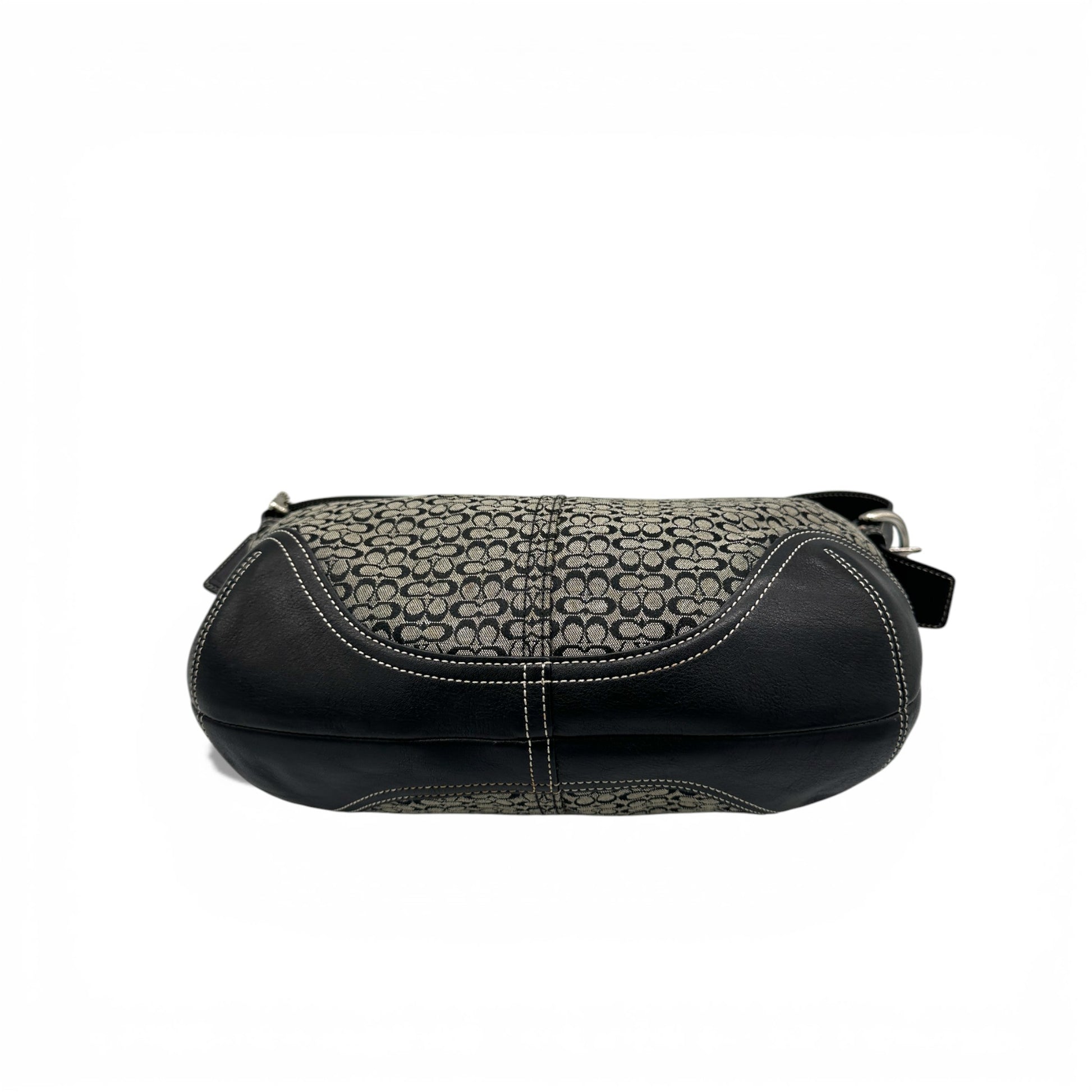 Sac bandoulière Coach 6026 Croissant Soho vintage. En toile monogrammée noire et grise, orné de cuir noir et d'une boucle Soho argentée. Pièce emblématique des années 2000 (2003).