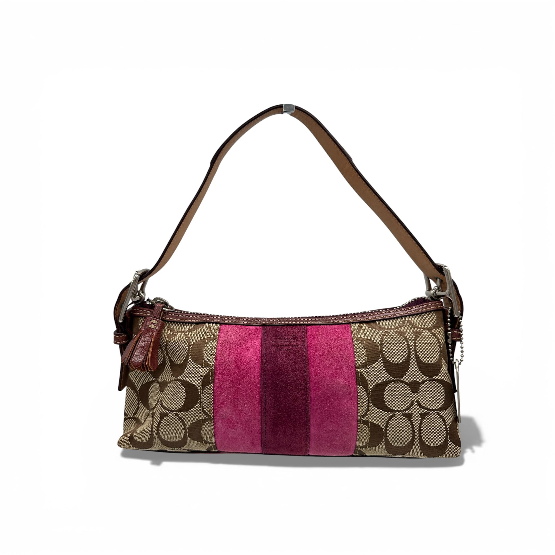 Sac bandoulière Coach 7039 East West Baguette vintage. Modèle monogrammé marron et beige avec empiècements rayés en daim marron et finitions en cuir verni marron foncé. Pièce emblématique des années 2000 (2004).