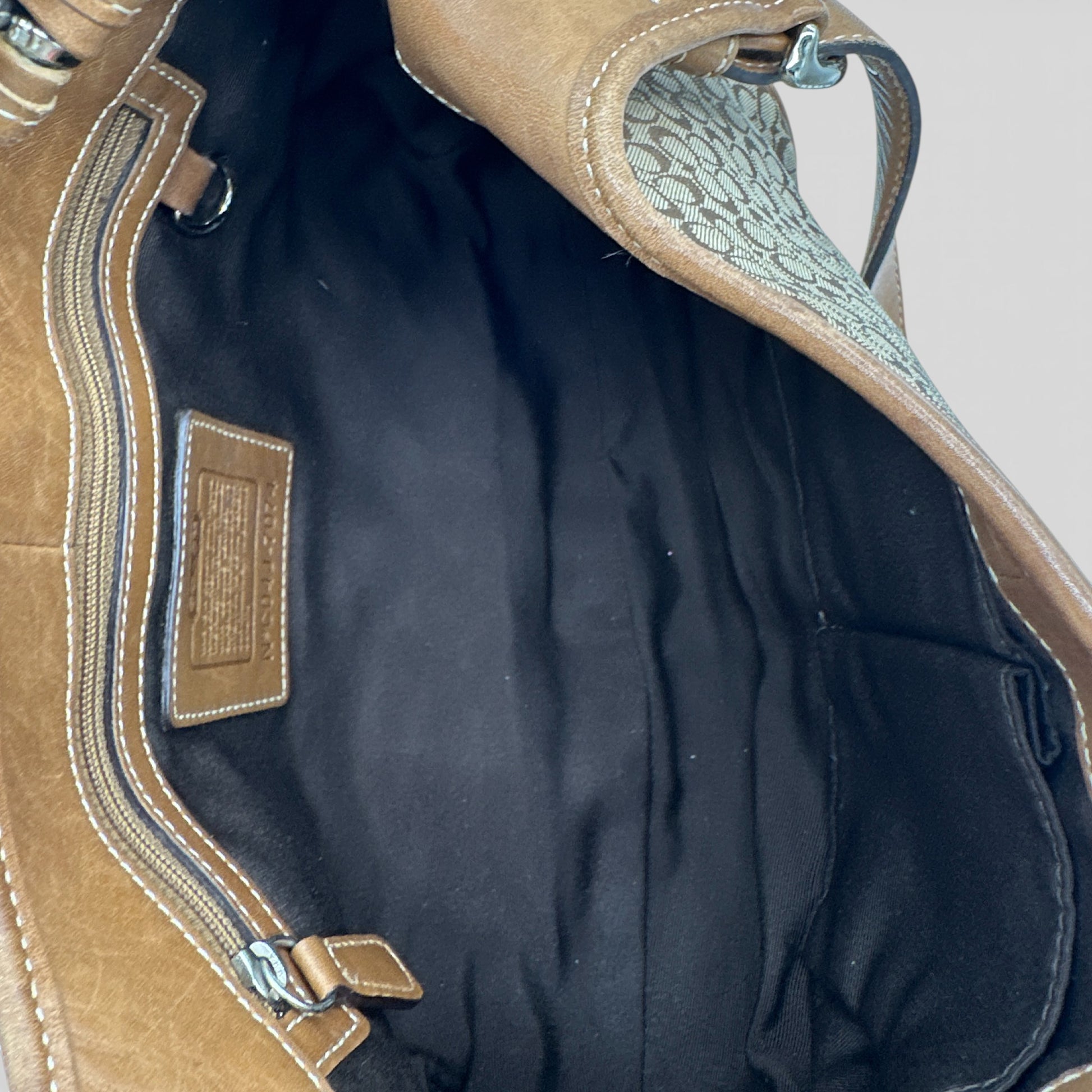 Sac bandoulière Coach 7074 Soho vintage. Modèle à mini-monogramme marron et beige, finitions en cuir beige et boucle argentée. Pièce emblématique des années 2000 (2004).