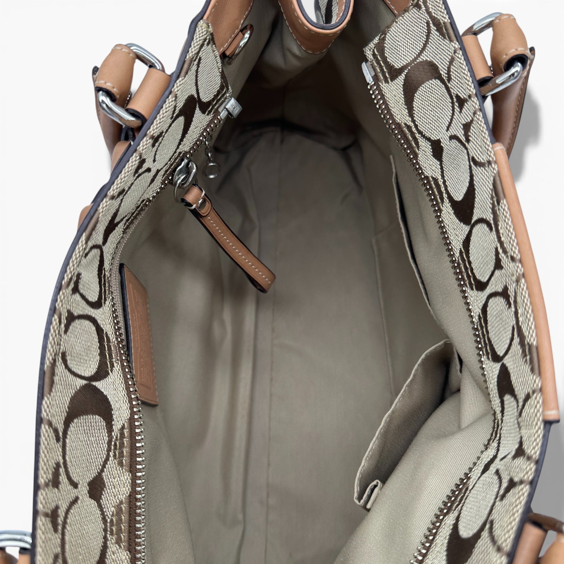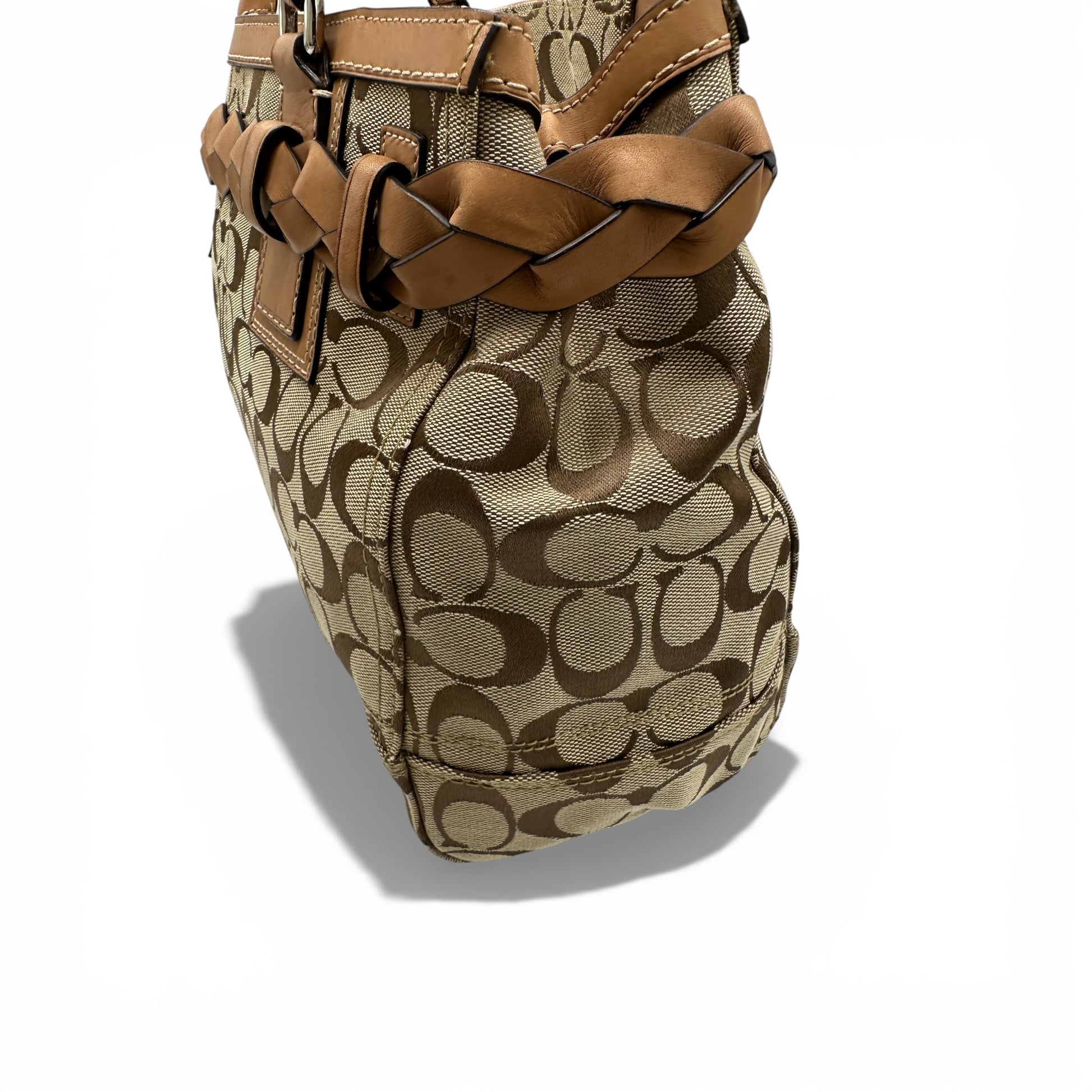 Modèle et style : Sac à main vintage Coach F13068 Hampton Clip, en cuir monogrammé emblématique, finitions en cuir beige et détails métalliques argentés. Pièce emblématique des années 2000 (2009).