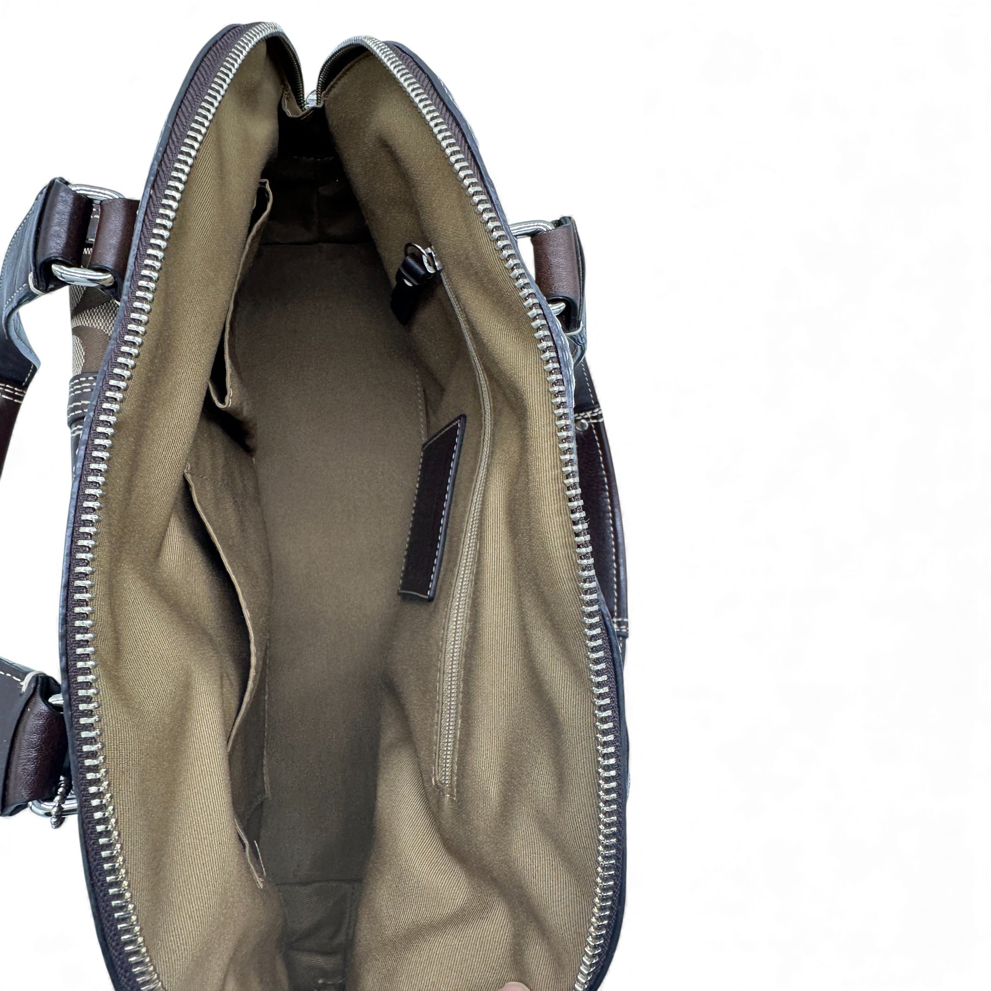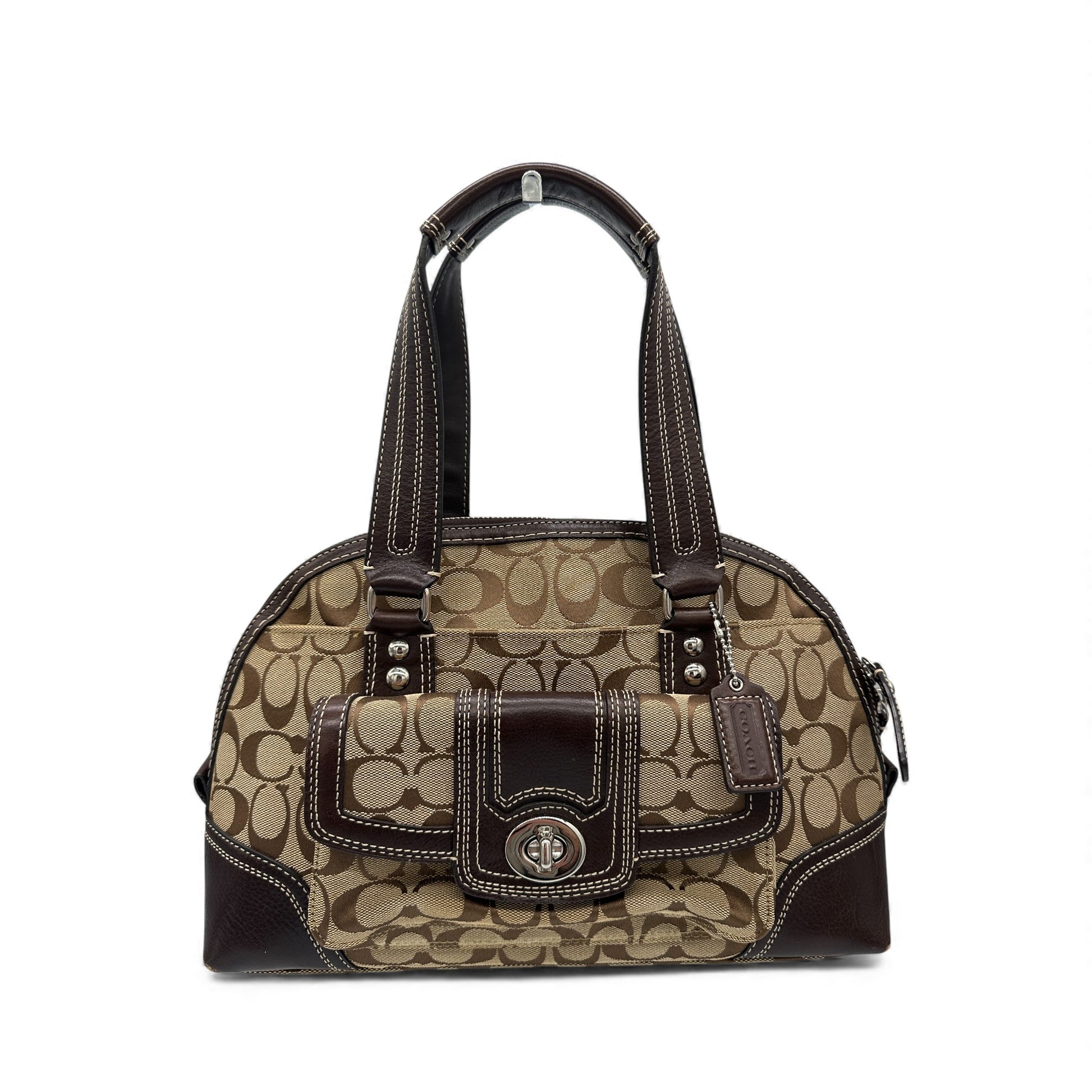 Sac à main vintage Coach F13977 Miranda Turnlock en cuir beige monogrammé signature avec garniture en cuir marron foncé et fermoir tournant argenté, une pièce Y2K de 2009.