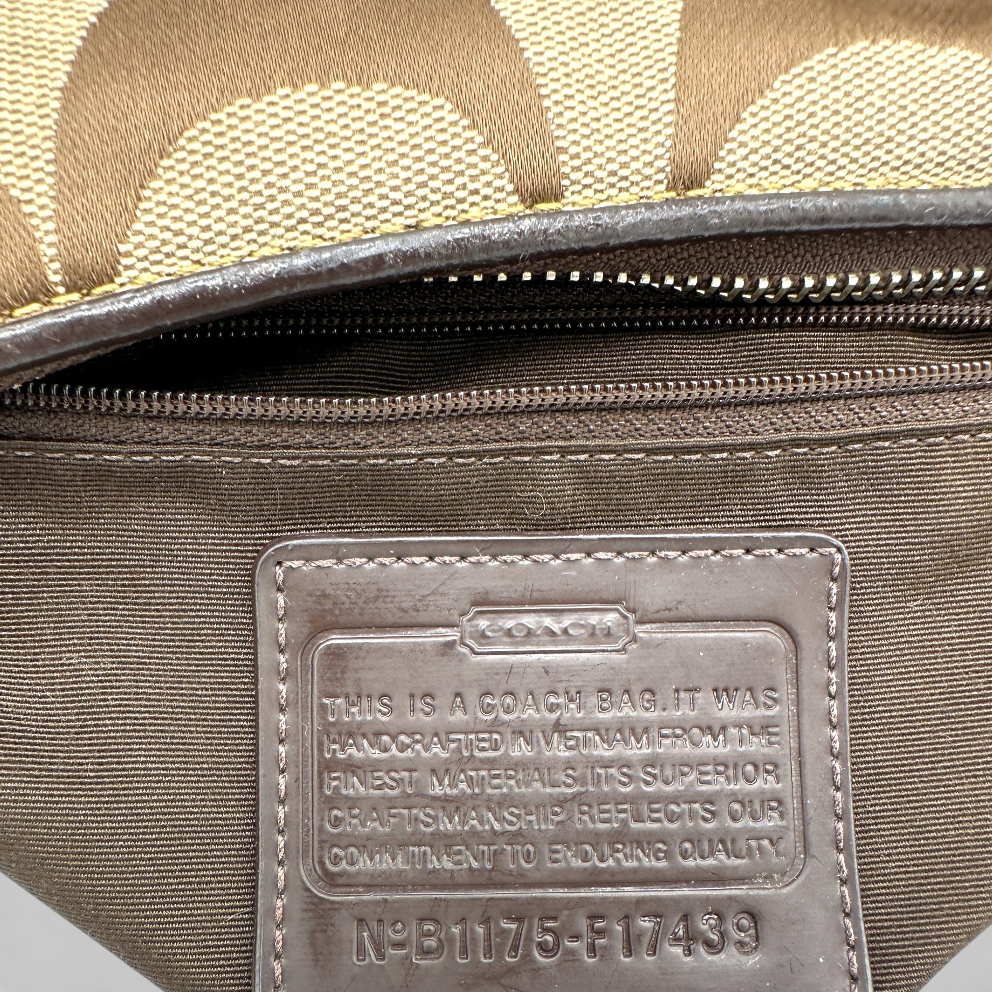 Modèle et style : Sac bandoulière Coach F17439 vintage. En toile monogrammée emblématique marron et beige, avec finitions en cuir verni marron et détails argentés. Porté épaule ou croisé grâce à sa bandoulière amovible.