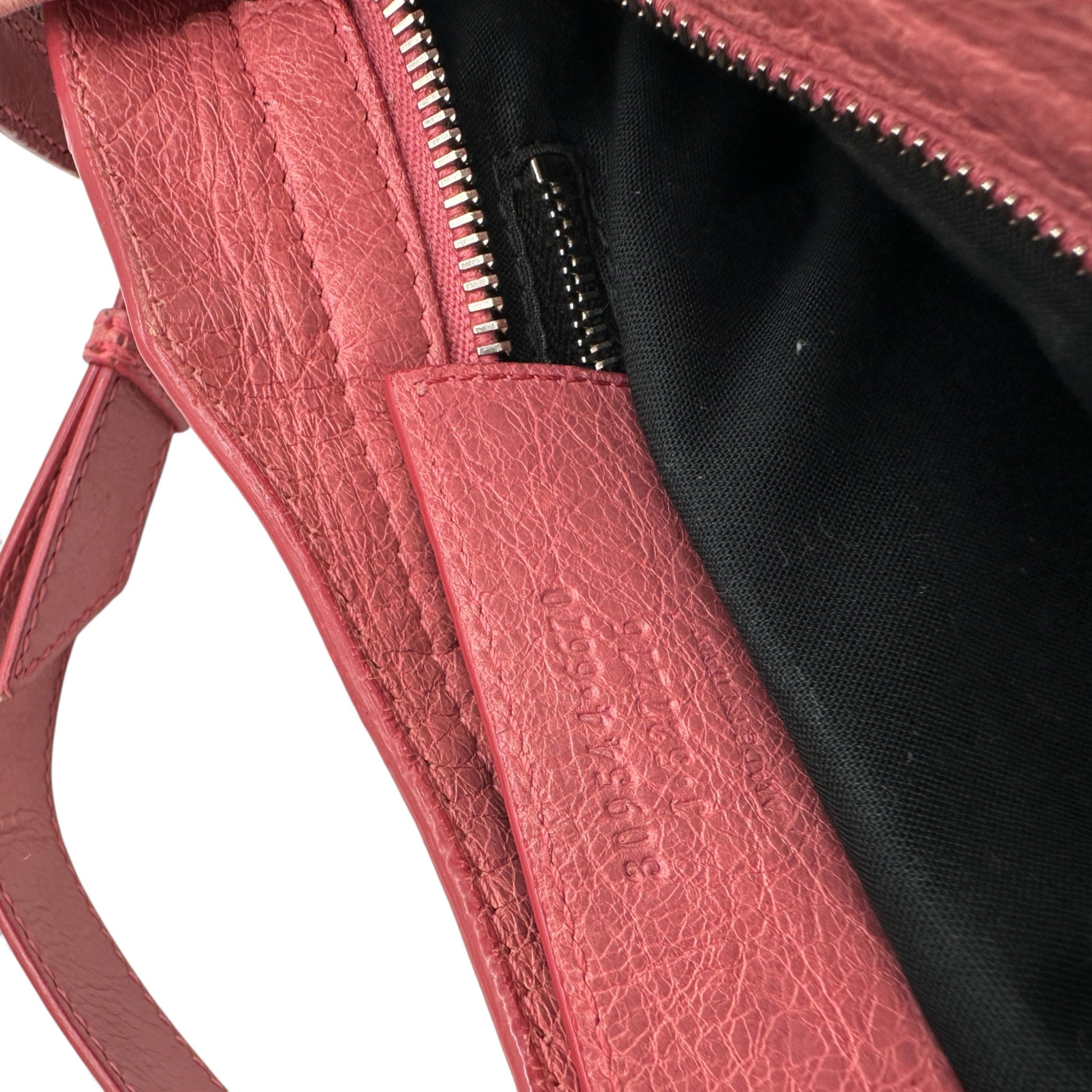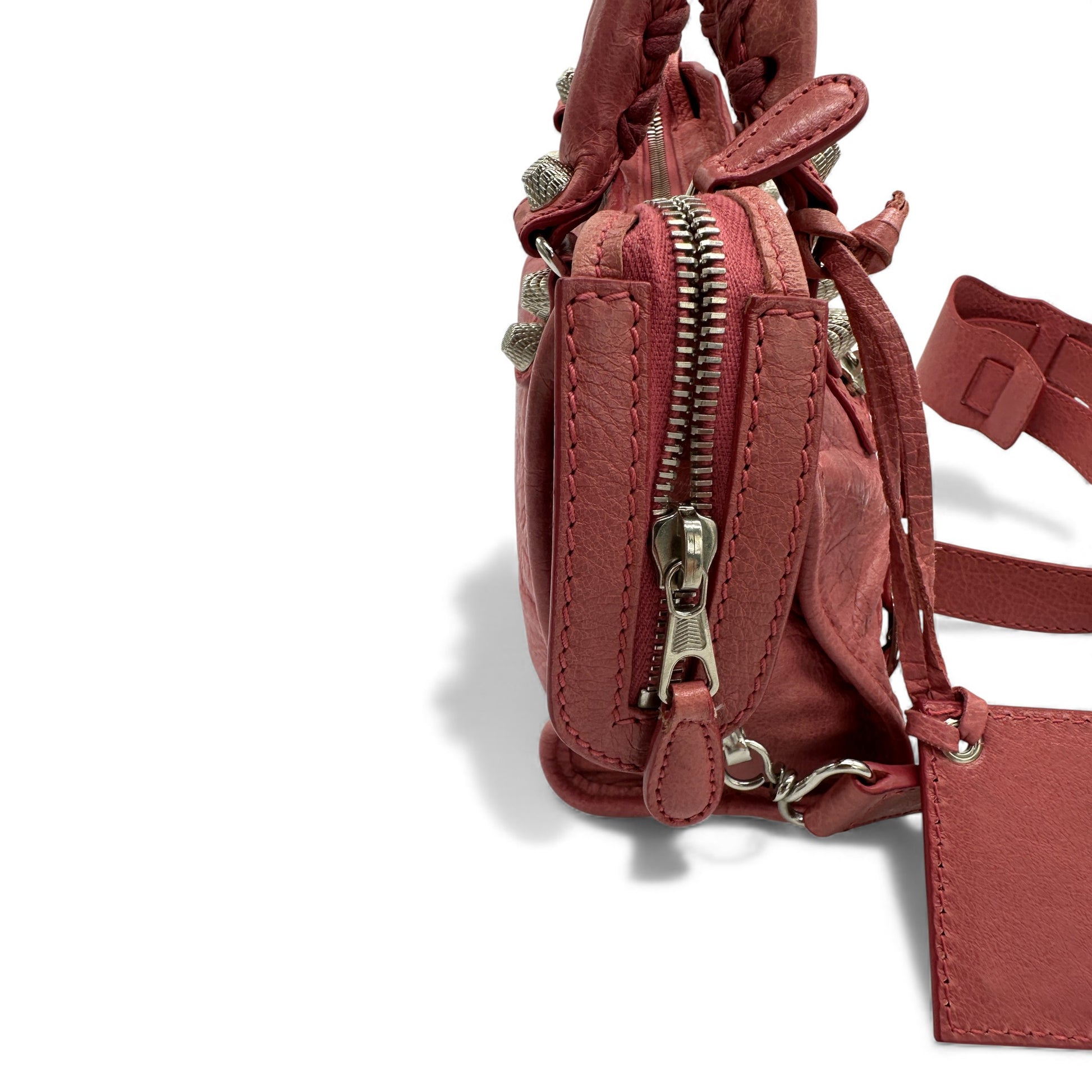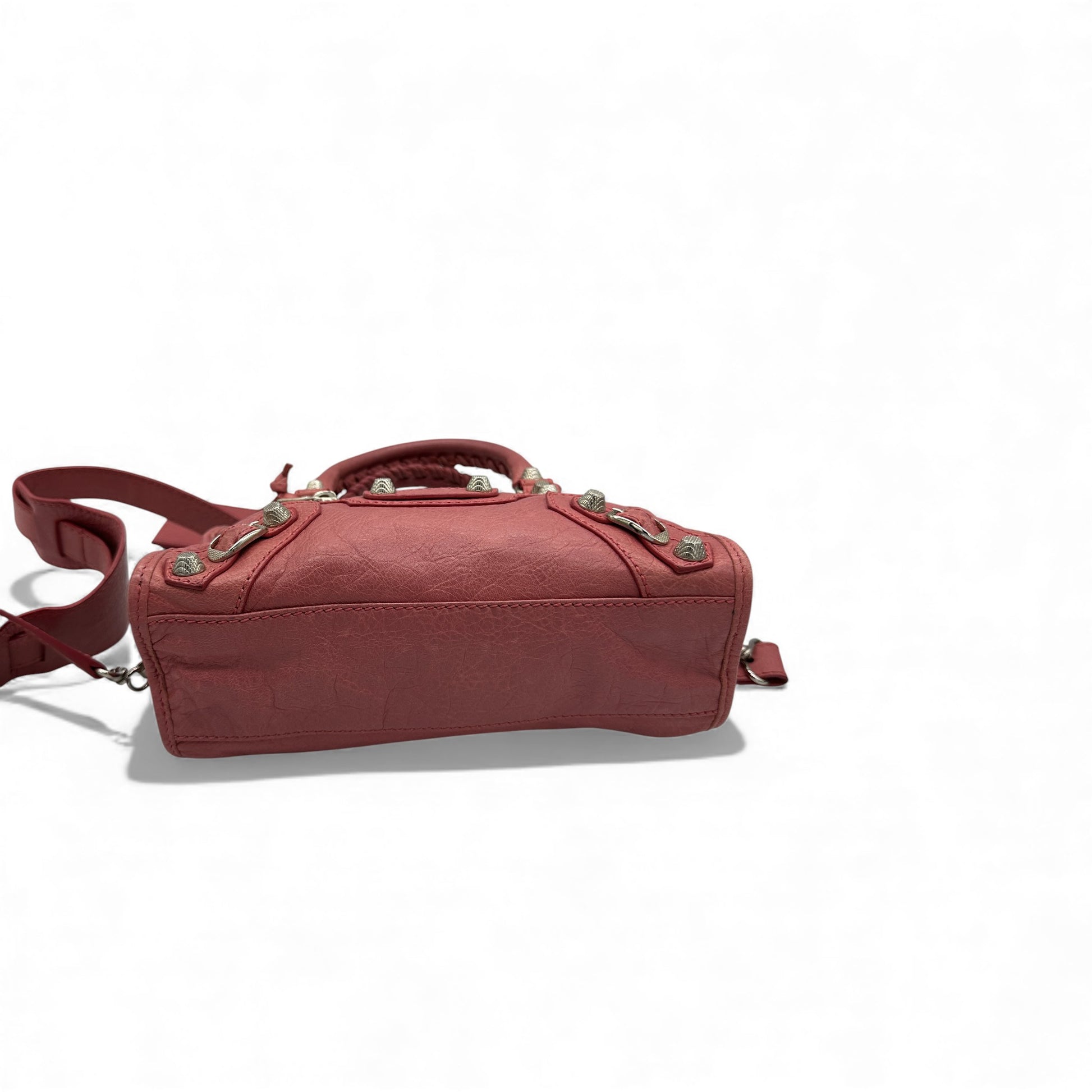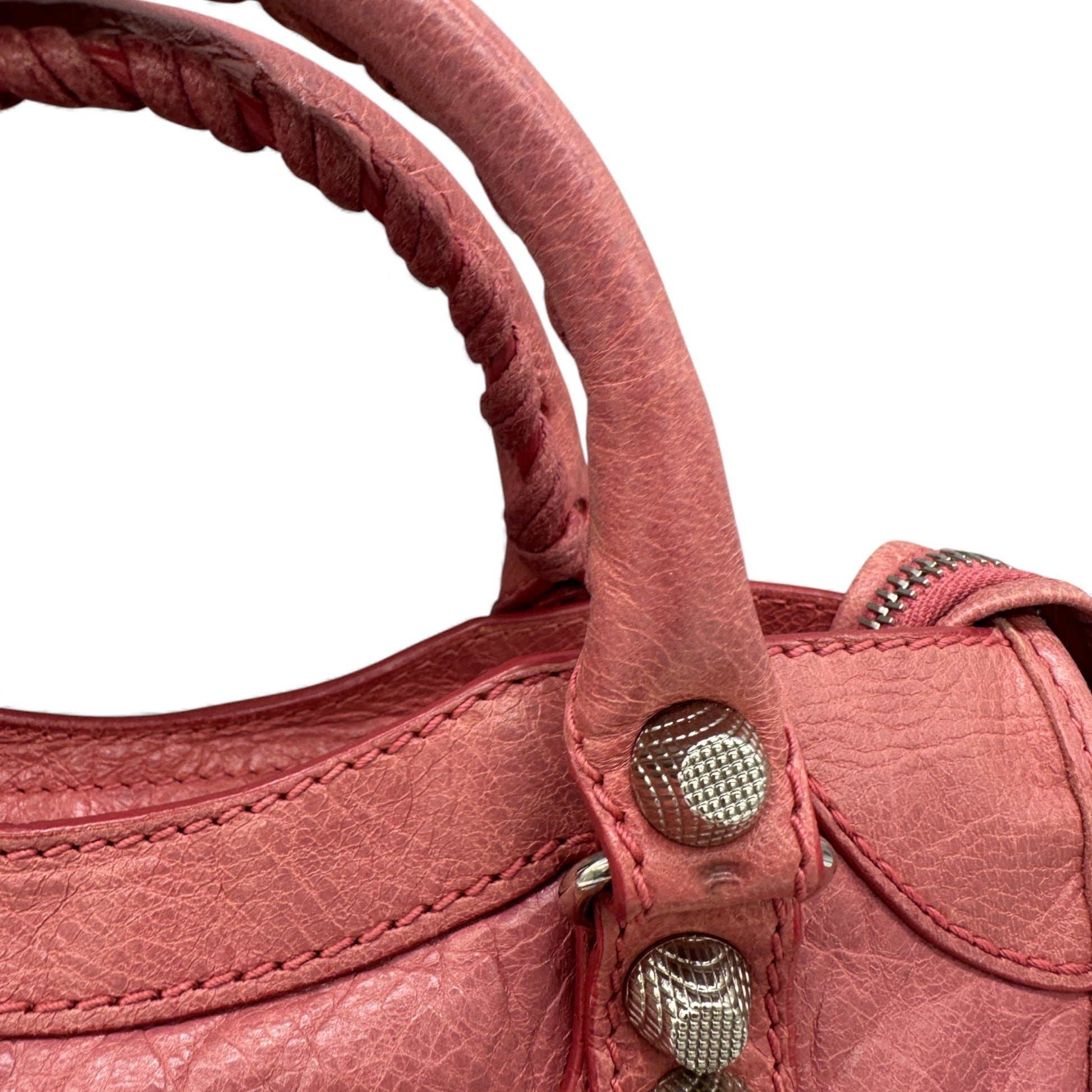 Vintage Balenciaga Giant Mini City 309544 Bag. In distressed rose pink soft lambskin leather, with silver Giant 12 motorcycle stud detailing, and rolled whip-stitched top handles. With detachable shoulder strap, this can be worn as a handbag or crossbody. Made in Italy, from Spring/Summer 2013 collection.