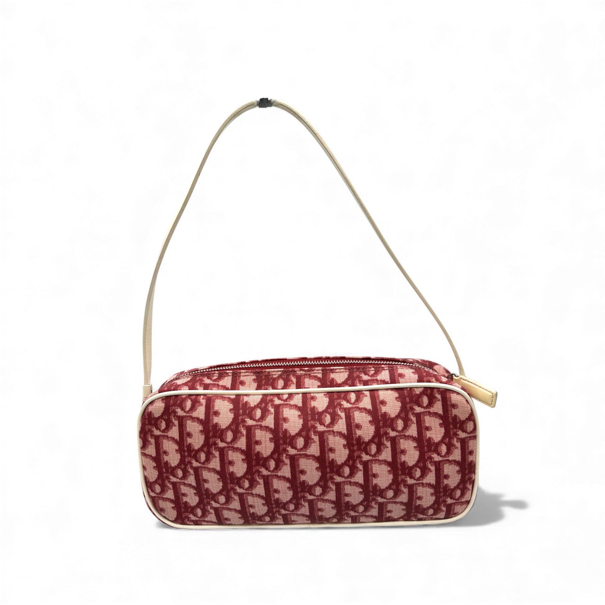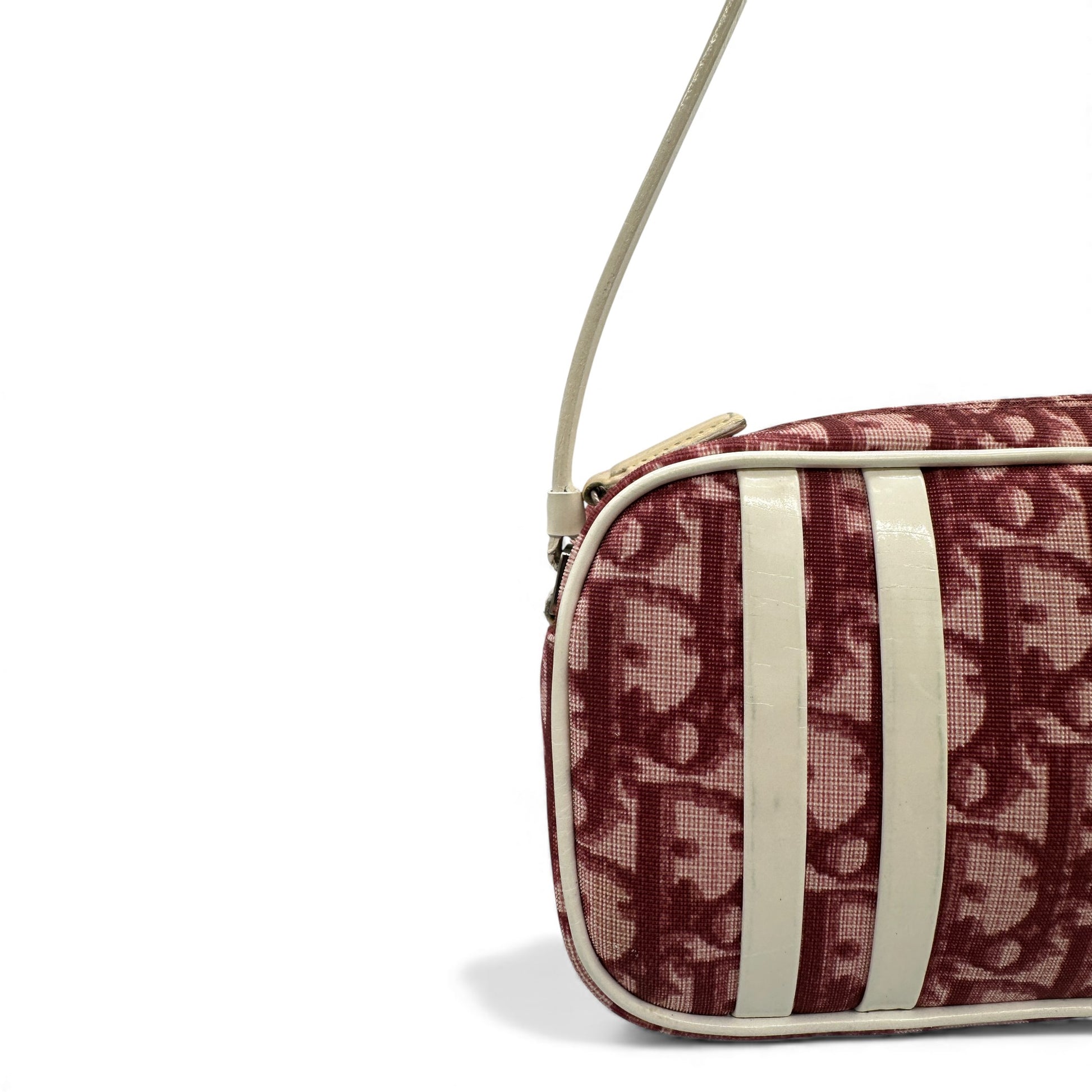 Vintage Christian Dior Diorissimo Trotter Shoulder Bag. In Bordeaux red and beige coated canvas, trimmed with white patent leather. Made in Italy, with patent leather "1" and stripes accent. The perfect Dior silhouette for use as a handbag or shoulder bag.