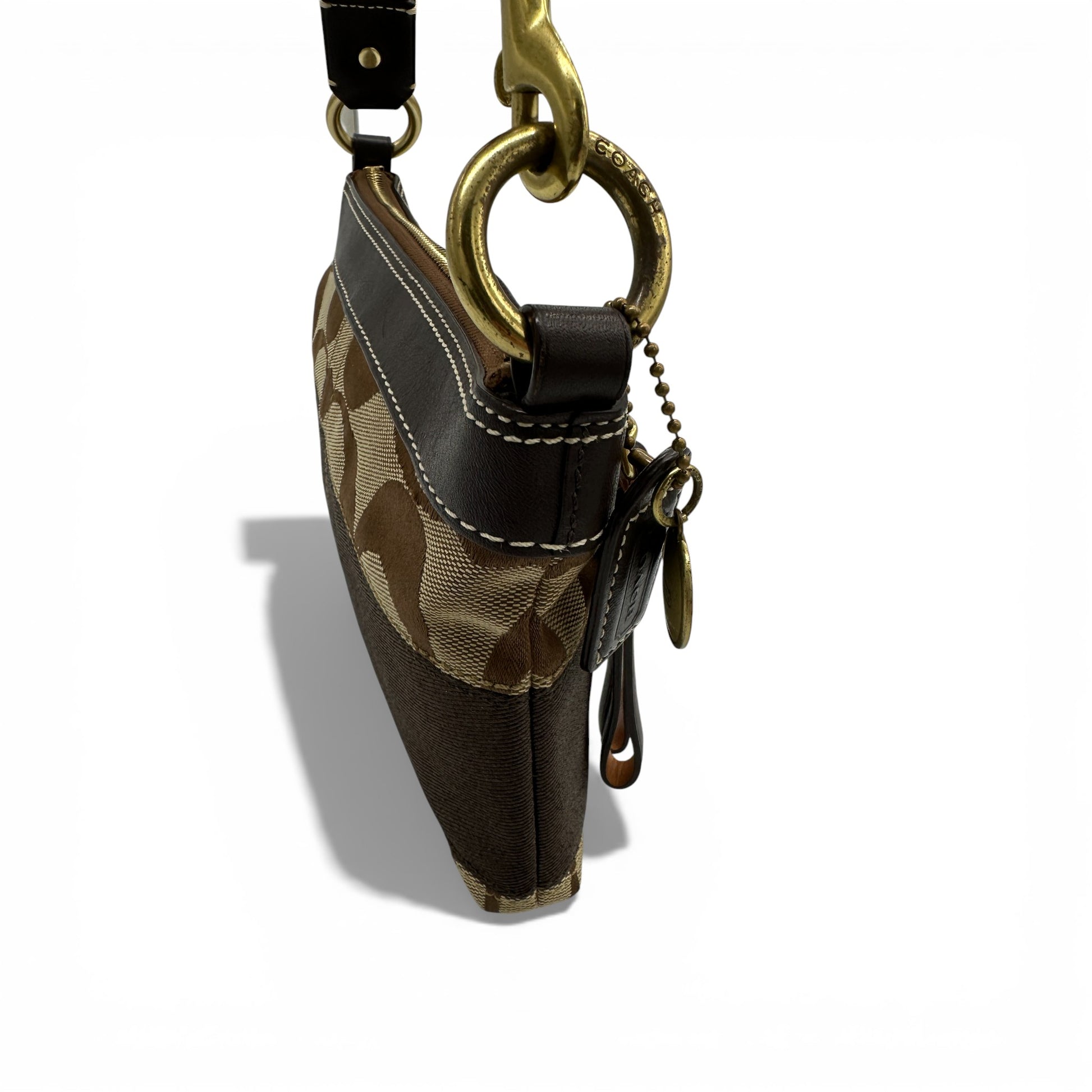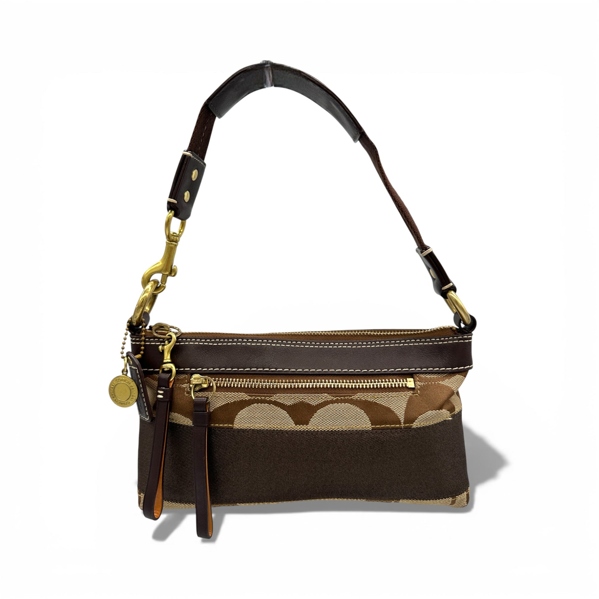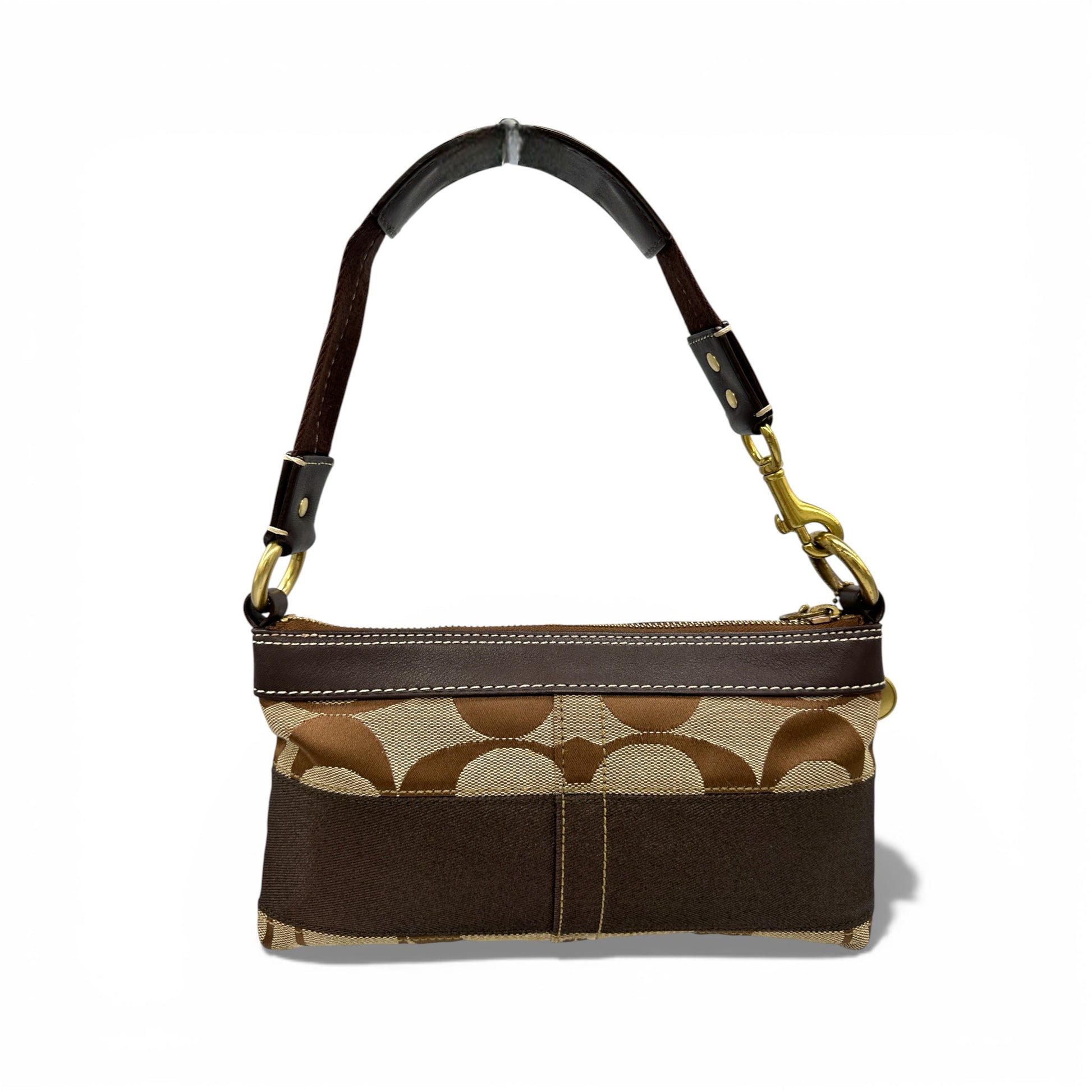 Vintage Coach 10120 Baguette Shoulder Bag. In brown and beige signature monogram, trimed with brown leather and gold-tone brass hardware. A Y2K piece from 2006.