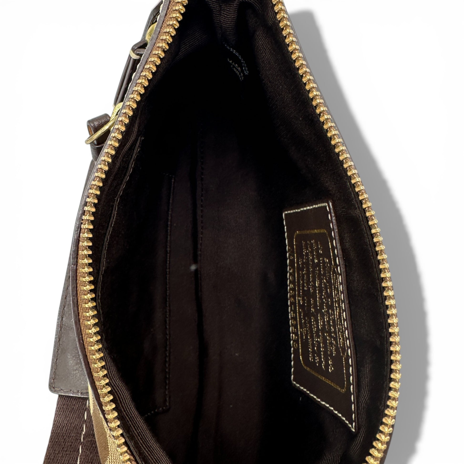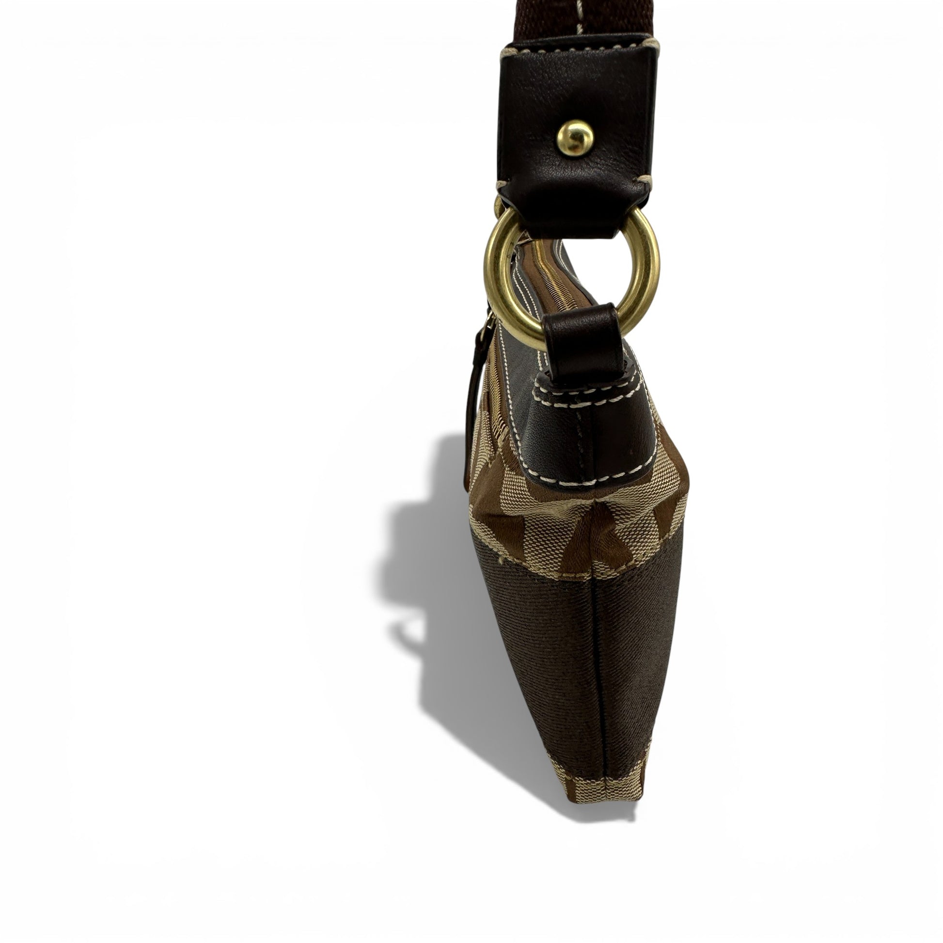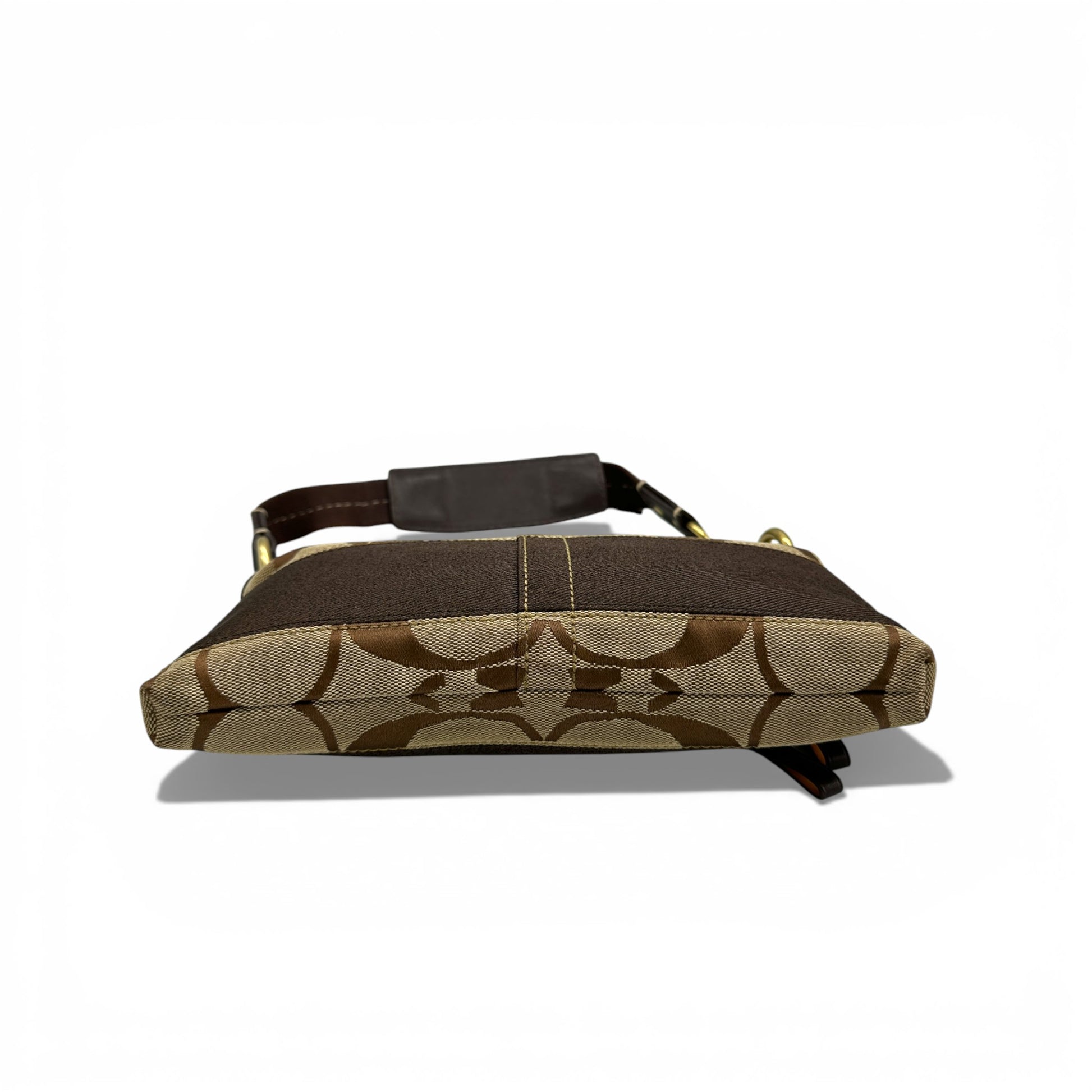 Vintage Coach 10120 Baguette Shoulder Bag. In brown and beige signature monogram, trimed with brown leather and gold-tone brass hardware. A Y2K piece from 2006.
