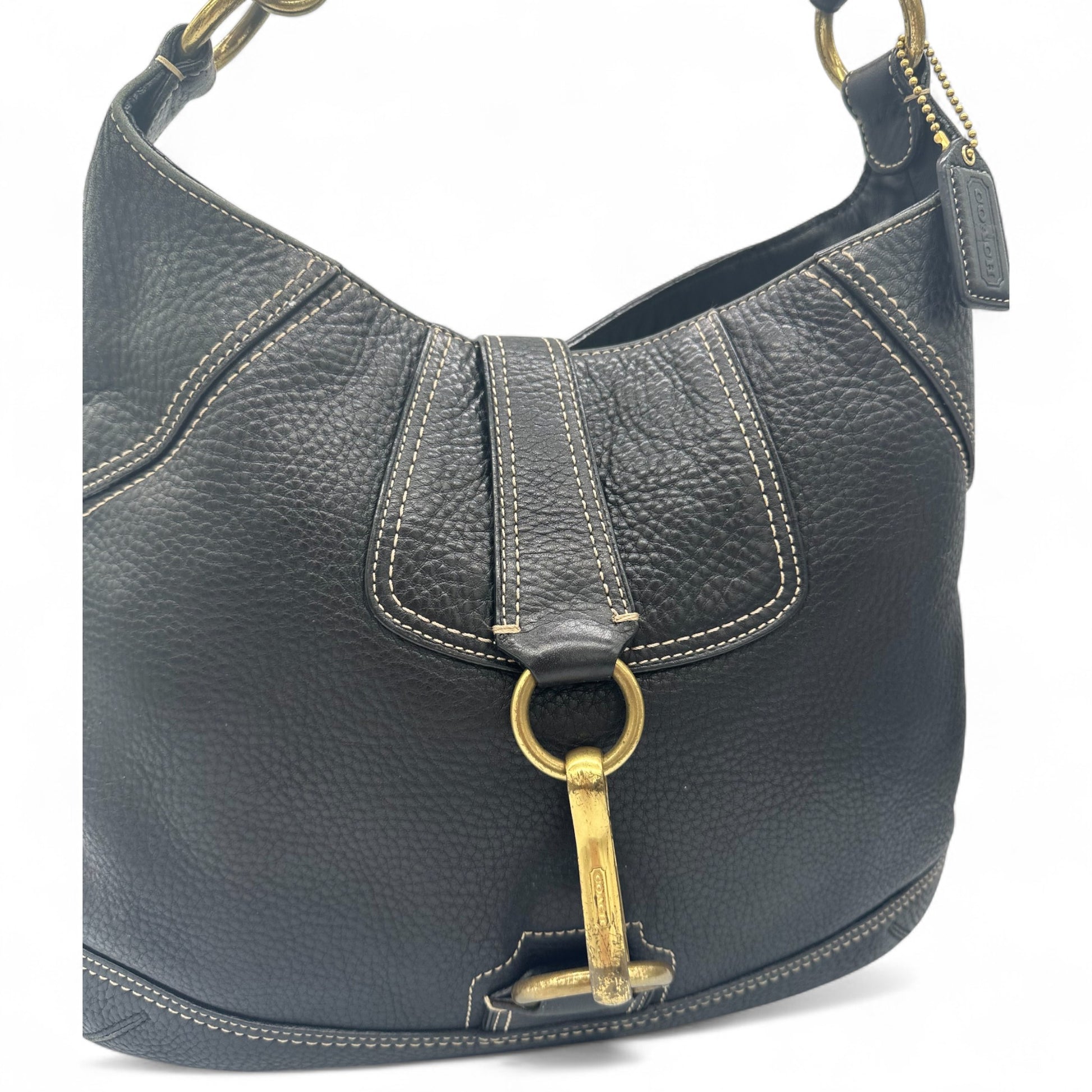 Model and style: Vintage Coach 10210 Hampton Clip Shoulder Bag. In soft milled black cowhide leather, with brass horsebit clip hardware.