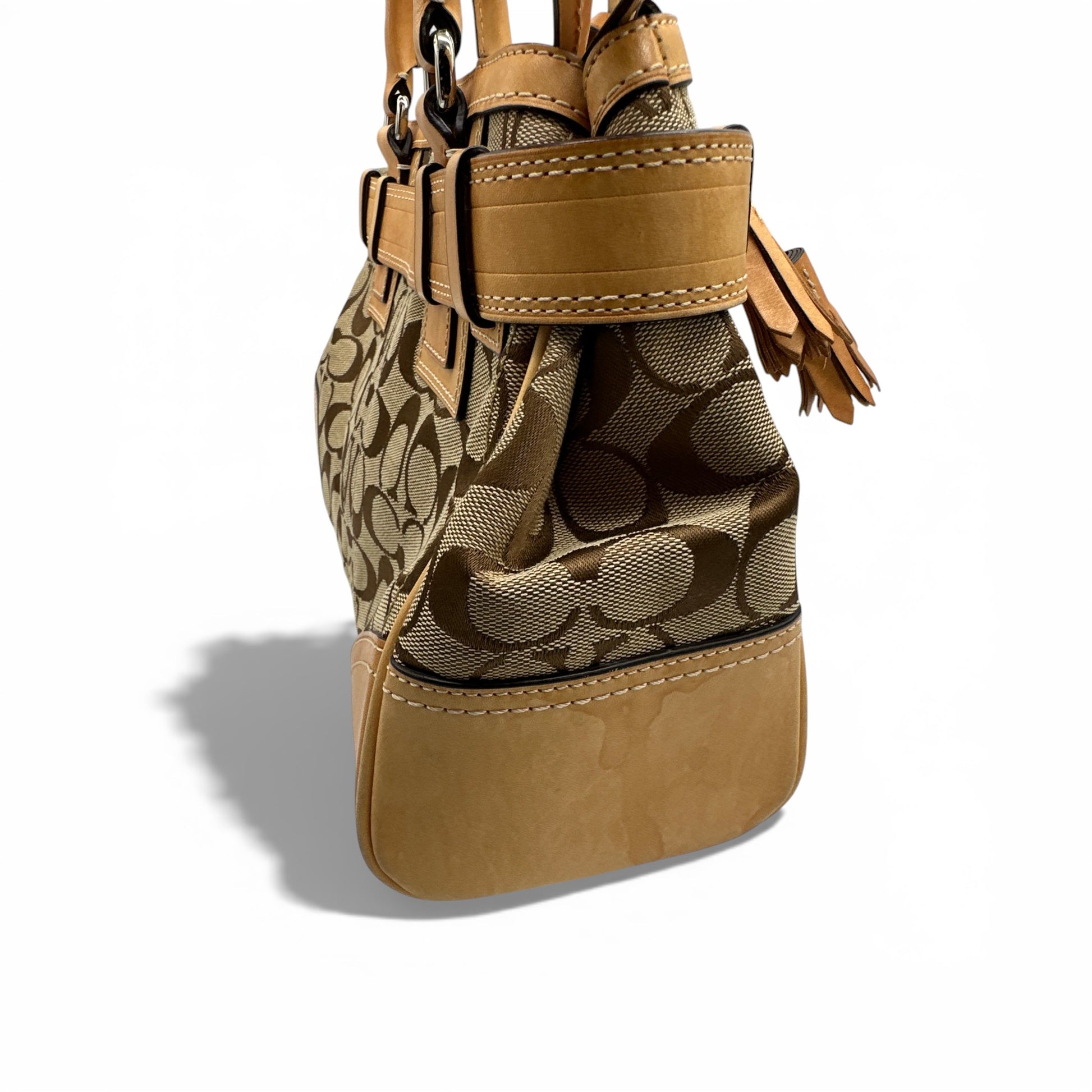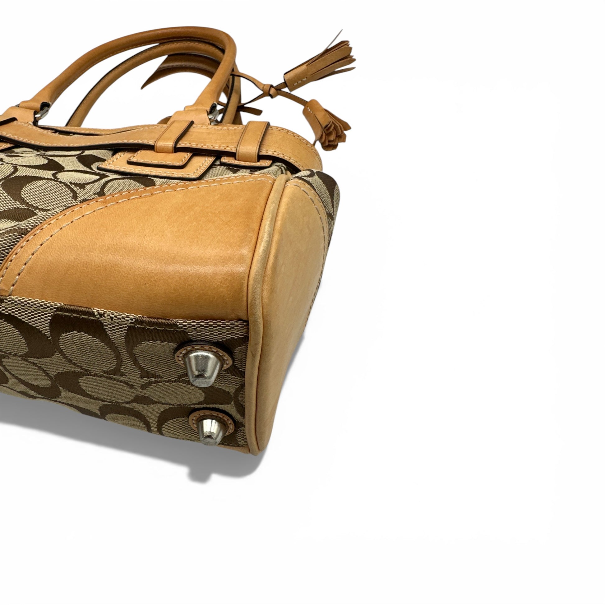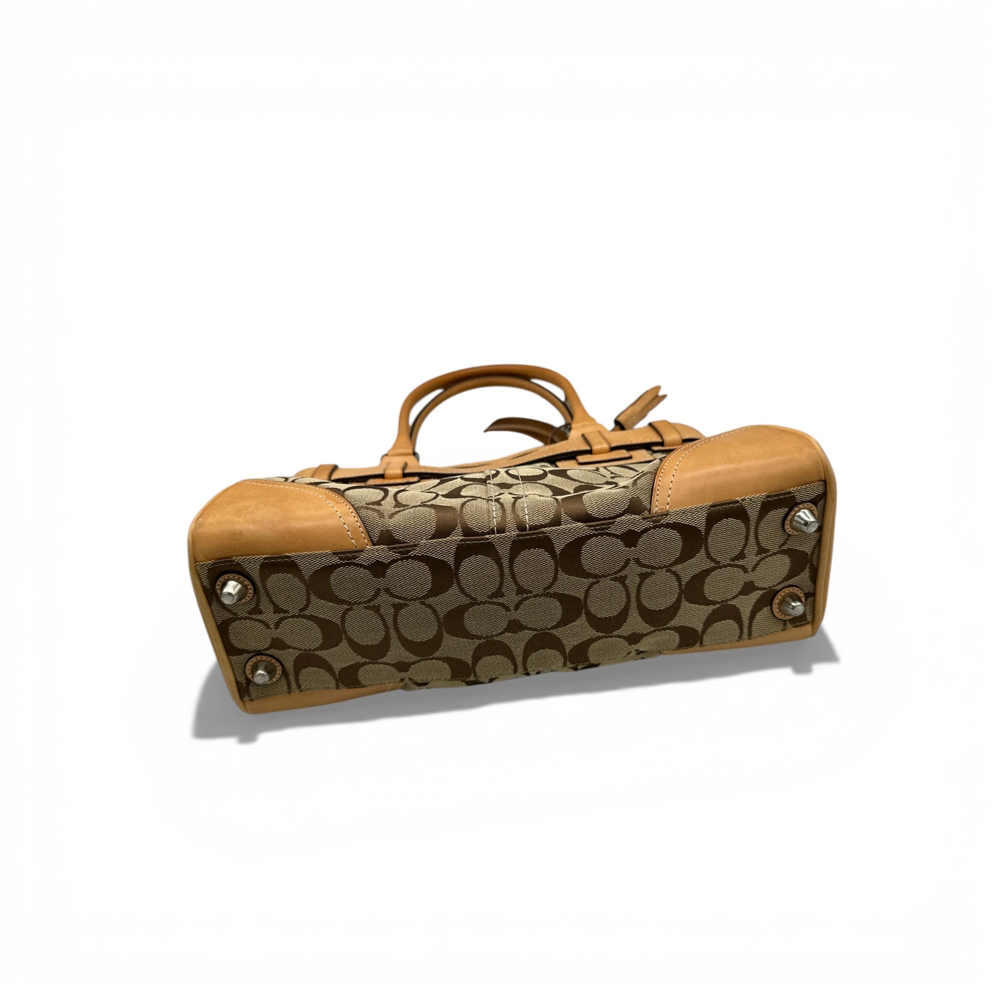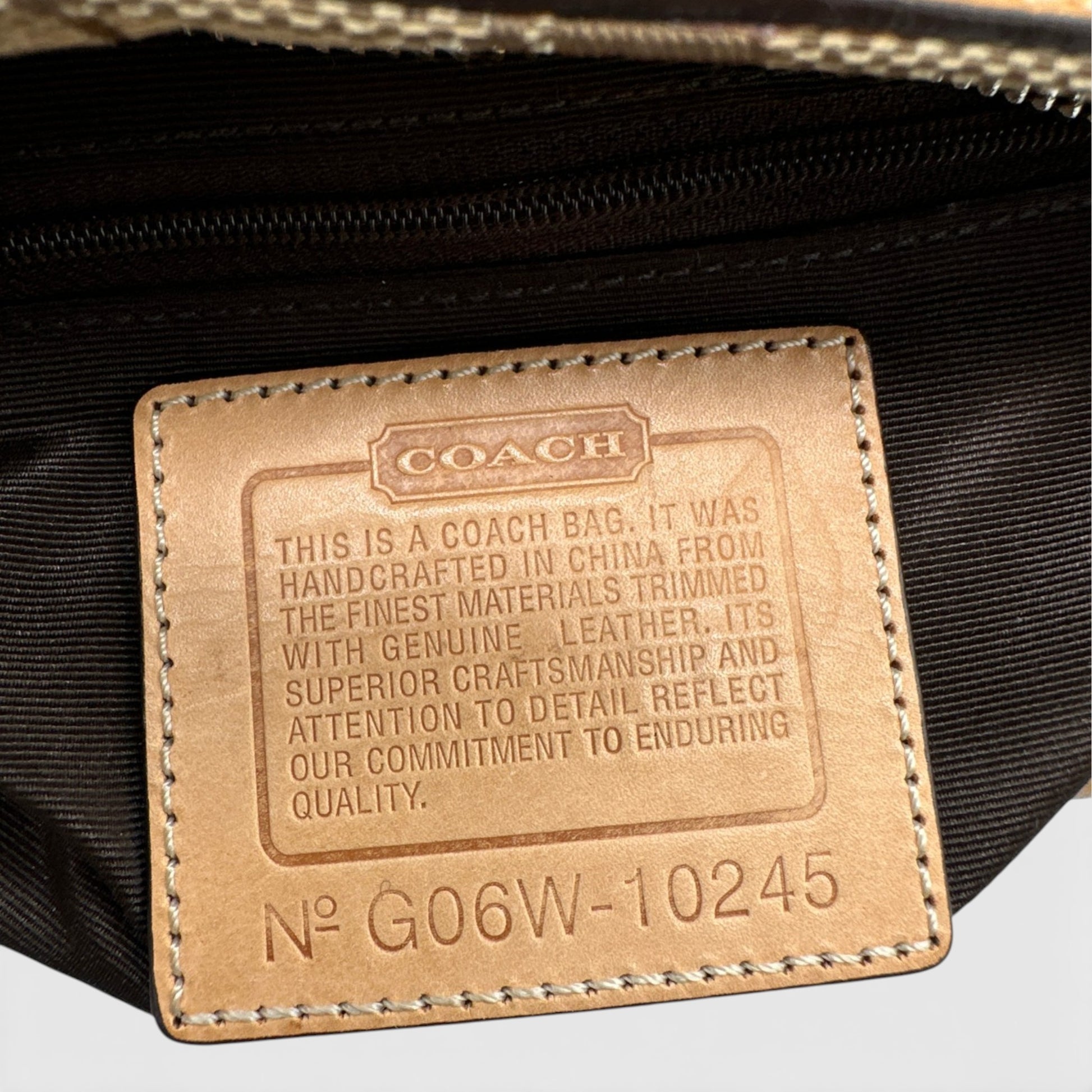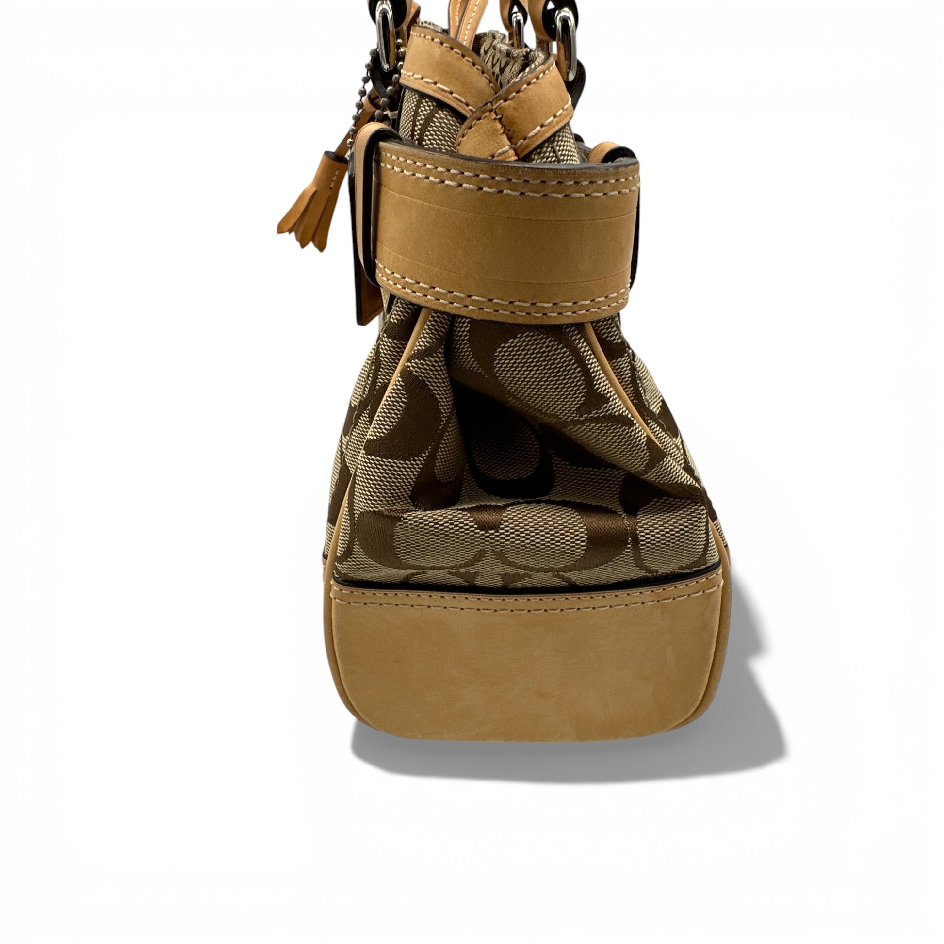 Vintage Coach 10245 Hampton Clip Handbag in brown and beige signature monogram with tan leather trim and silver-toned horse-bit hardware. A Y2K piece from 2006.