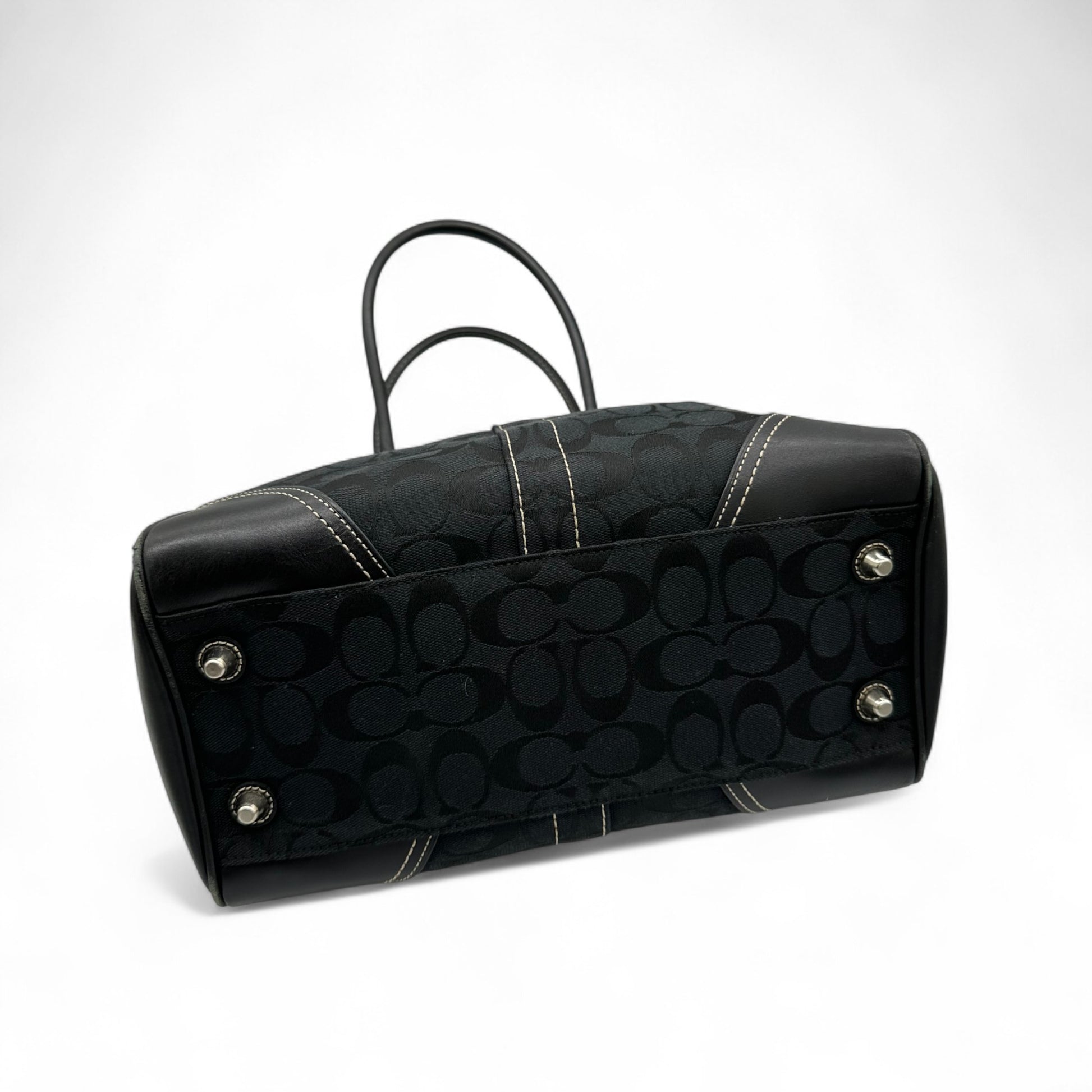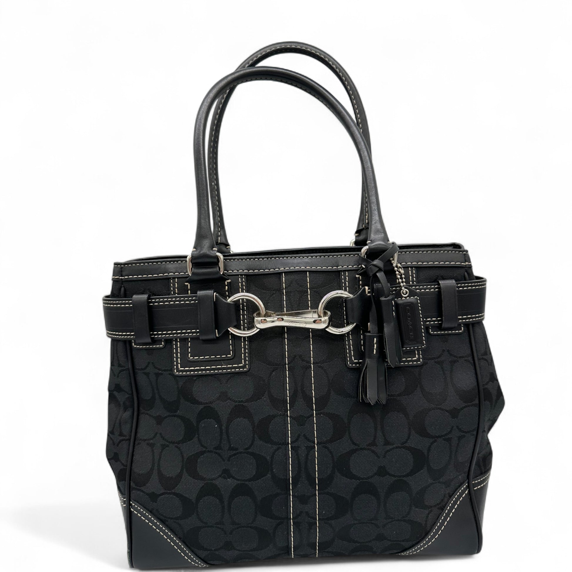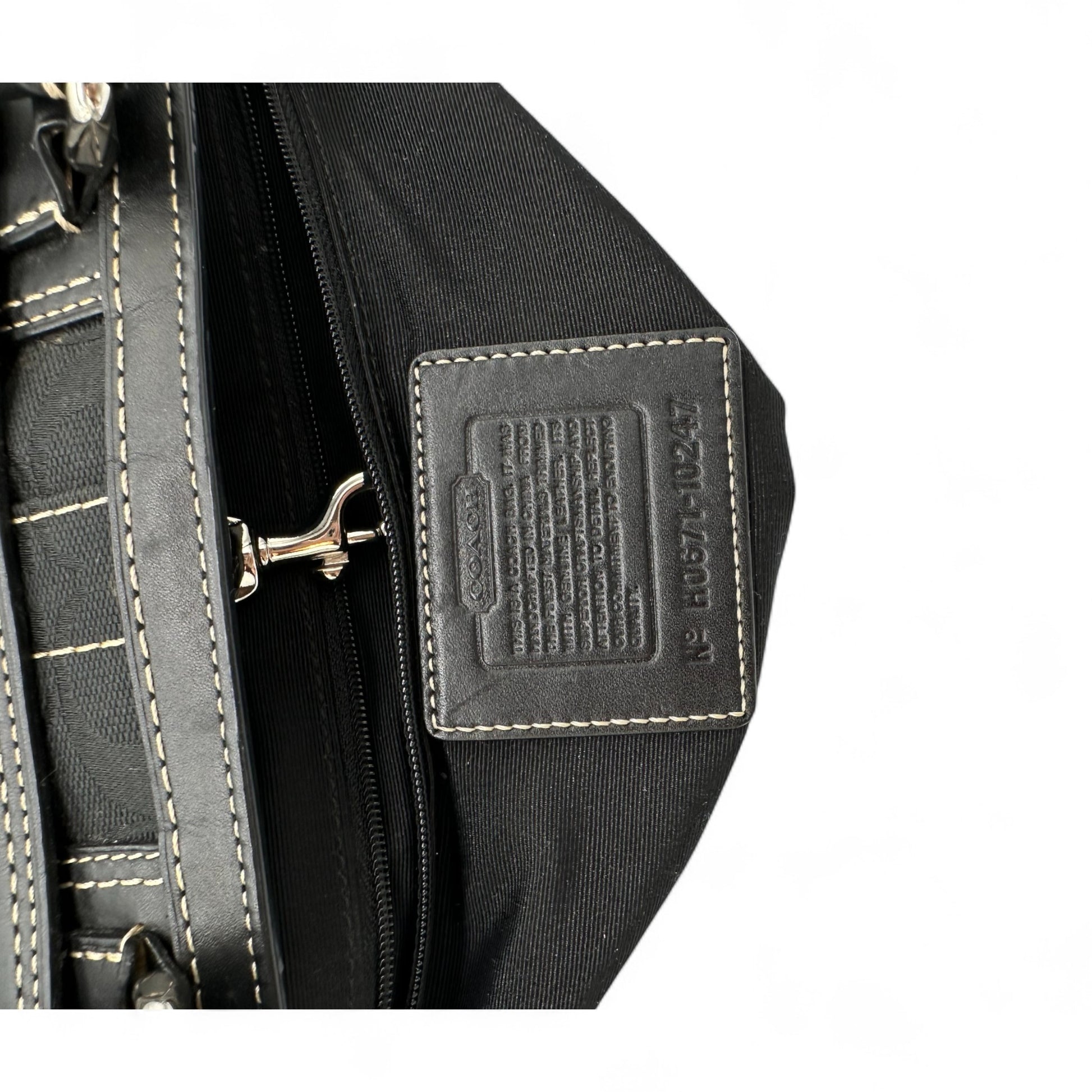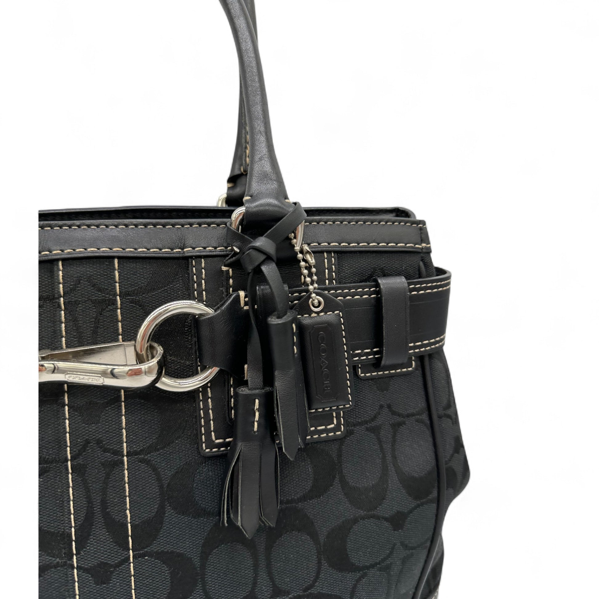 Model and style: Vintage Coach 10247 Hampton Clip Handbag. In black and charcoal signature monogram, trimmed with black leather and silver horsebit clip hardware.
