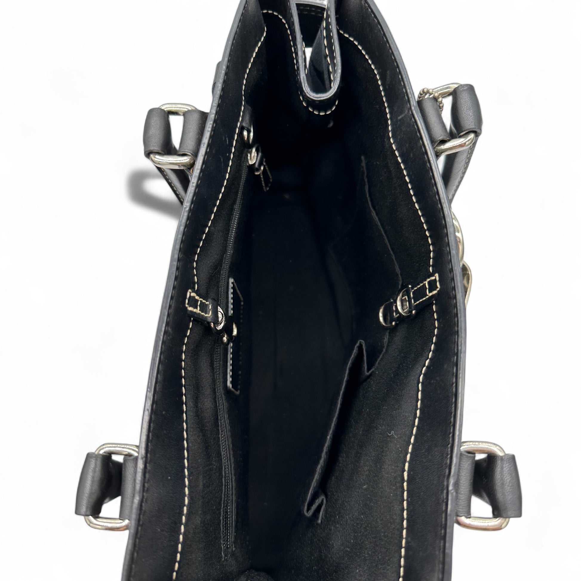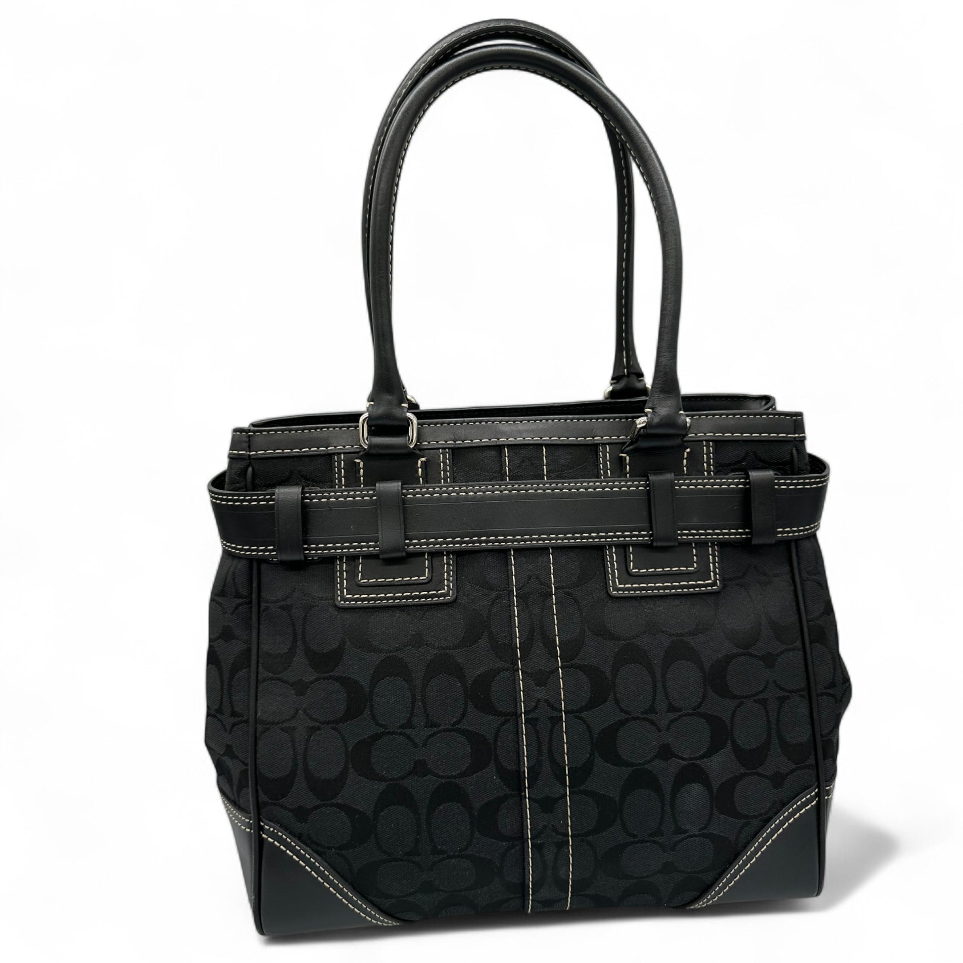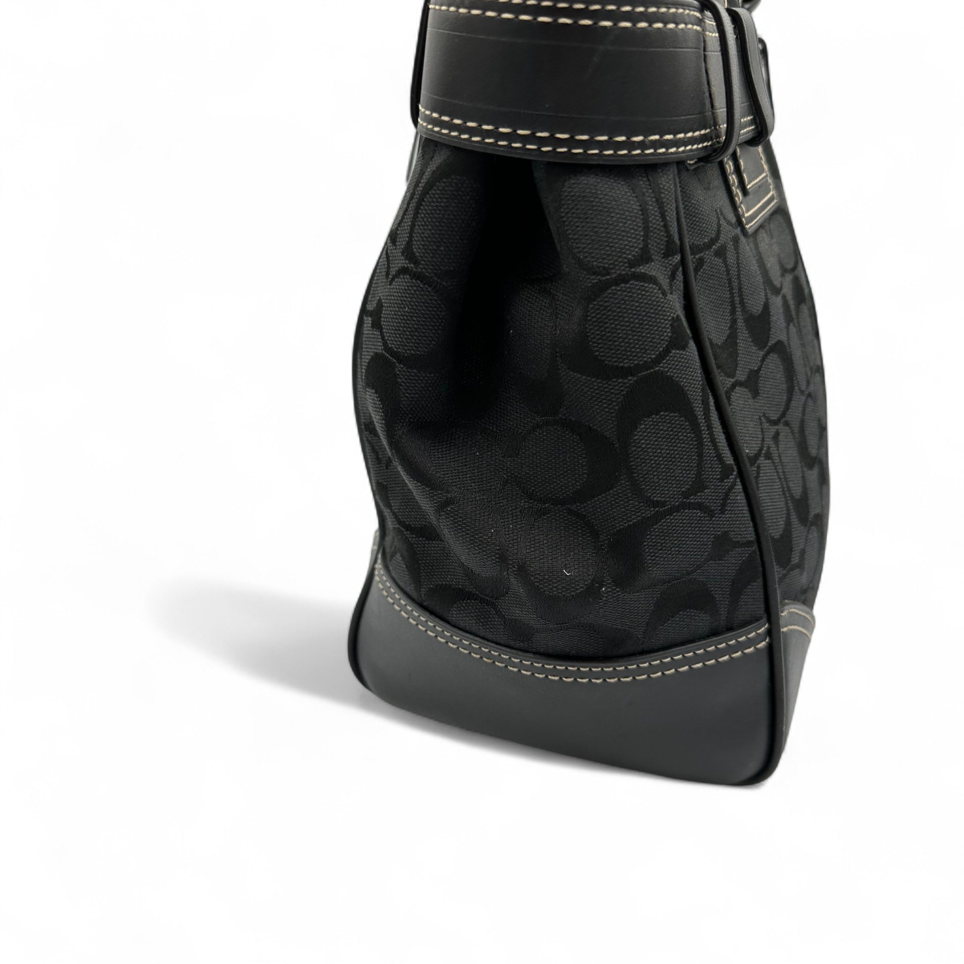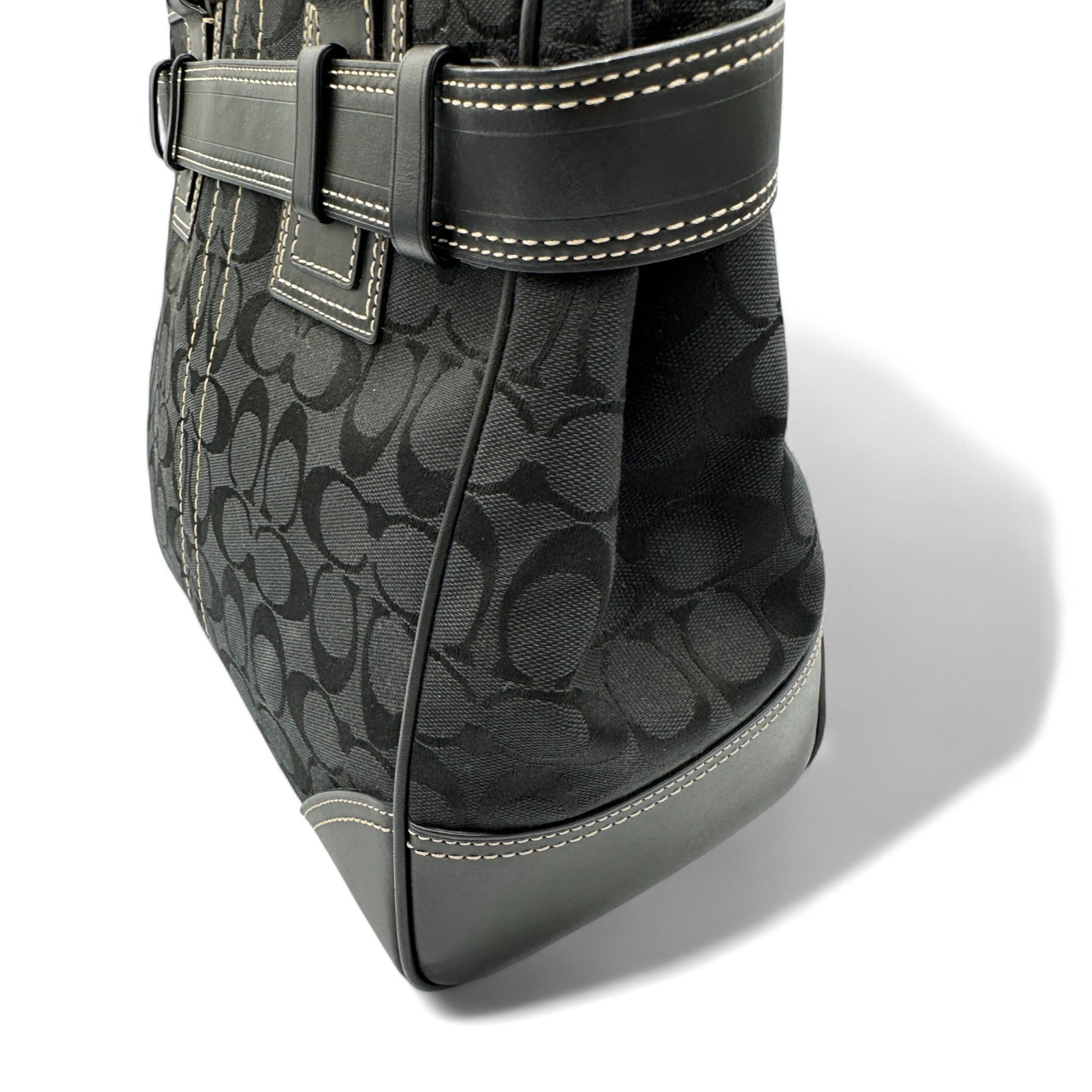 Model and style: Vintage Coach 10247 Hampton Clip Handbag. In black and charcoal signature monogram, trimmed with black leather and silver horsebit clip hardware.