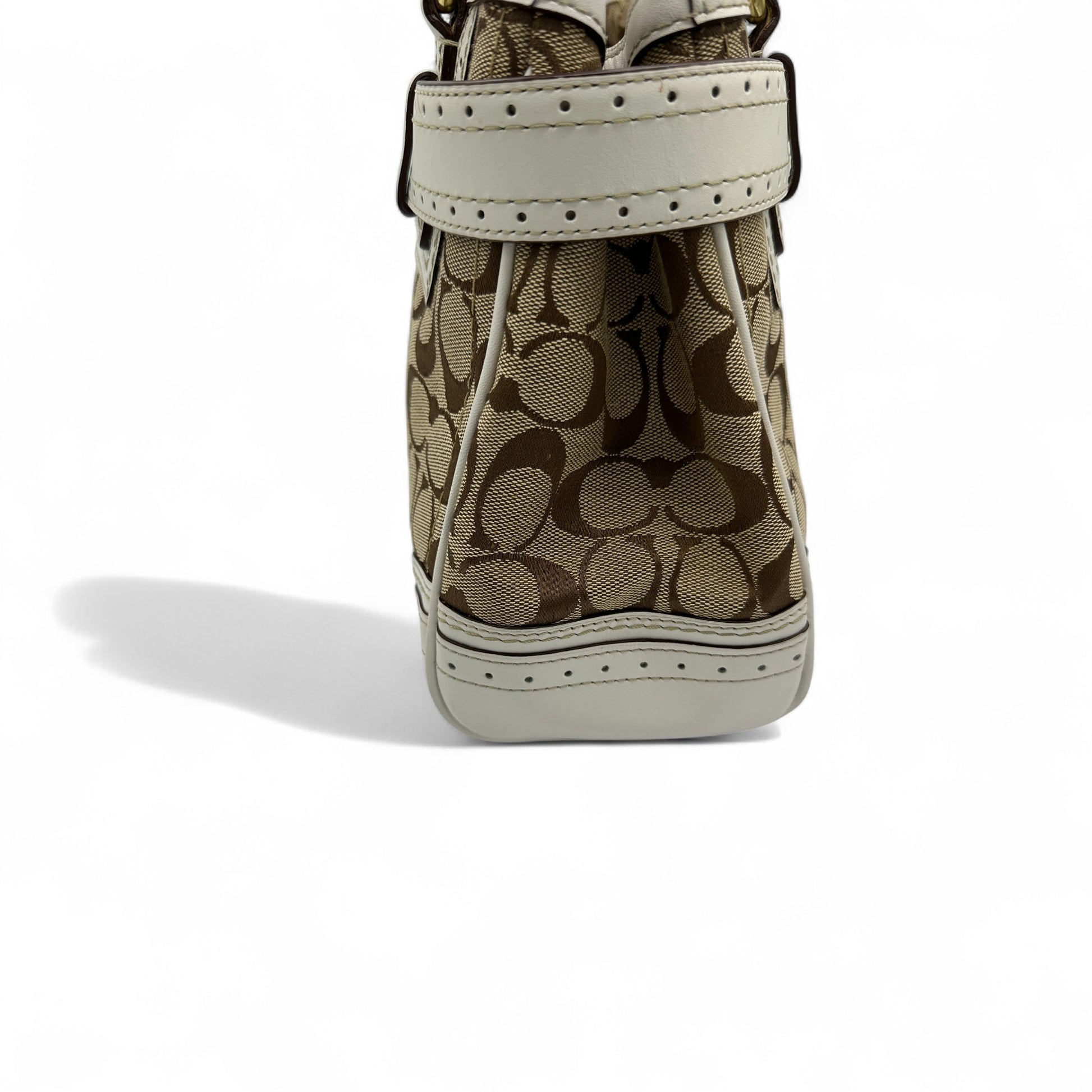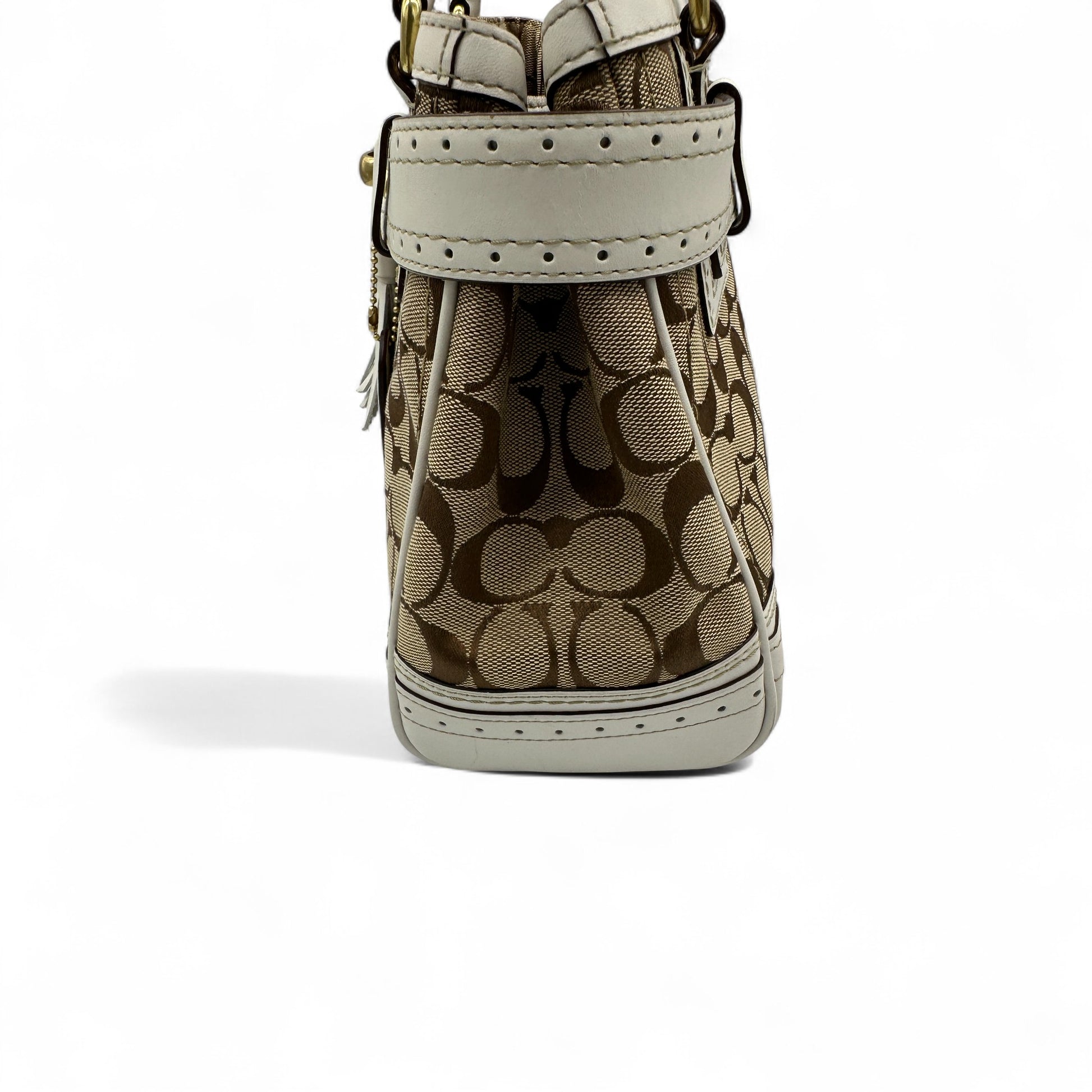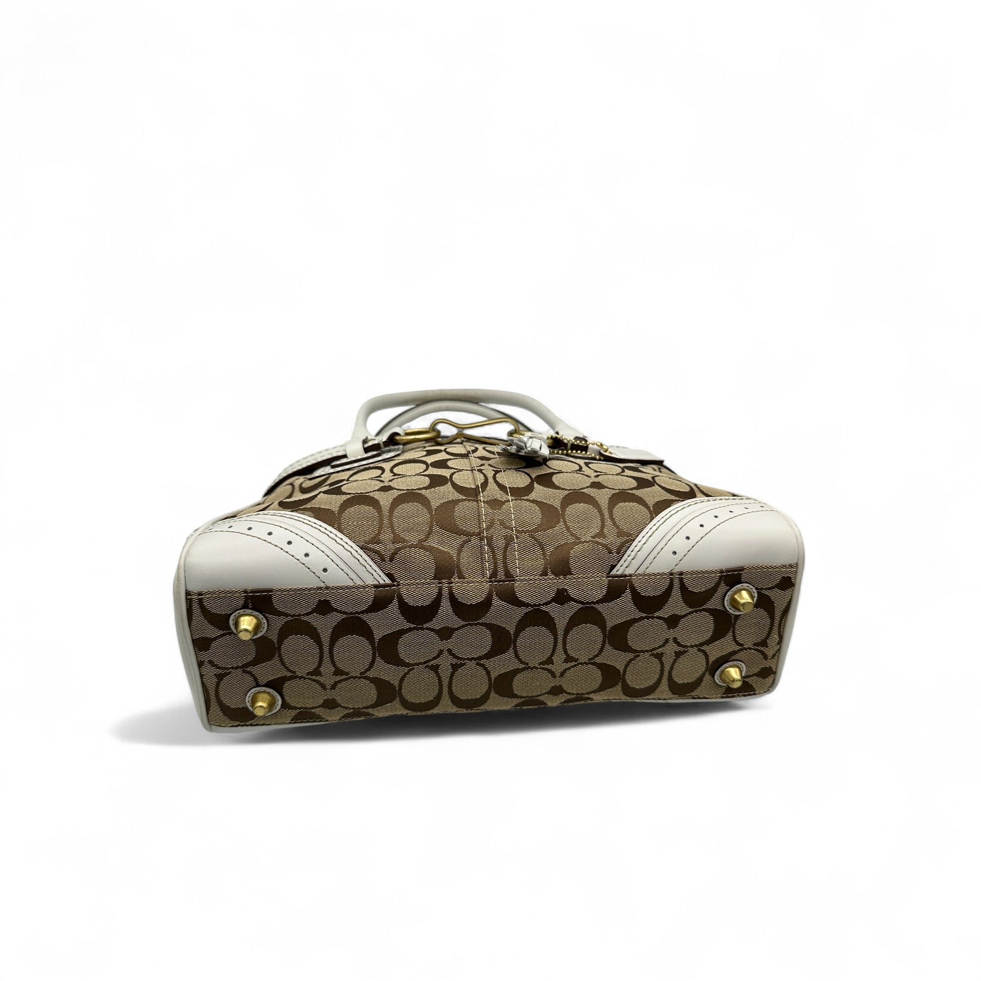 Model and style: Vintage Coach 10507 Hampton Clip Handbag in signature monogram with white leather trim and gold coloured hardware. A Y2K piece from 2006.