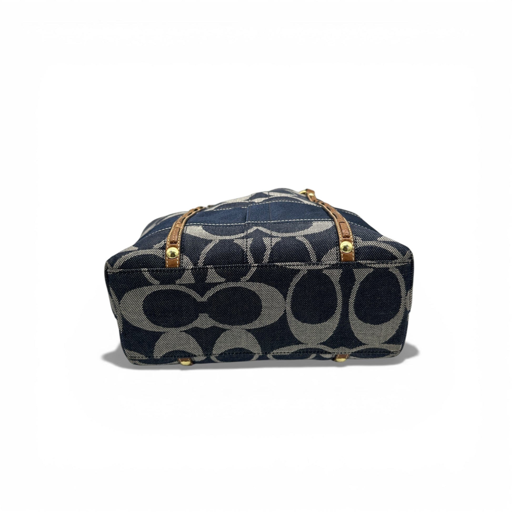 Vintage Coach 11179 Denim Tote Shoulder Bag. In navy blue and silver signature denim monogram canvas, trimmed with brown leather with clip fastening. A Y2K piece from 2007.