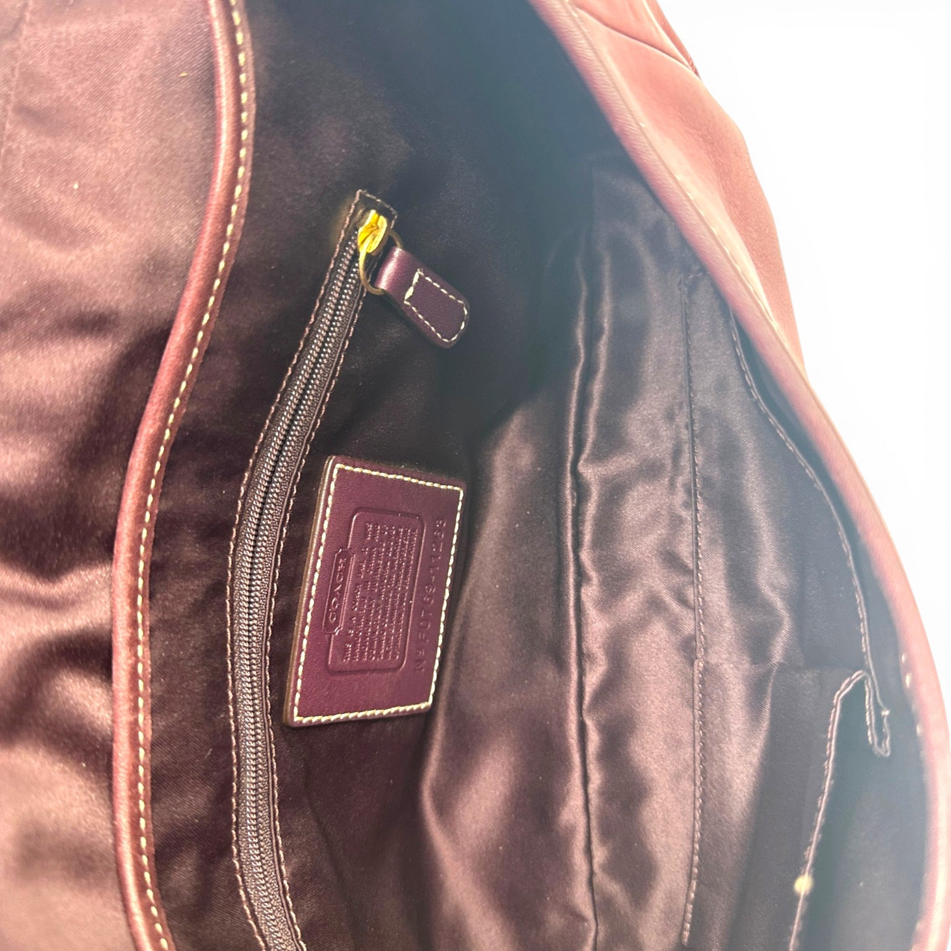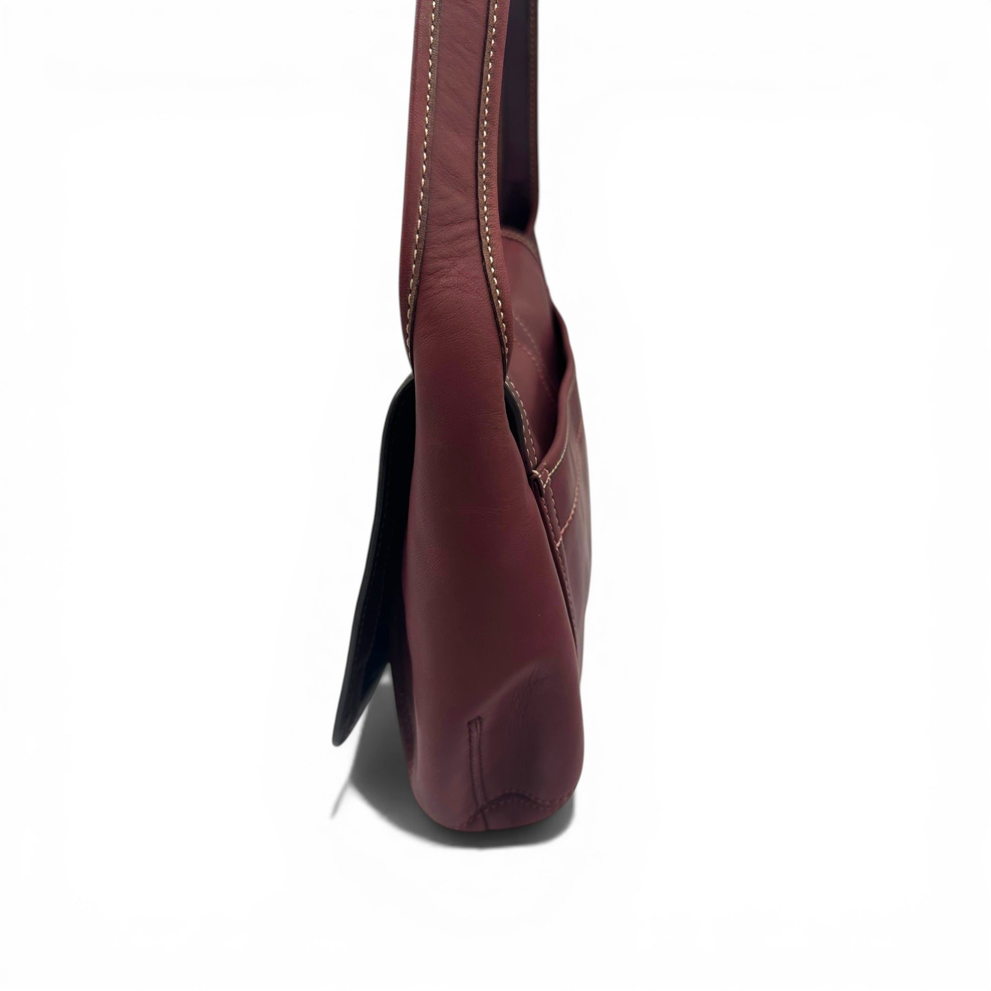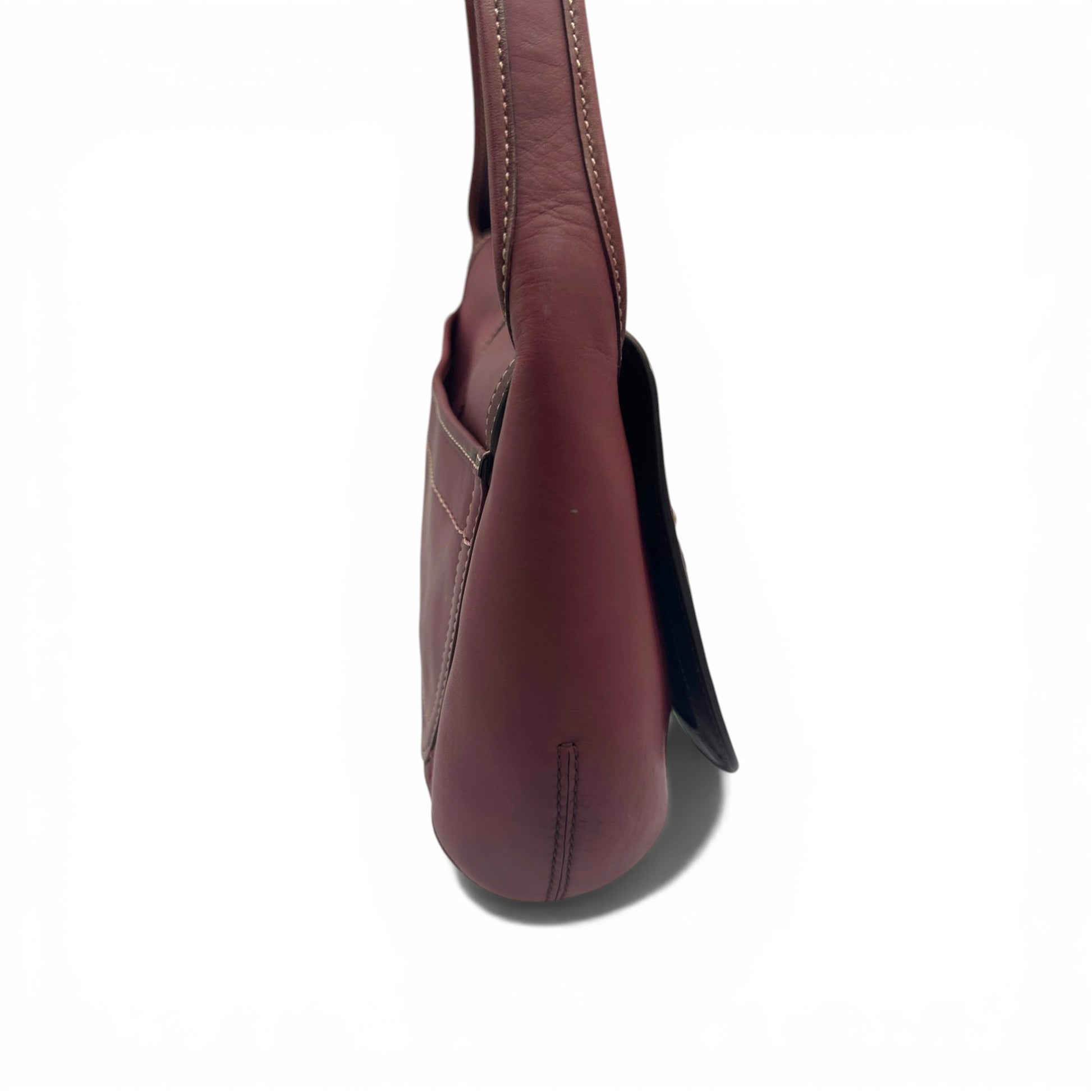 Vintage Coach 11263 Horsebit Ergo Shoulder Bag. In burgundy plum burnished cowhide leather, with brass horsebit clip hardware. This bag is designed to be worn comfortably on the shoulder. A Y2K piece from 2007.