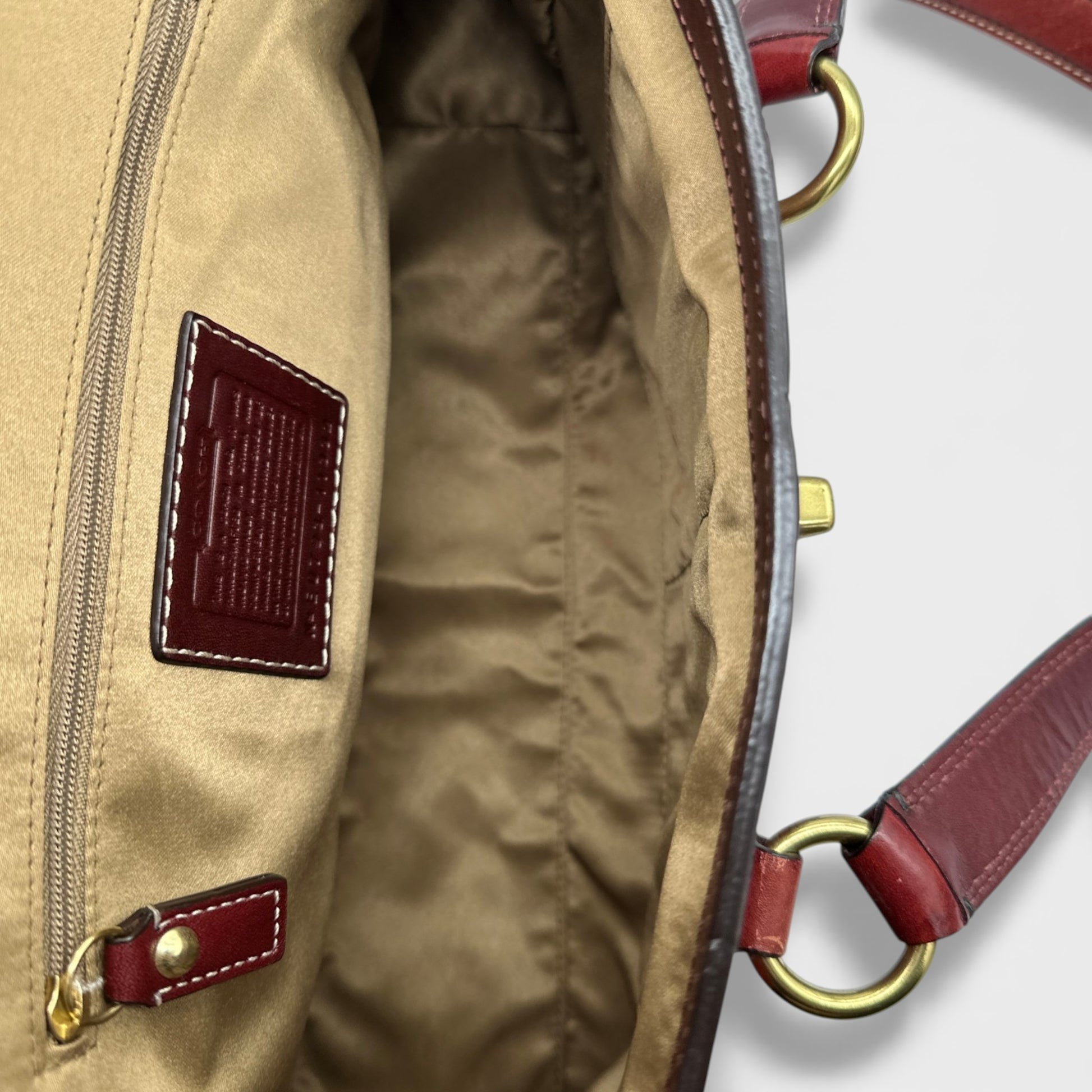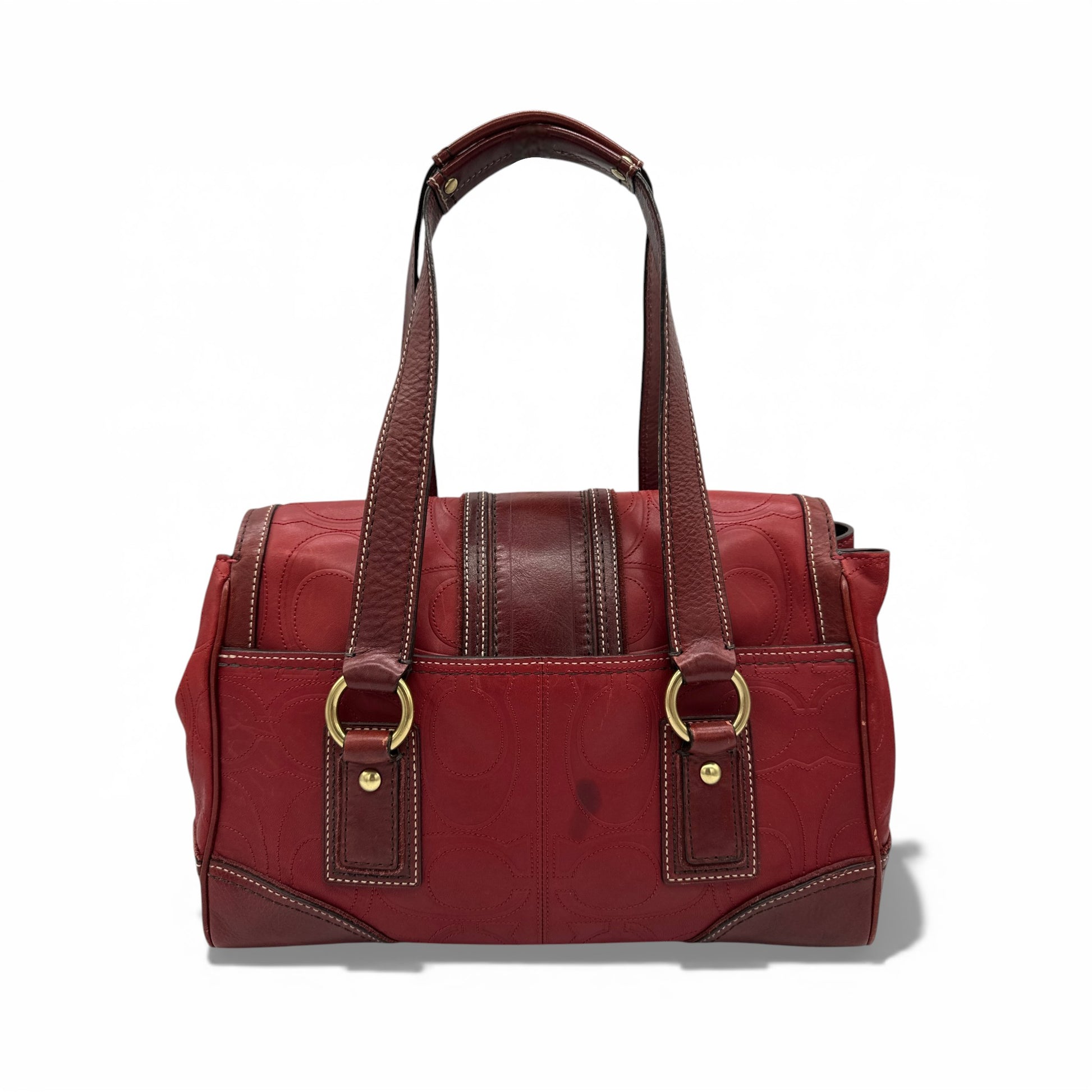 Vintage Coach 11332 Hamptons Turnlock Shoulder Bag. In Bordeaux red embossed signature monogram leather, with burgundy red leather trim and brass turnlock hardware. A Y2K piece from 2007.