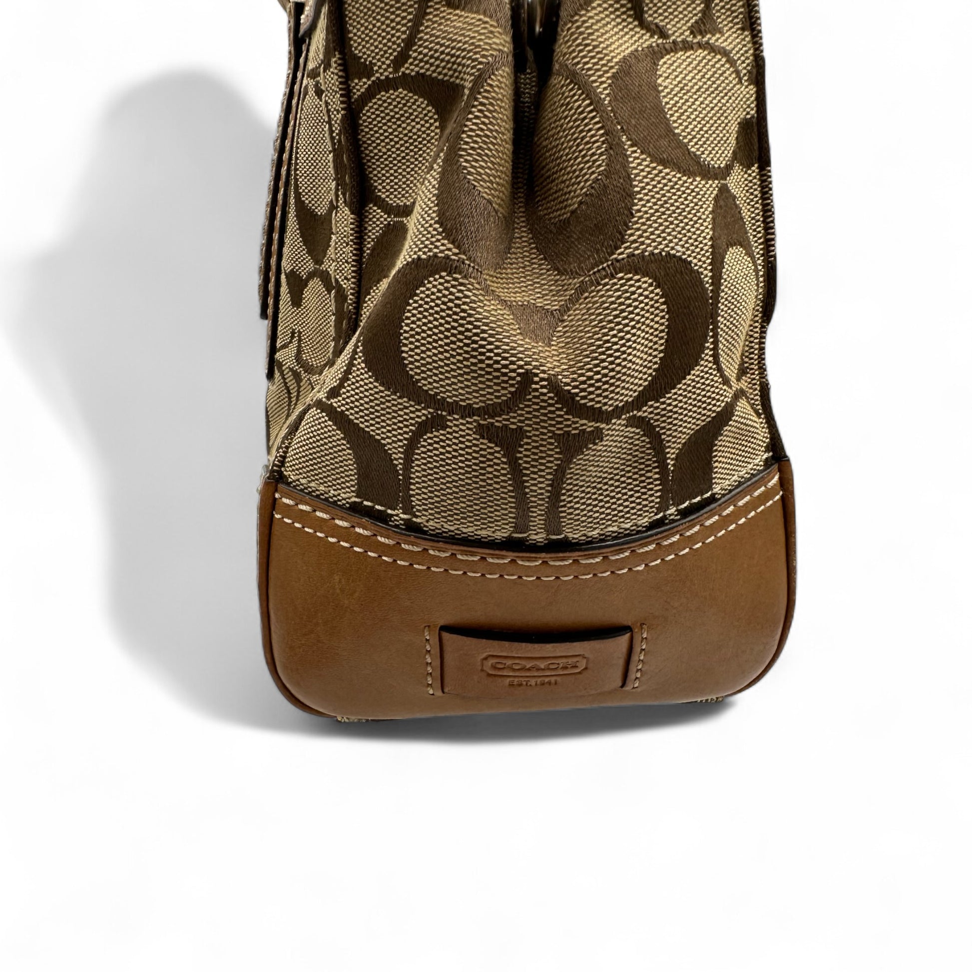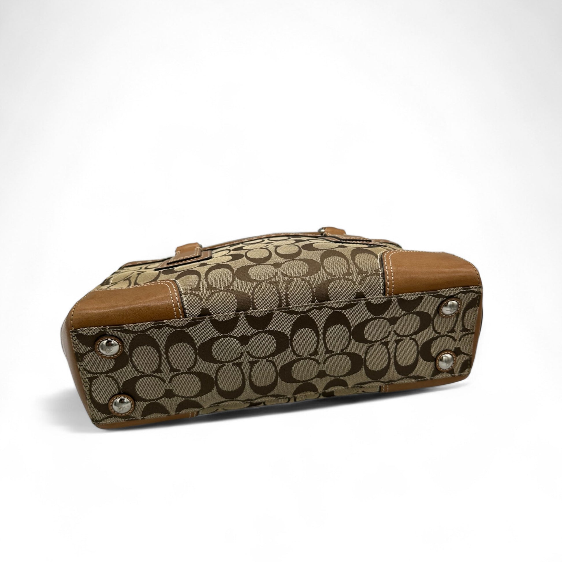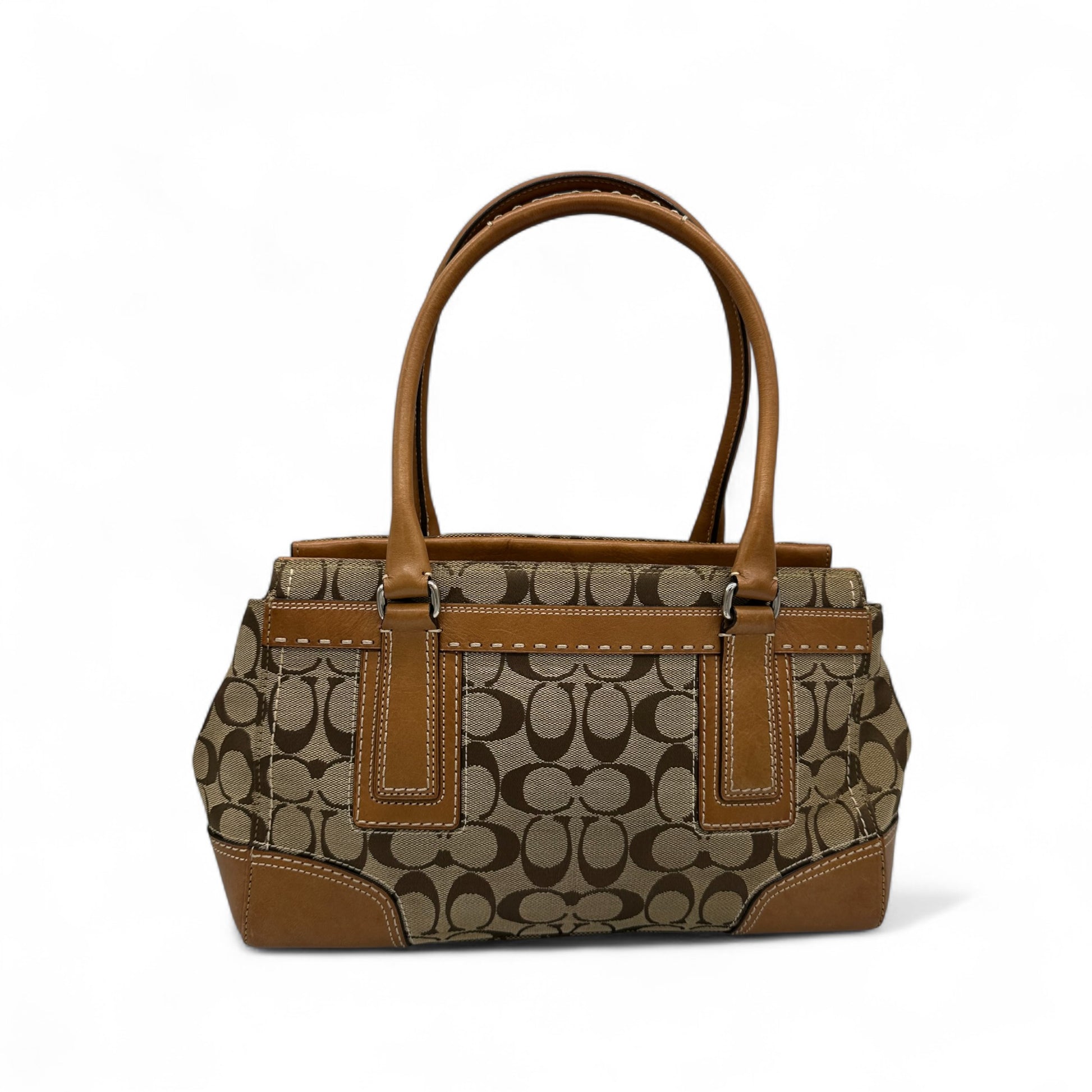 Model and style: Vintage Coach 11589 Turnlock Handbag. In brown and tan signature monogram, trimmed with tanned leather and silver turnlock hardware. A large tote style bag which can be used as a handbag or worn on the shoulder.