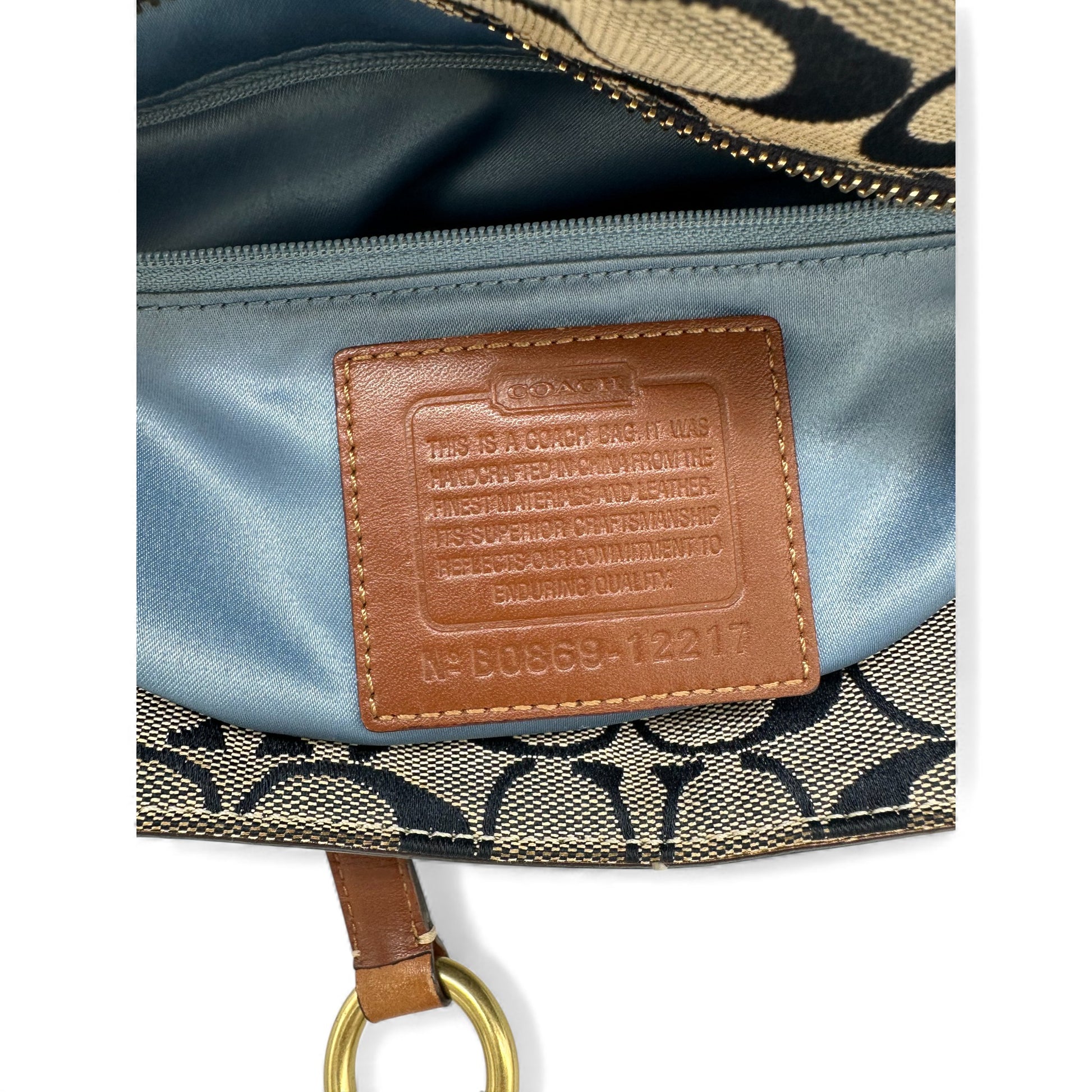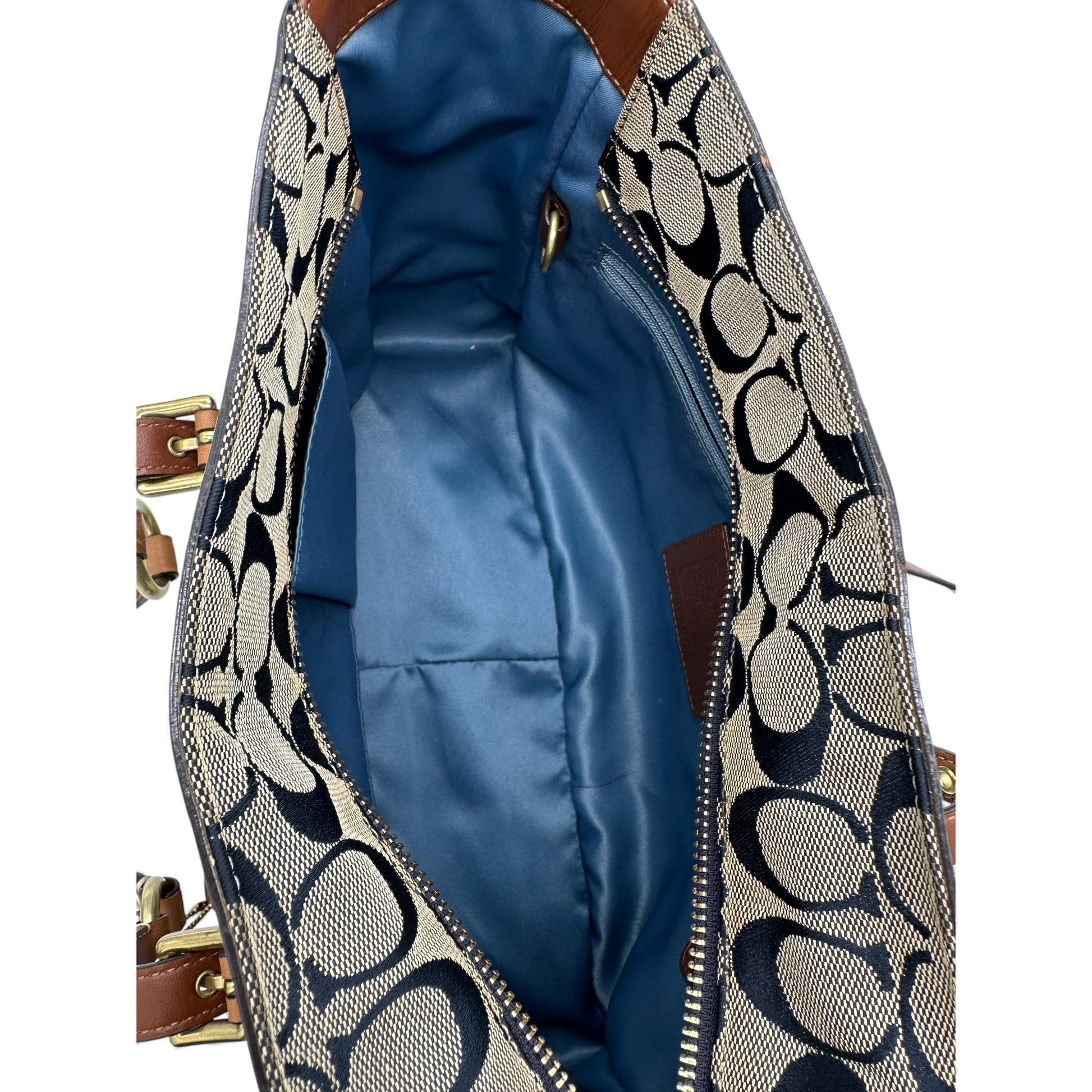 Vintage Coach 12217 Tote Shoulder Bag from 2008. In rare denim patchwork design with monogram canvas , suede, and leather. Trimmed with brown leather and brass hardware. A Y2K piece from 2008.
