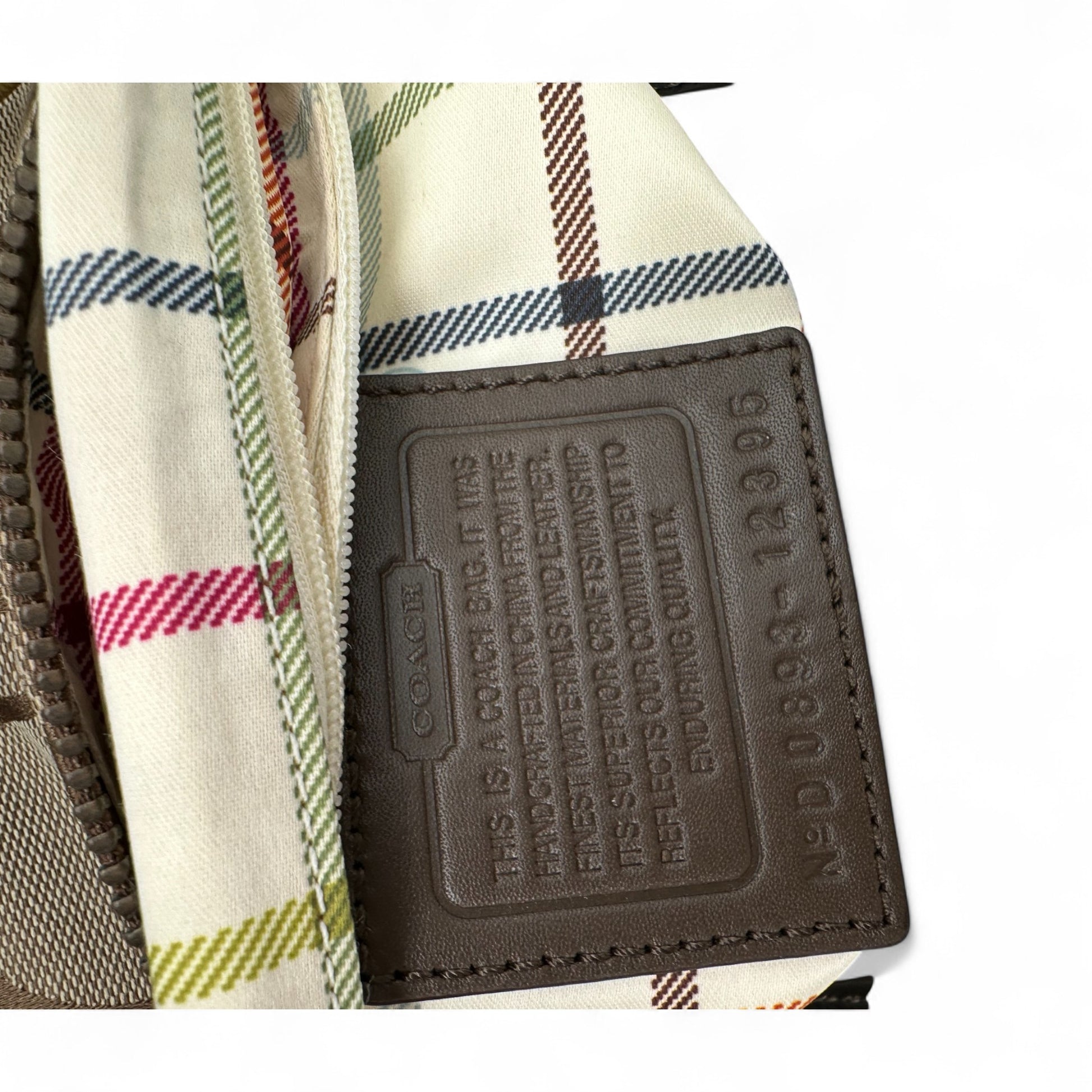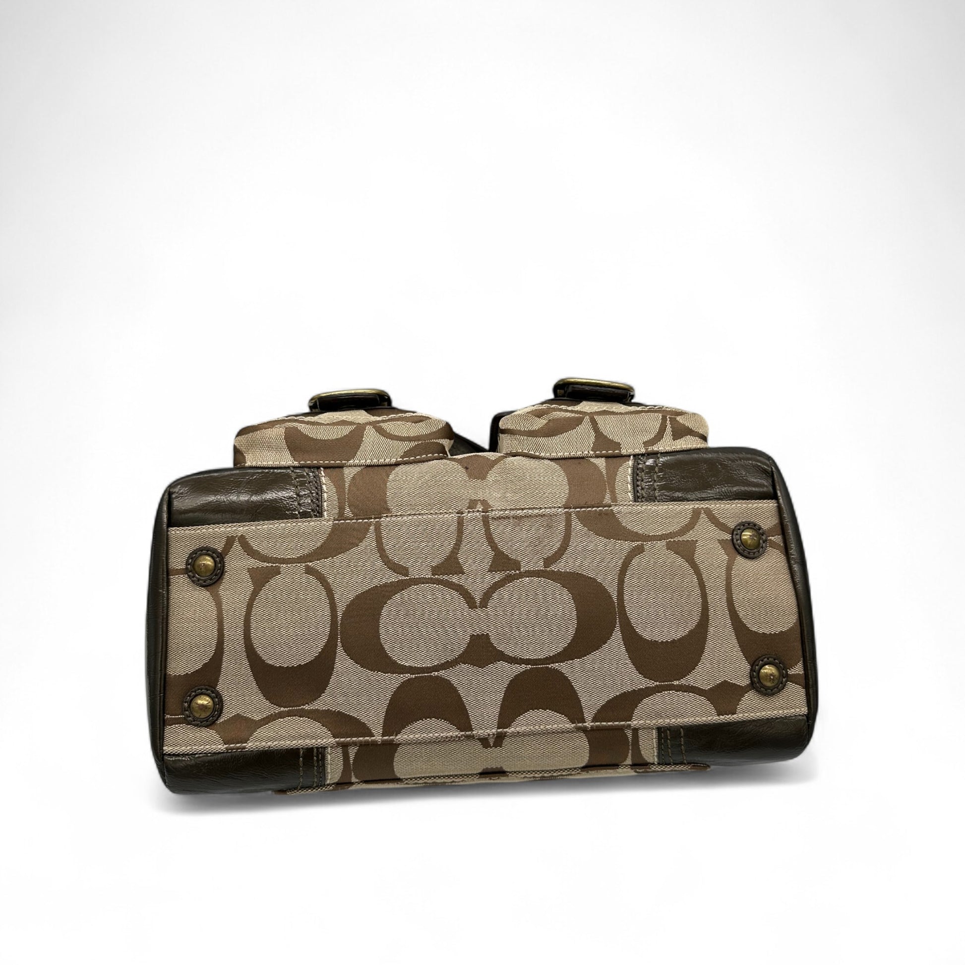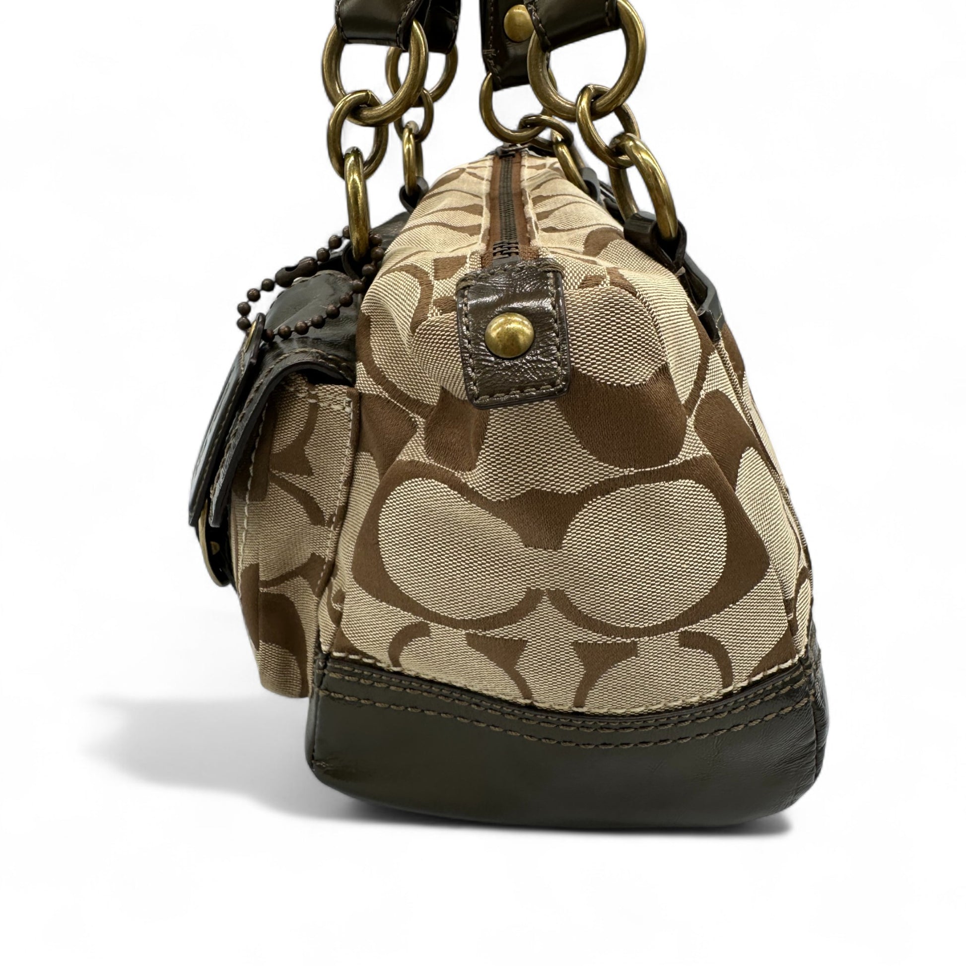 Model and style: Vintage Coach 12395 Bleecker Handbag in signature monogram with metallic leather trim and brass buckle hardware. An extremely rare Y2K piece from 2008.