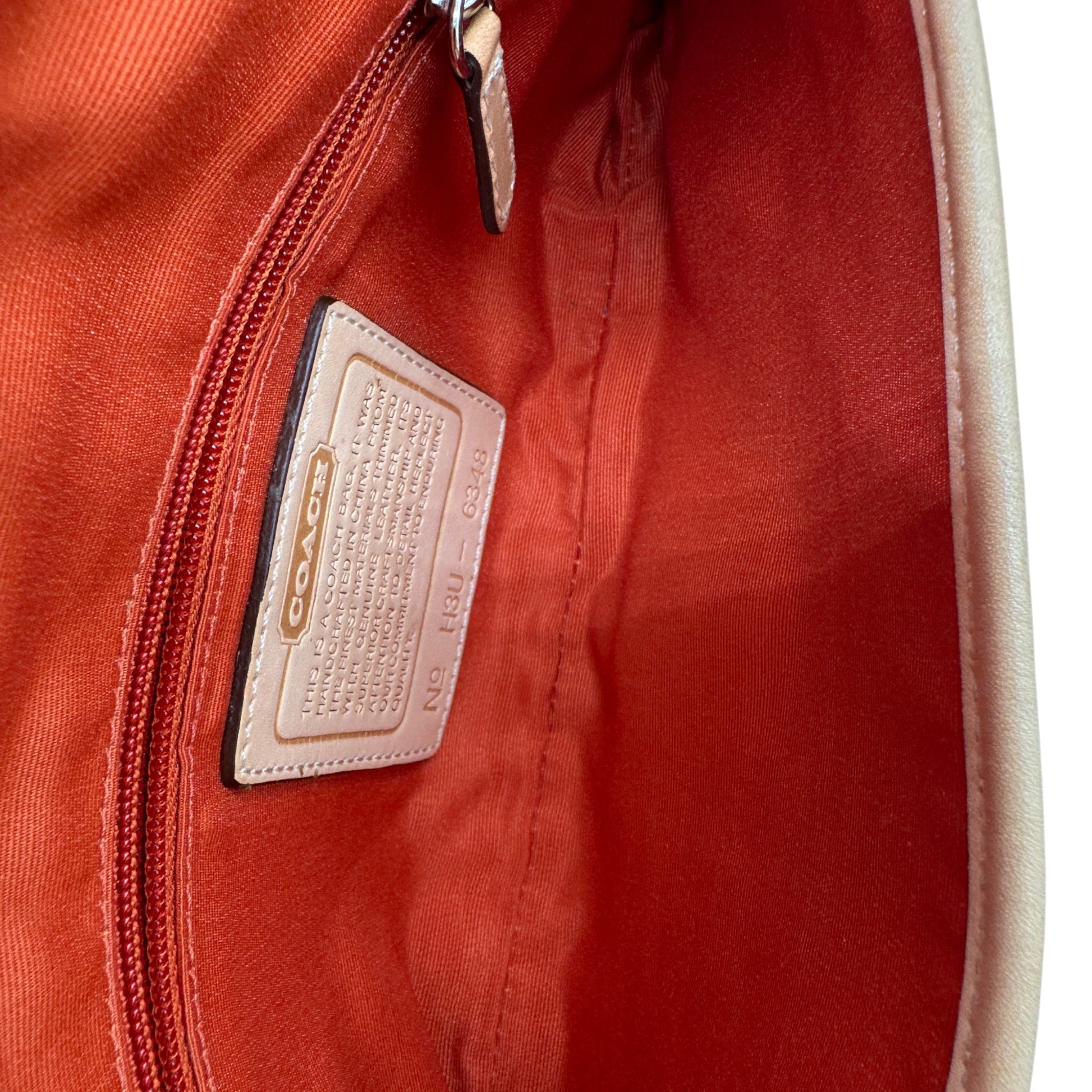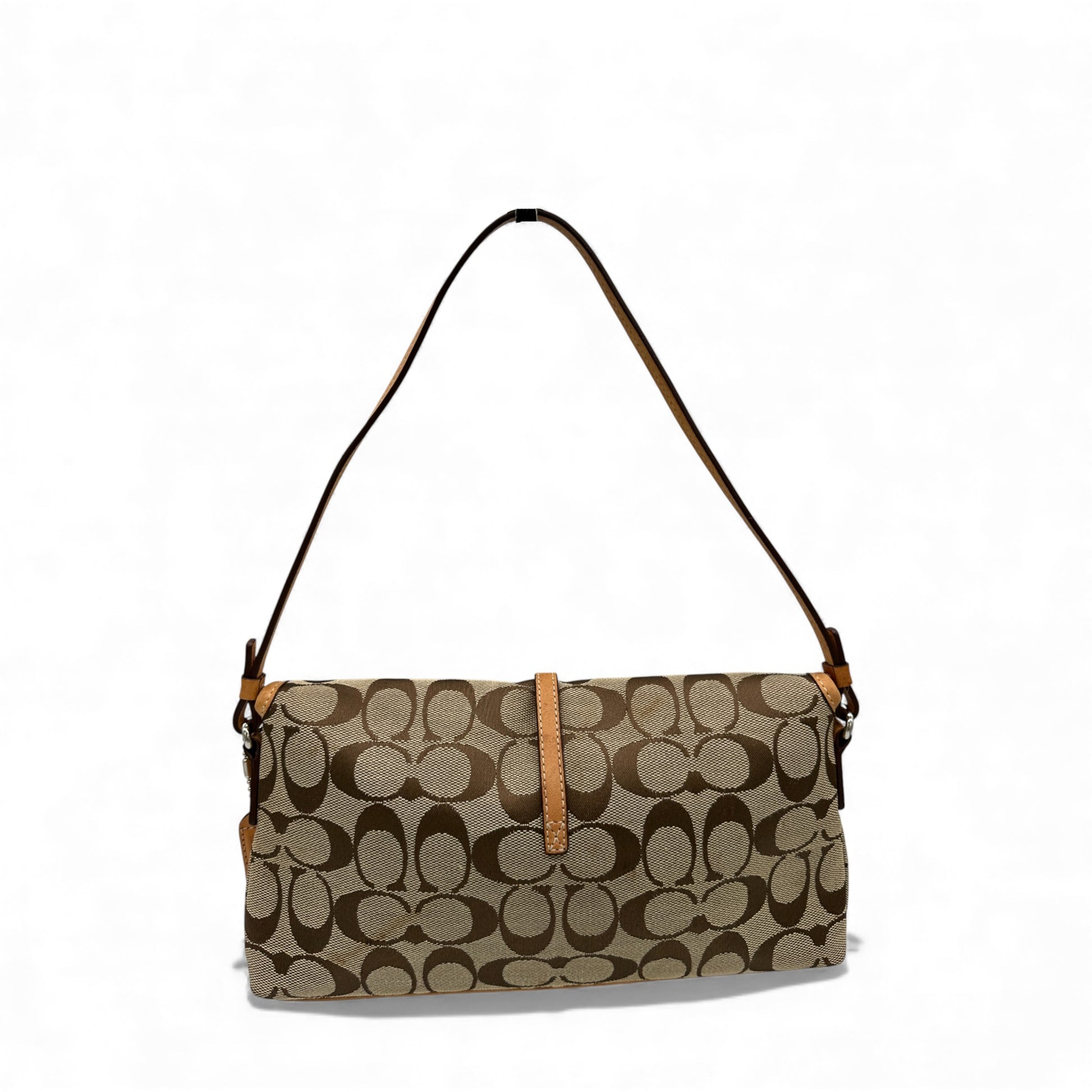 Model and style: Vintage Coach 6348 Hampton Clip Shoulder Bag in Beige Signature Monogram with Tan Leather Trim, a Y2K piece from 2003.