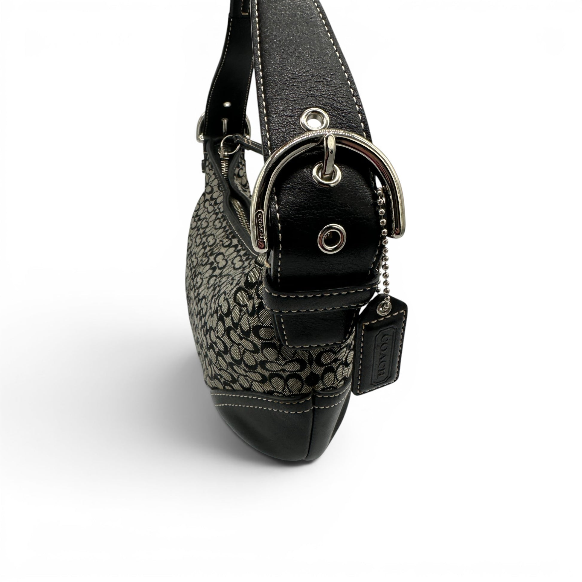 Vintage Coach 6351 Croissant Shoulder Bag in black and grey mini monogram, trimmed with black leather and silver-tone soho buckle hardware. Croissant shaped, slouchy half moon style that is perfect for comfortably wearing on the shoulder. A Y2K piece from 2003.