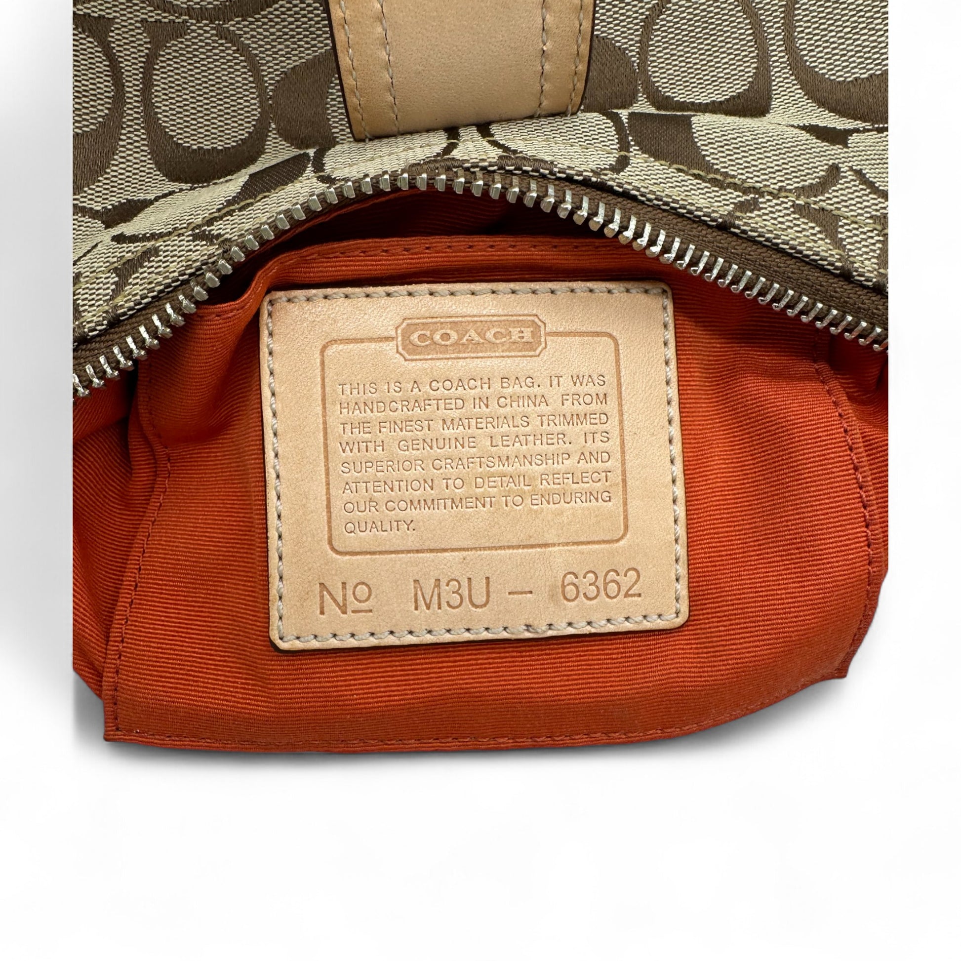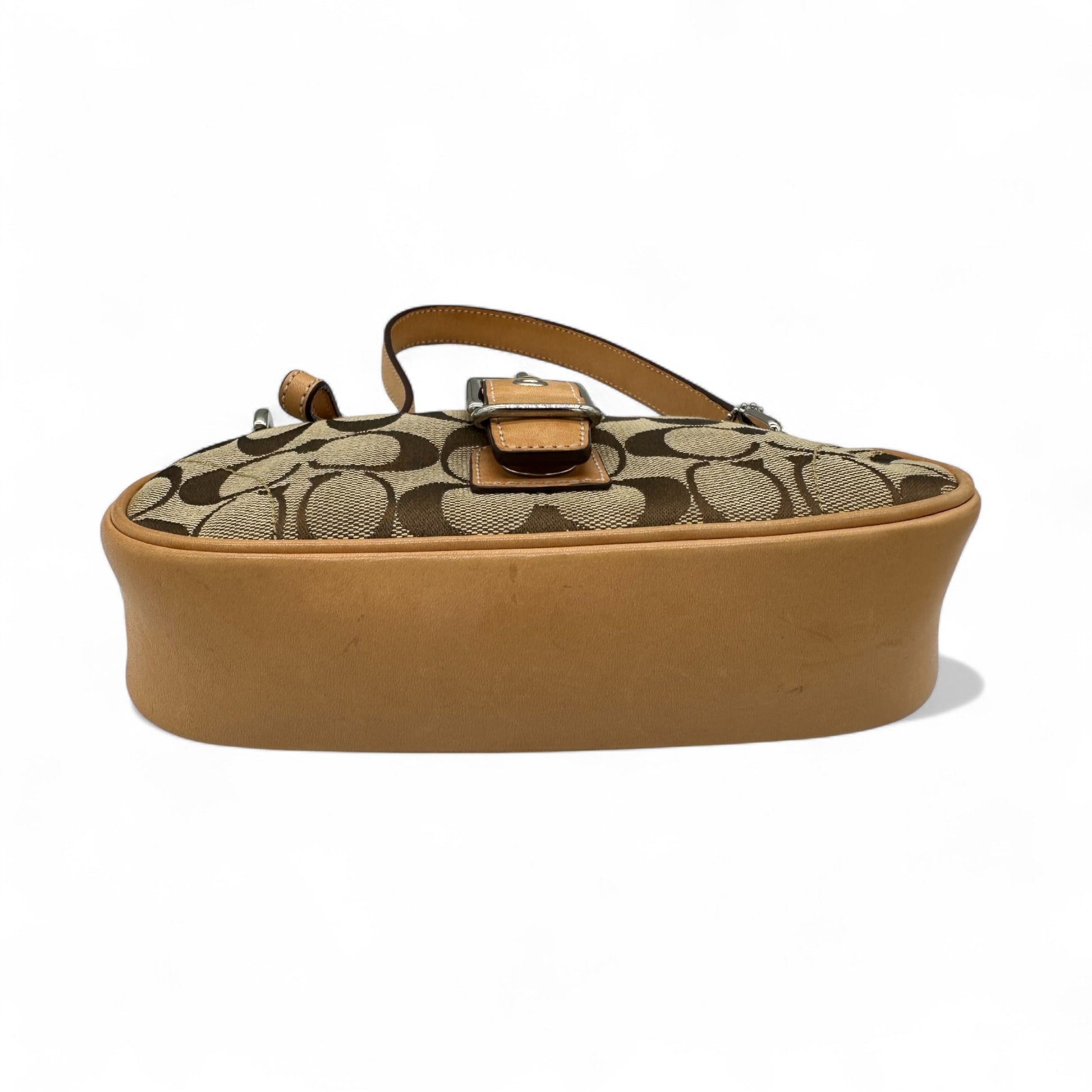 Model and style: Vintage Coach 6362 Mini Soho Shoulder Bag. In brown and beige signature monogram, trimmed with tan leather and silver Y2K style buckle hardware.