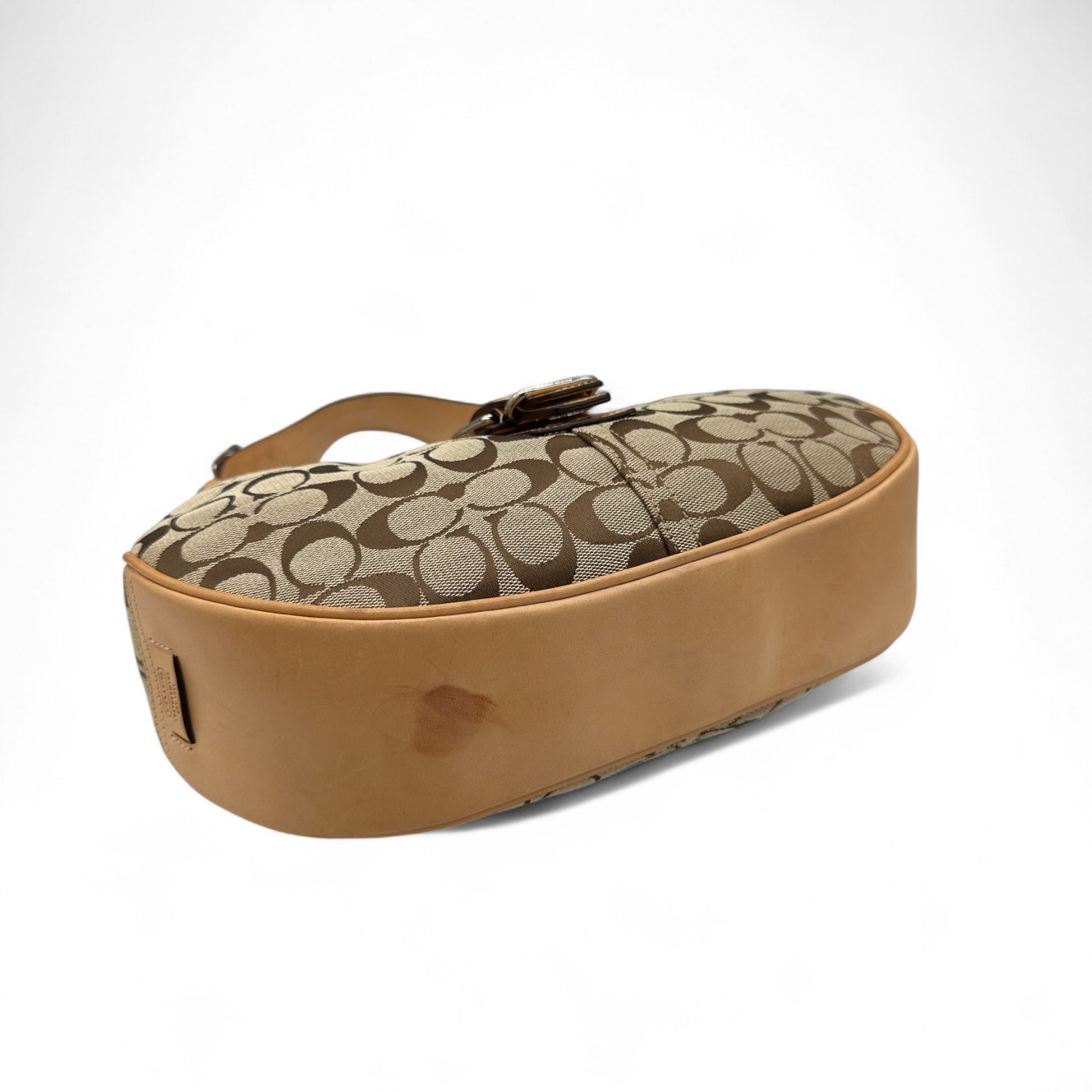 Model and style: Vintage Coach 6363 Soho Crescent Shoulder Bag. In brown and beige signature monogram, trimmed with tan leather. This half-moon shaped vintage Coach bag is perfect for shoulder wear.