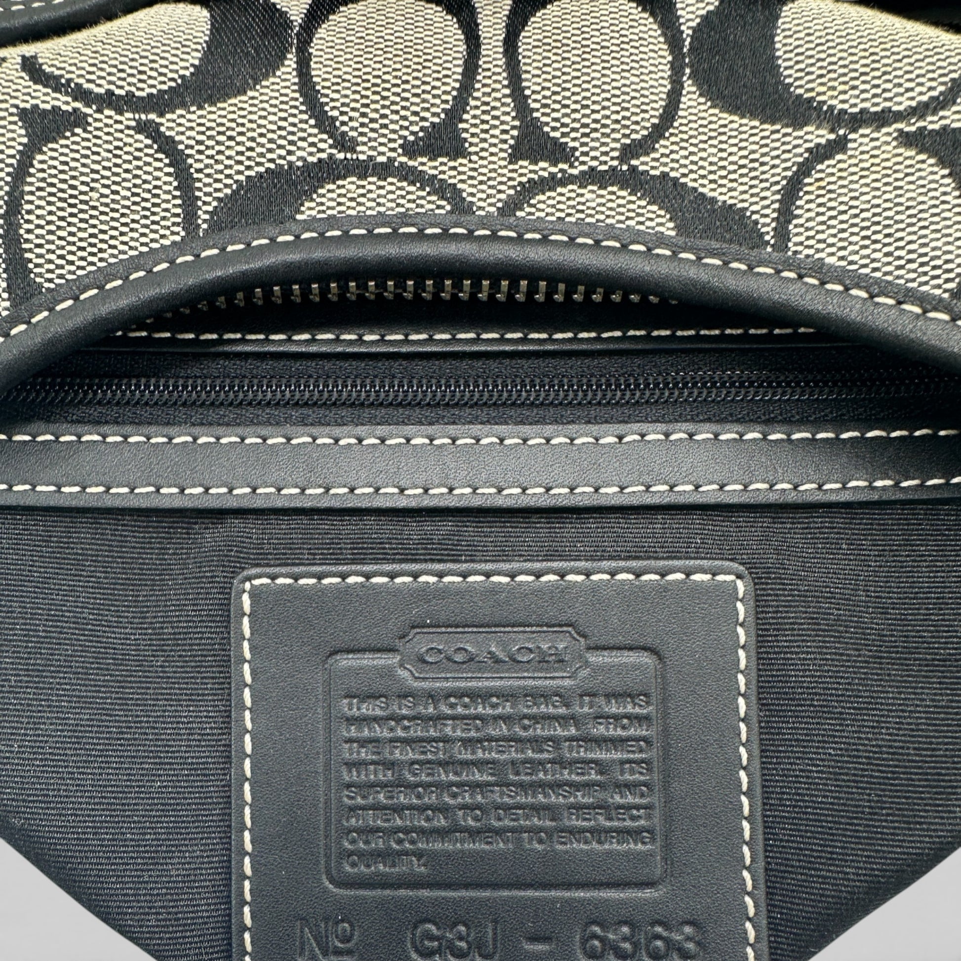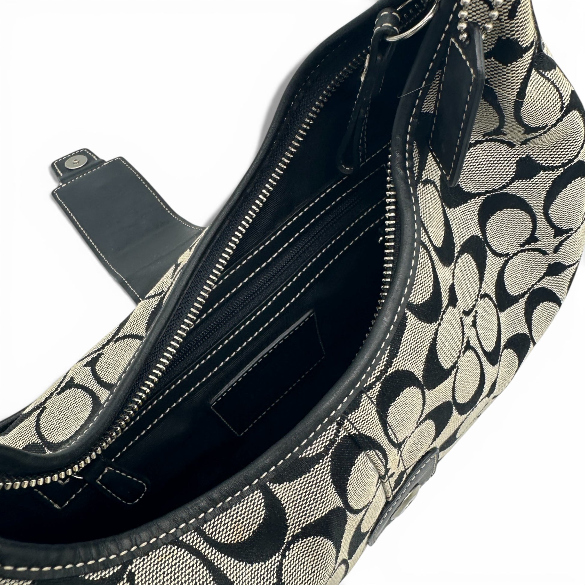 Vintage Coach 6363 Soho Crescent Shoulder Bag. In black and grey signature monogram, trimmed with black leather and silver toned hardware. This half-moon shaped vintage Coach bag is perfect for shoulder wear. A Y2K piece from 2003.