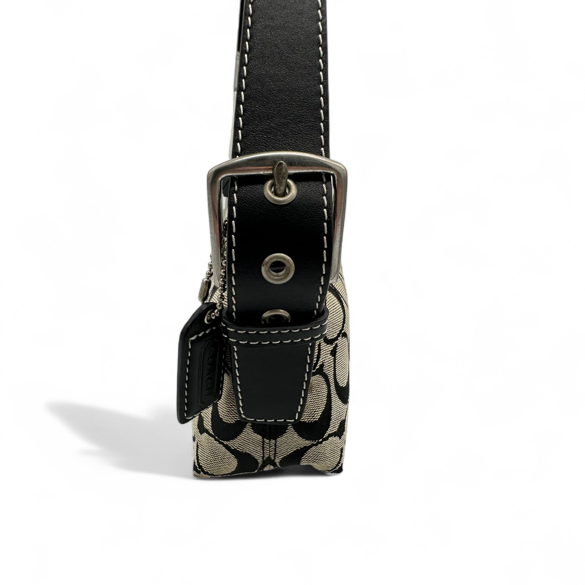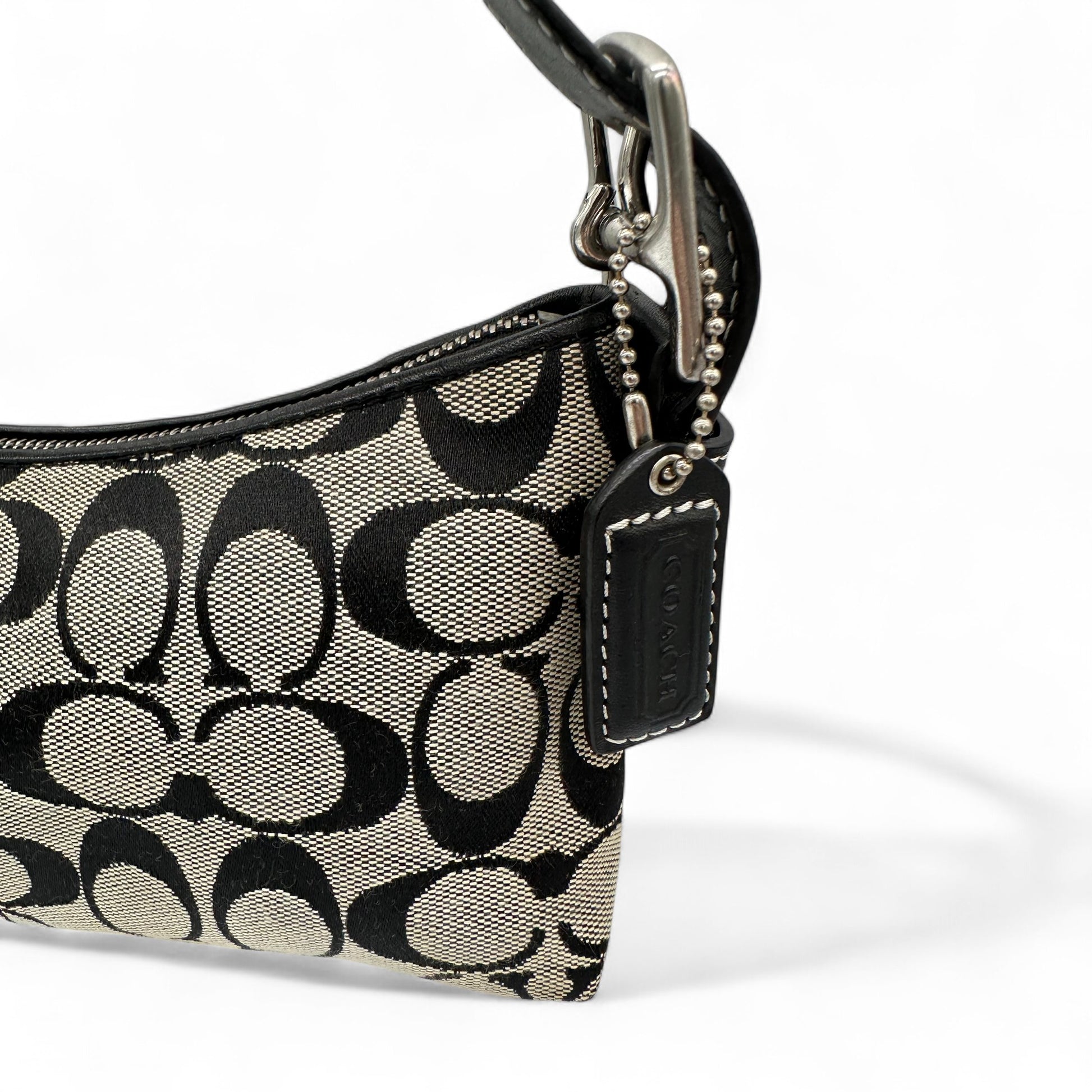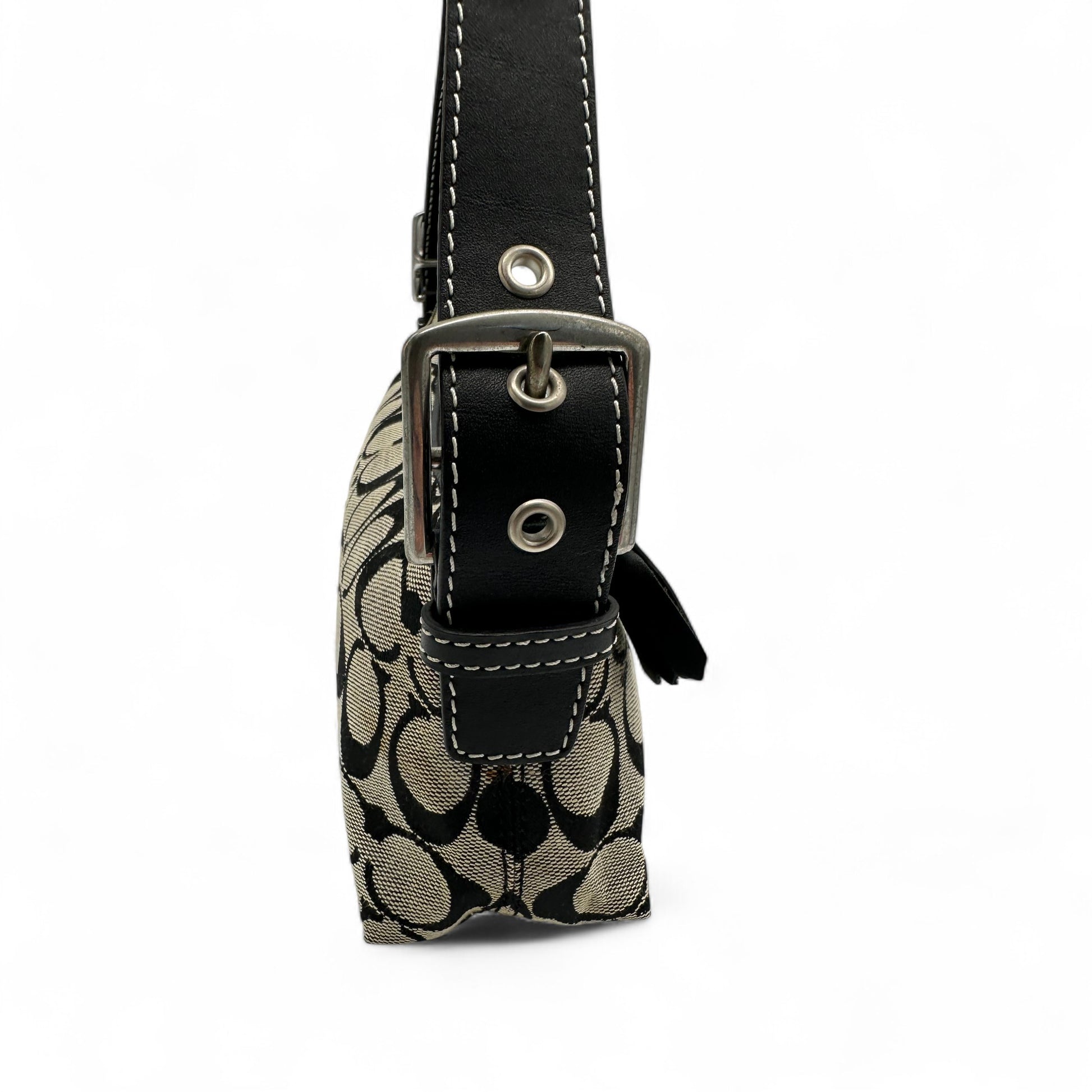 Model and style: Vintage Coach 6371 East West Baguette Shoulder Bag in black and grey signature monogram with black leather trim and silver hardware. A Y2K piece from 2004.