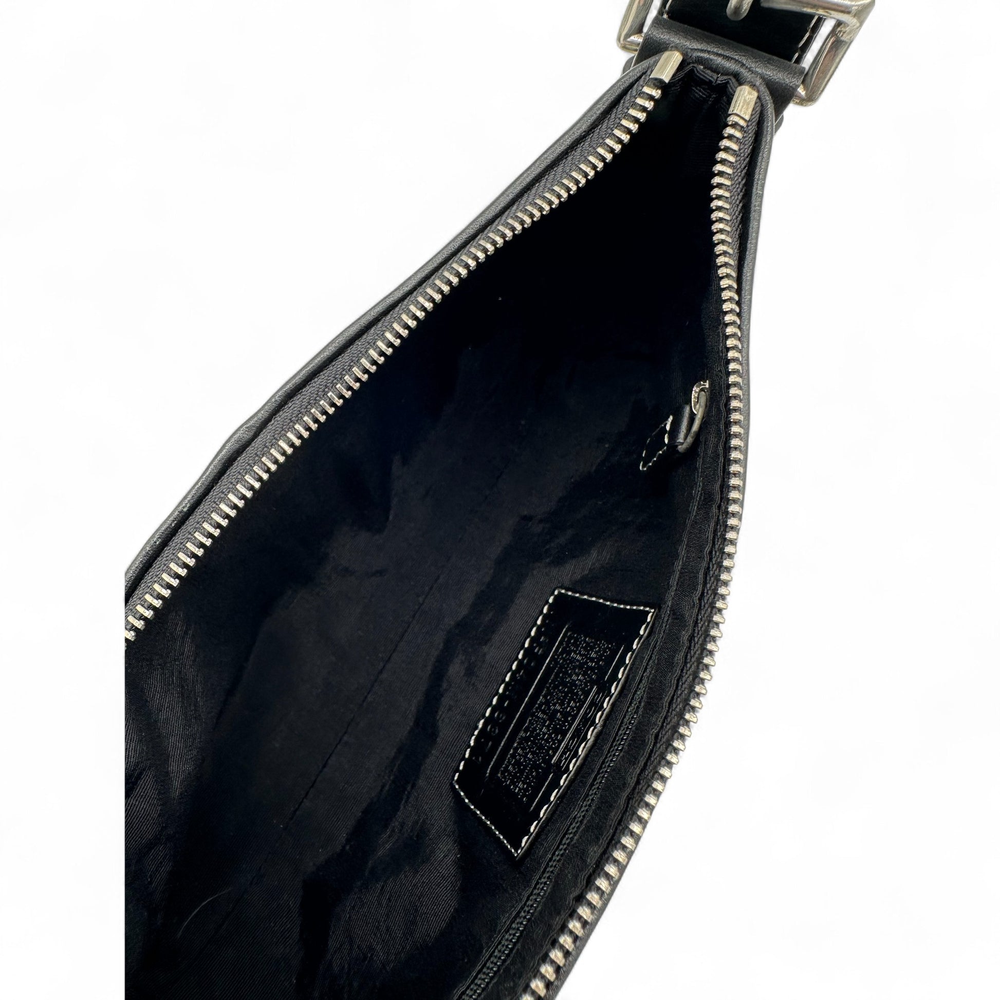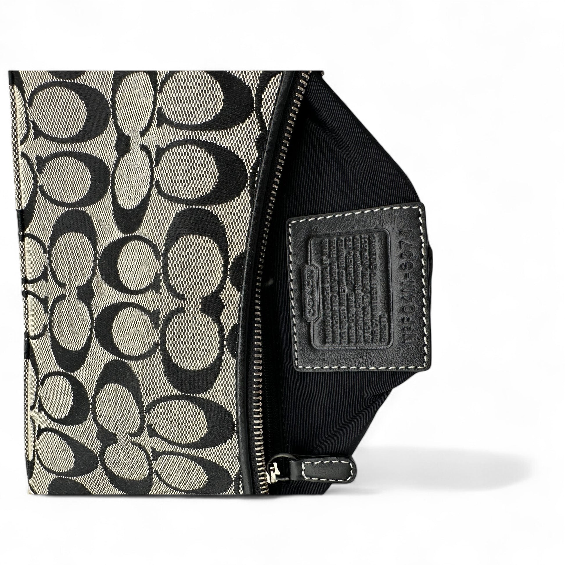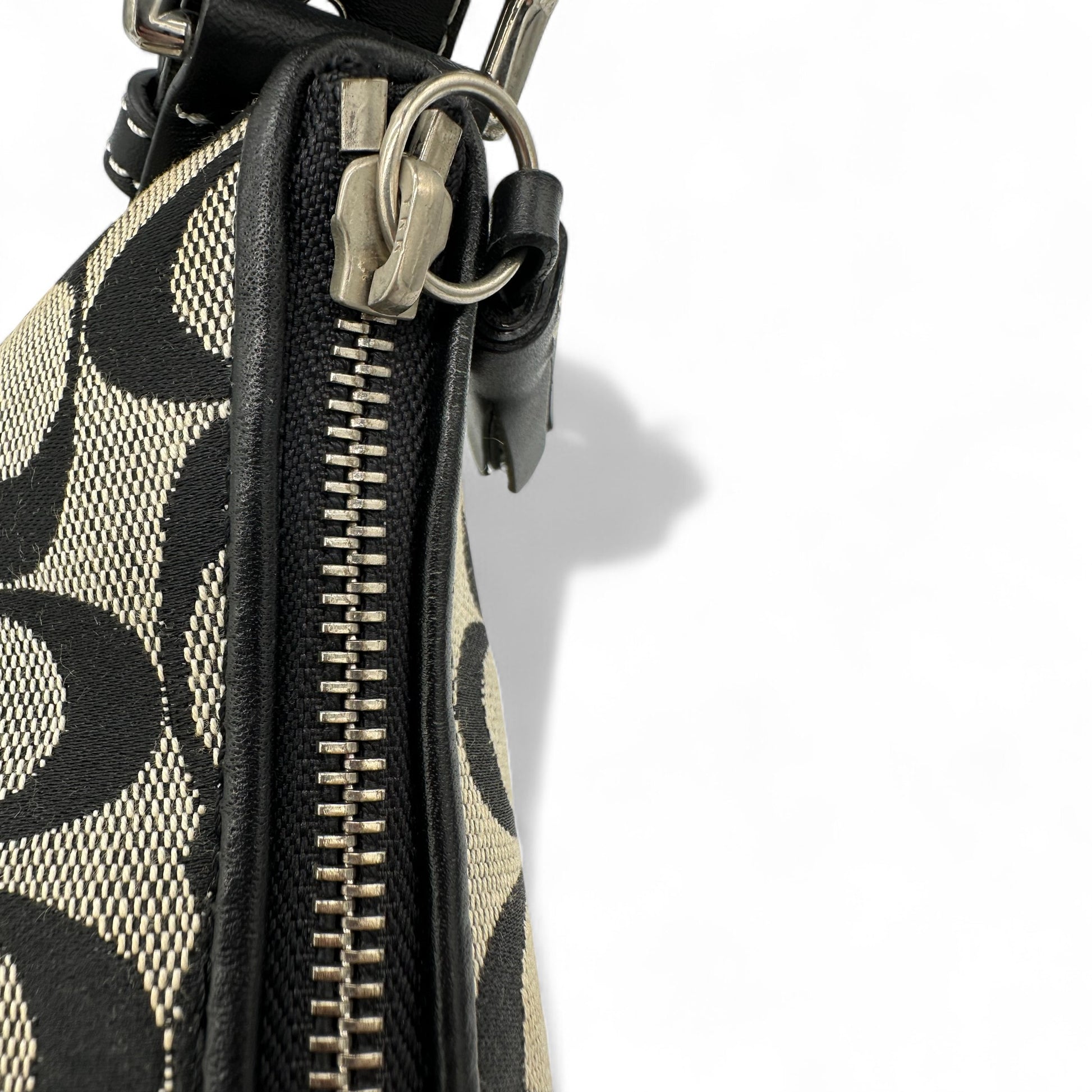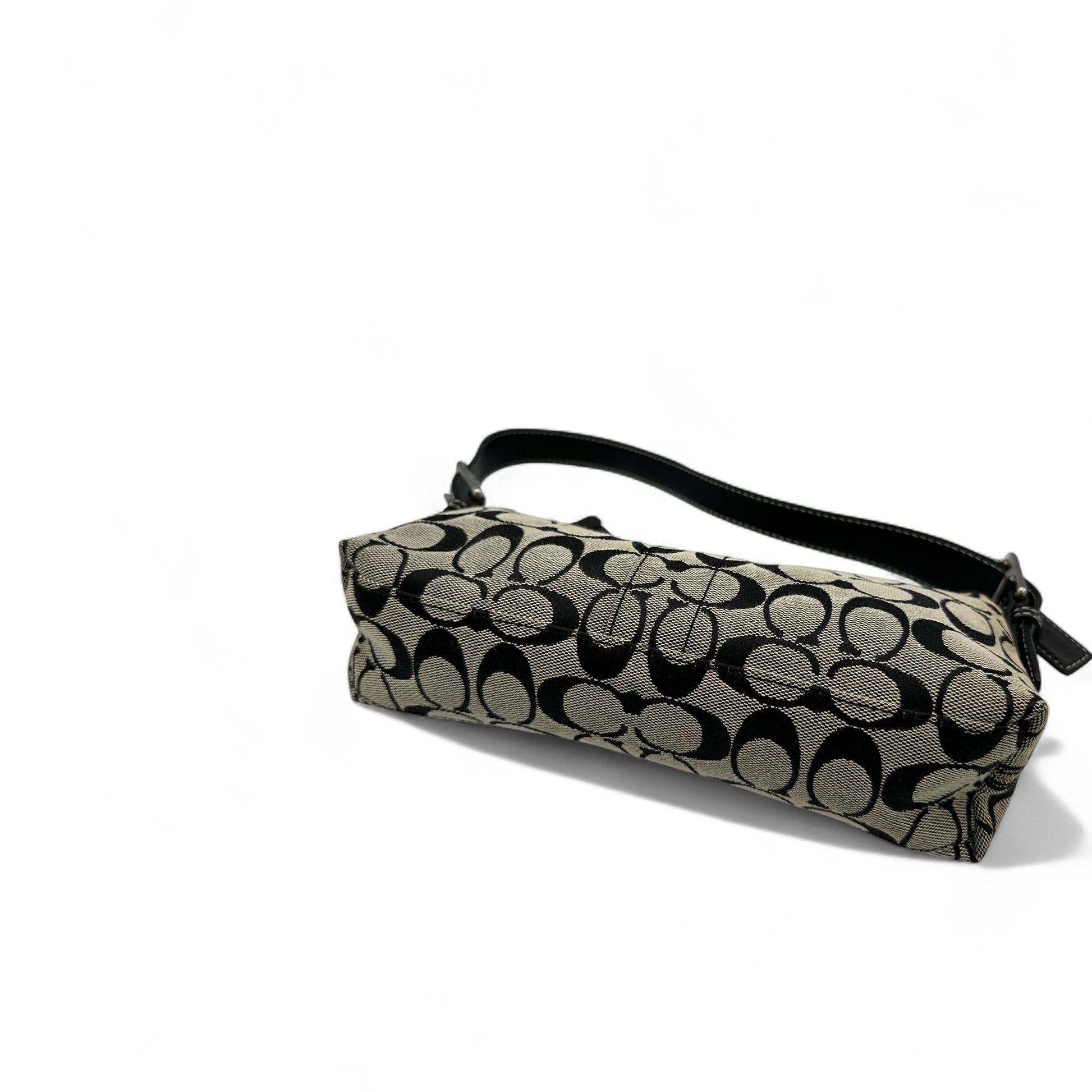 Model and style: Vintage Coach 6371 East West Baguette Shoulder Bag in black and grey signature monogram with black leather trim and silver hardware. A Y2K piece from 2004.