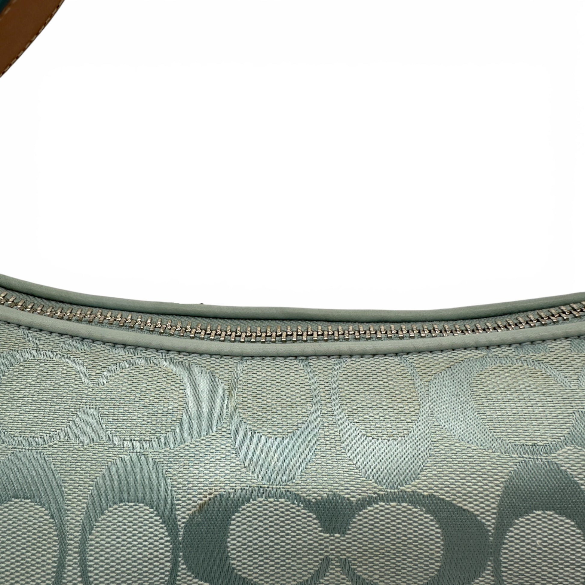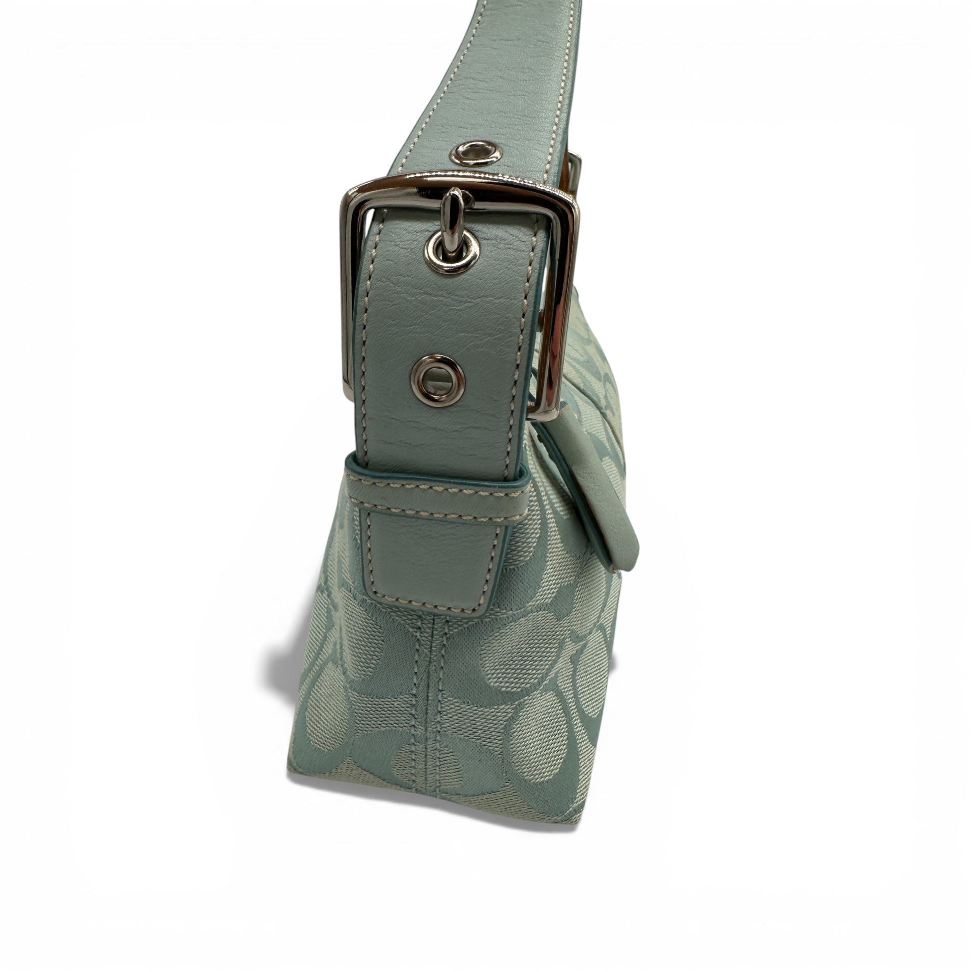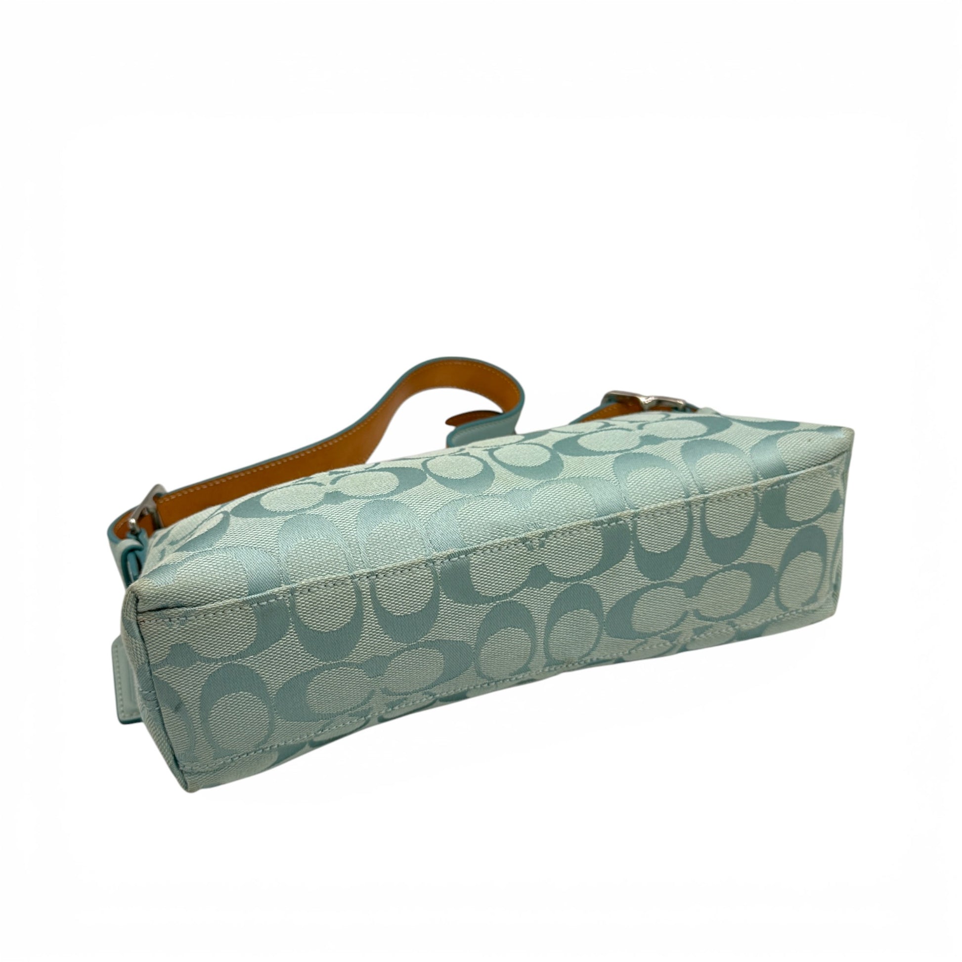 Vintage Coach 6371 East West Baguette Shoulder Bag. In turquoise signature monogram, trimmed with turquoise leather and silver-tone hardware. A Y2K piece from 2004
