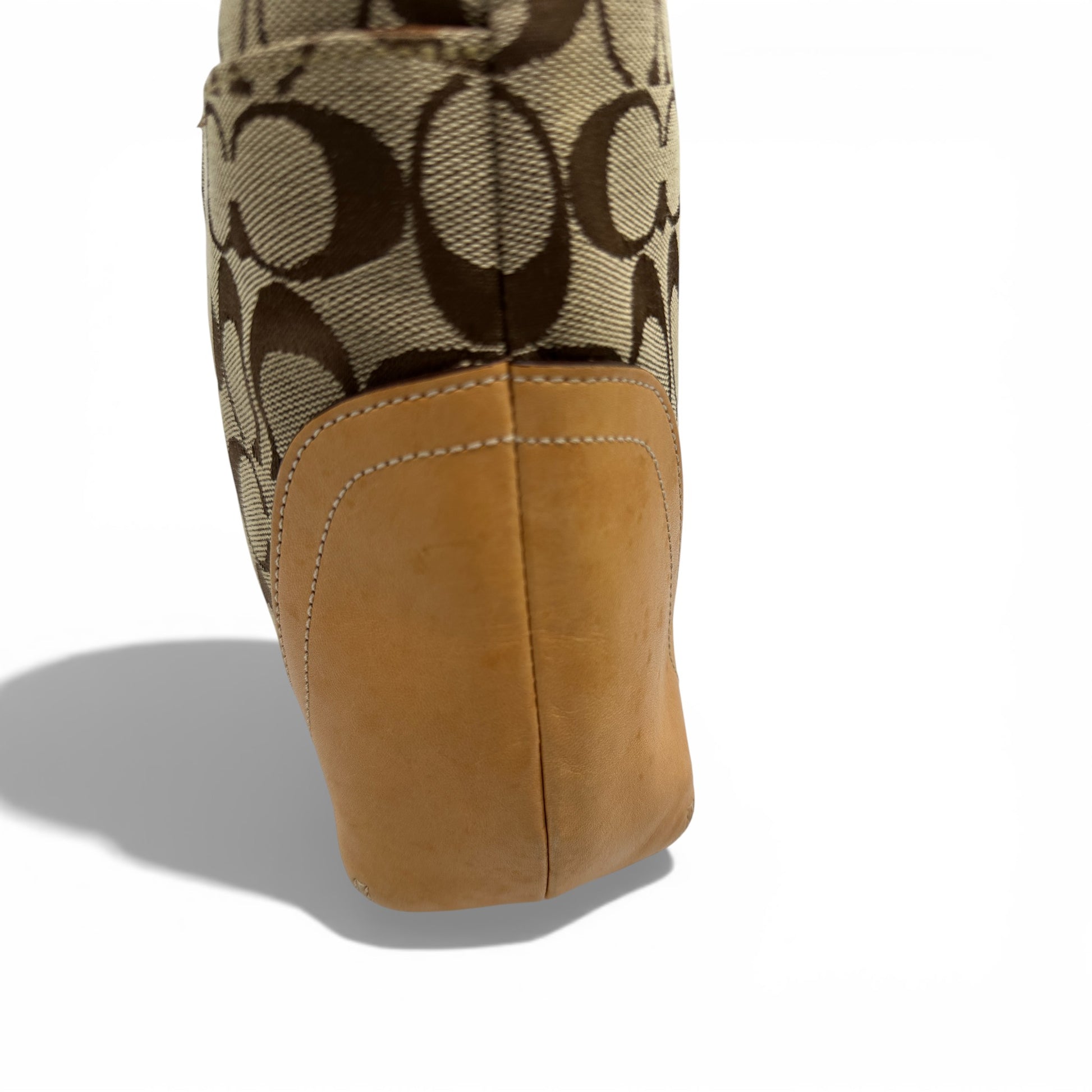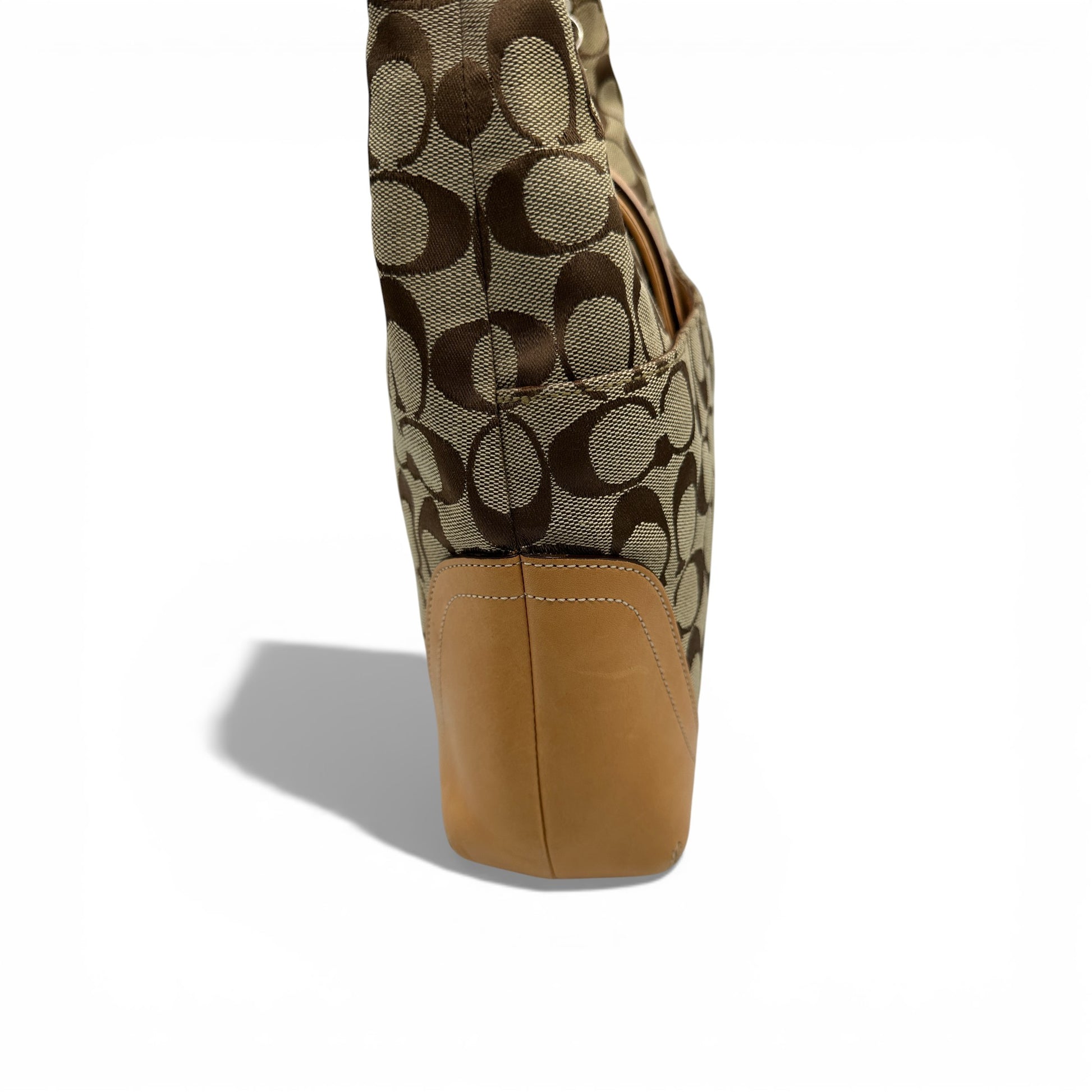 Vintage Coach 6824 Soho Shoulder Bag in brown and beige signature monogram. With tan leather trim and silver coloured-tone buckle hardware. A Y2K piece from 2004.