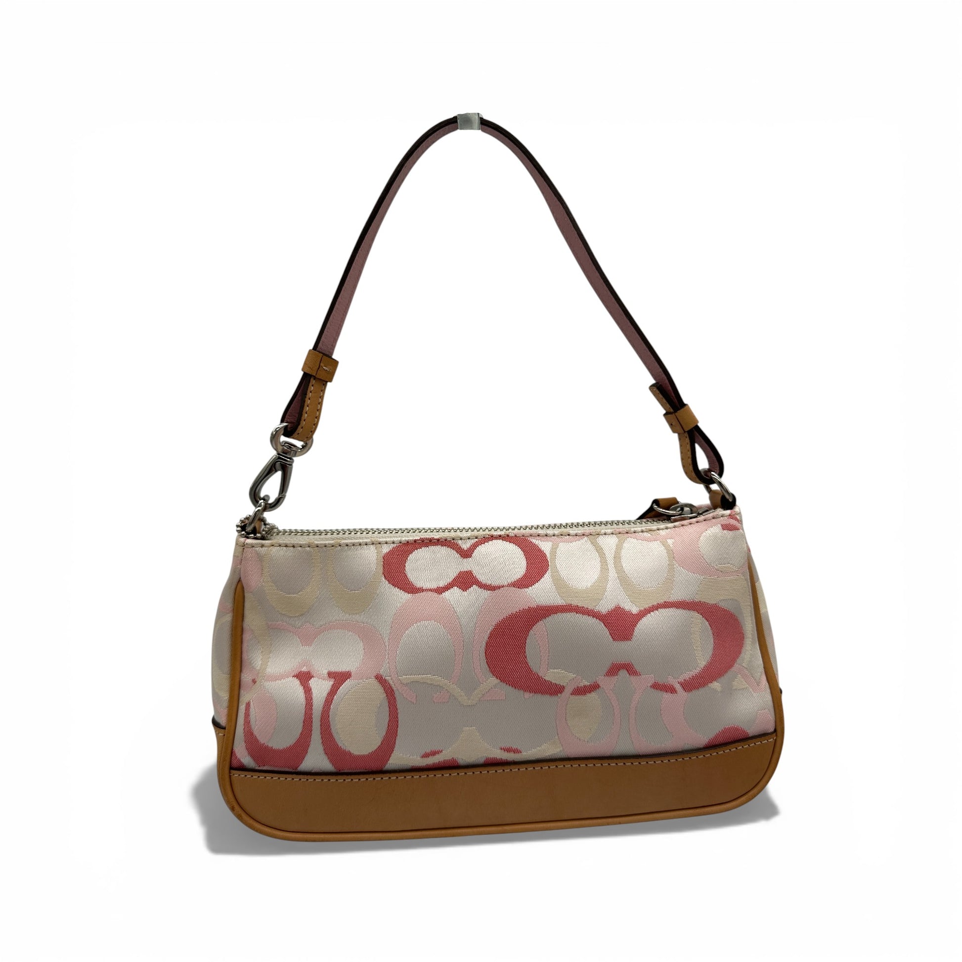 Vintage Coach 7027 Demi Shoulder Bag. In rare white and pink monogram, trimmed with tan leather. The perfect sized shoulder hugging mini bag. A Y2K piece from 2004.