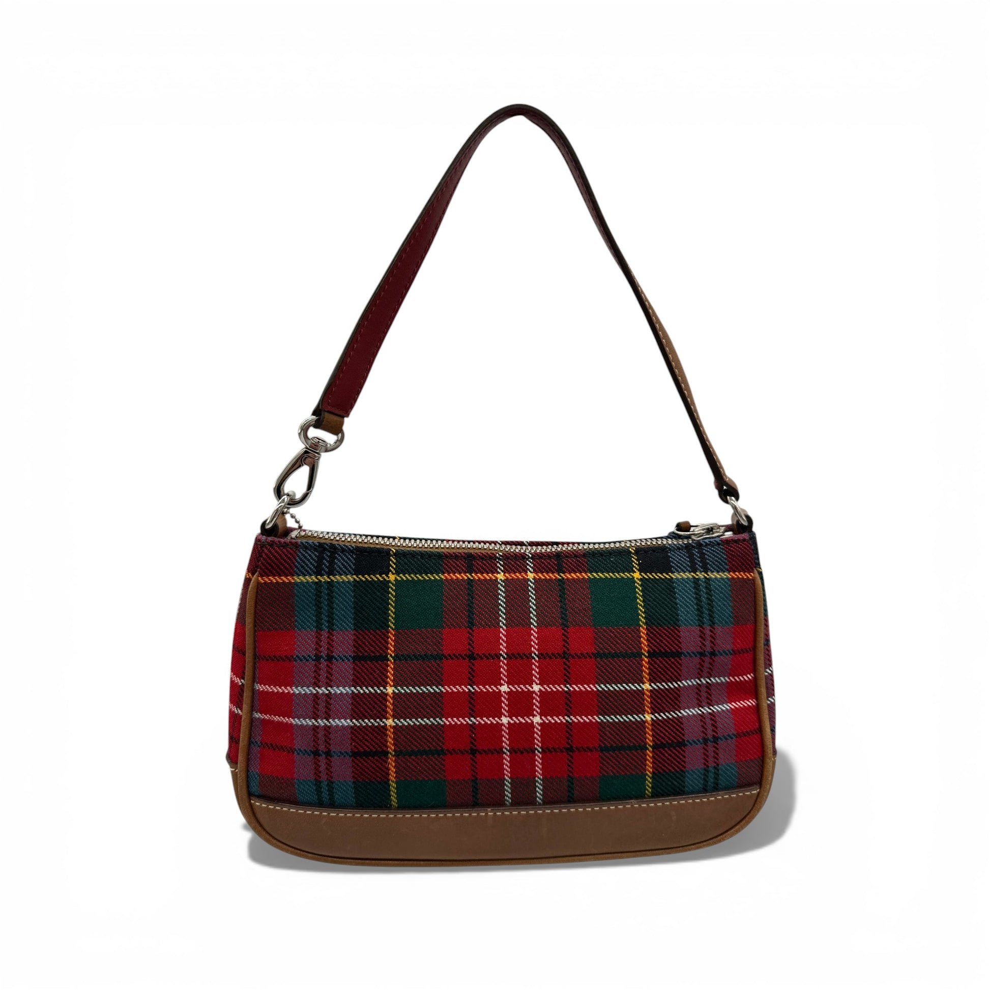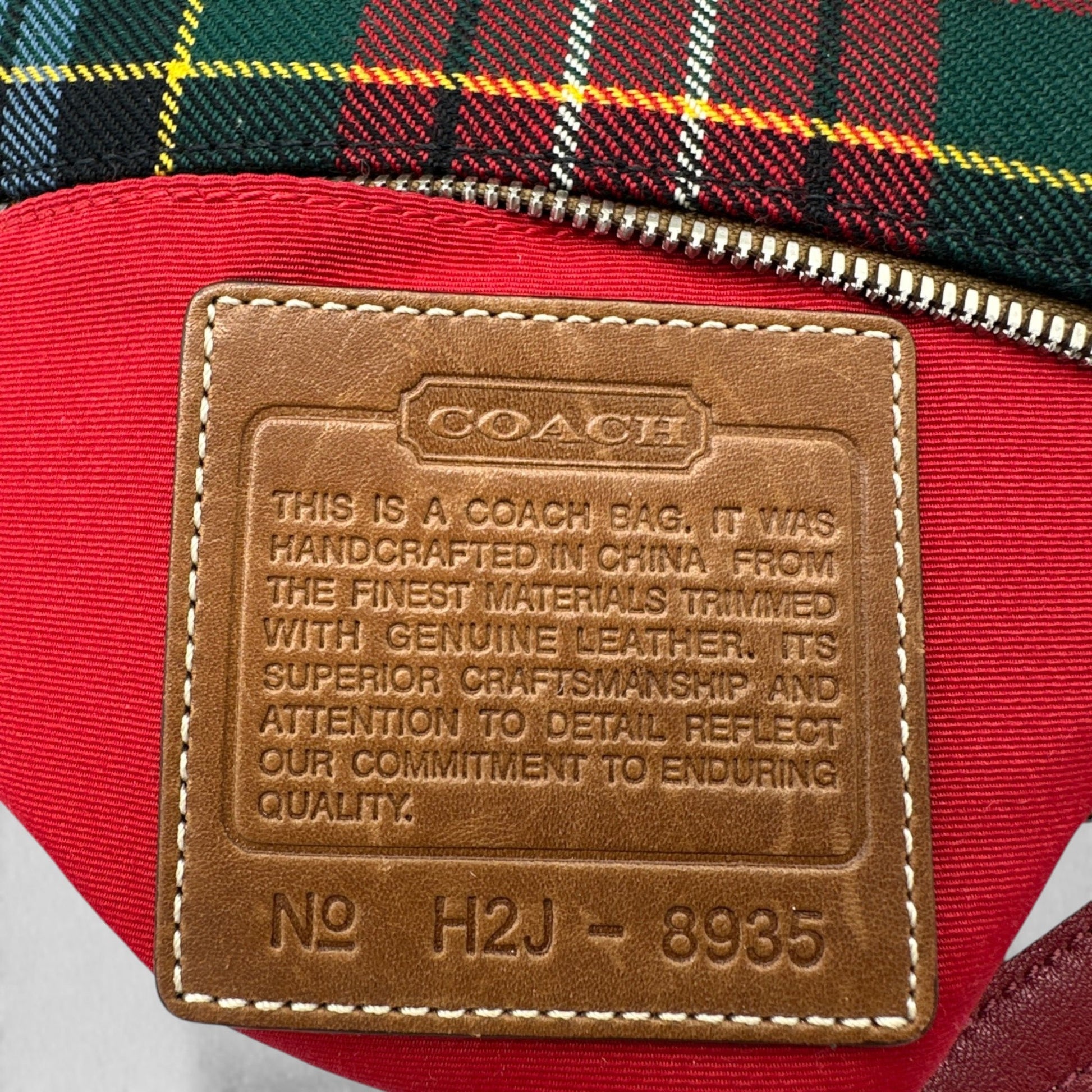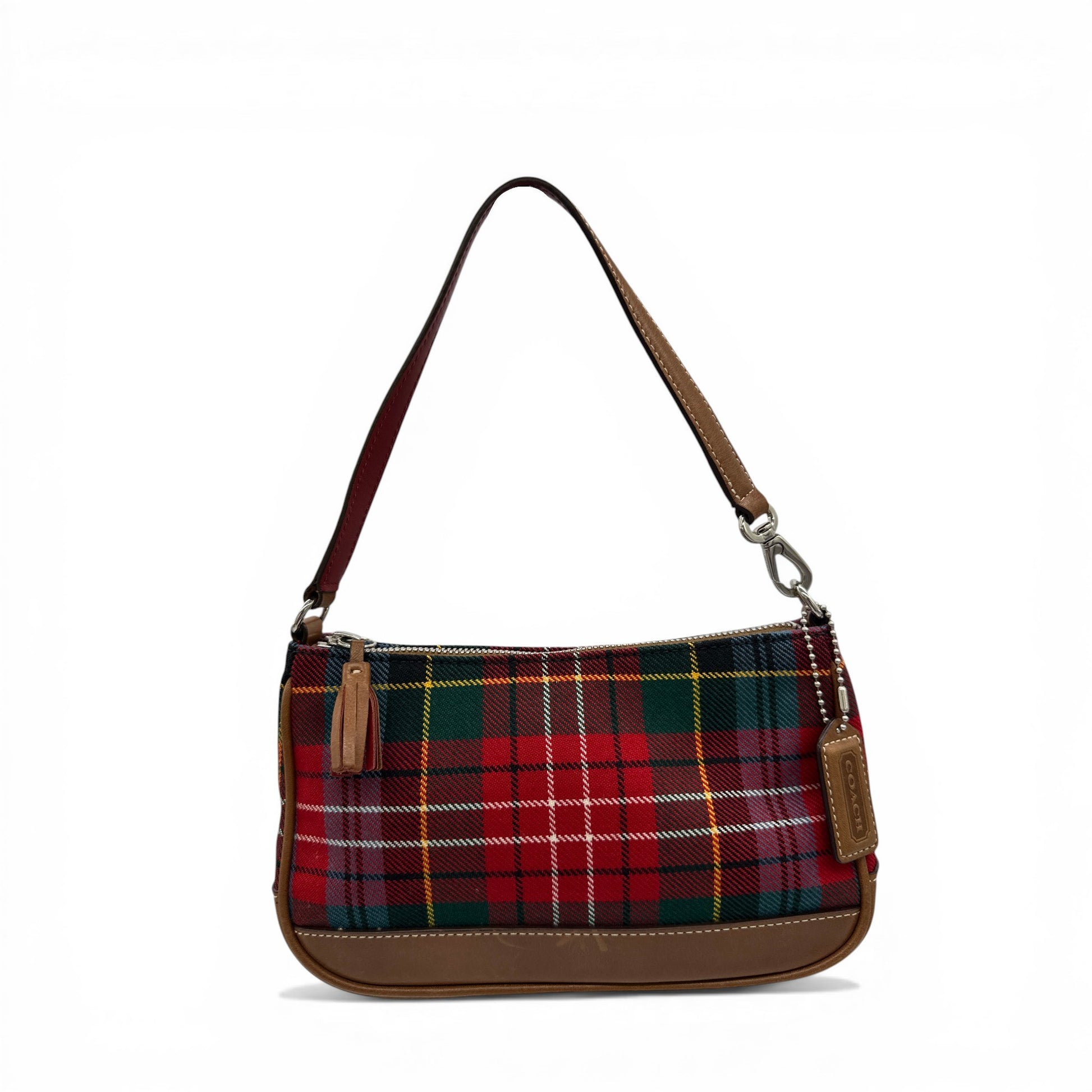 Vintage Coach 8935 Tartan Demi Shoulder Bag. In rare red and green tartan cloth, trimmed with brown cowhide leather. A rare Y2K piece from 2002.