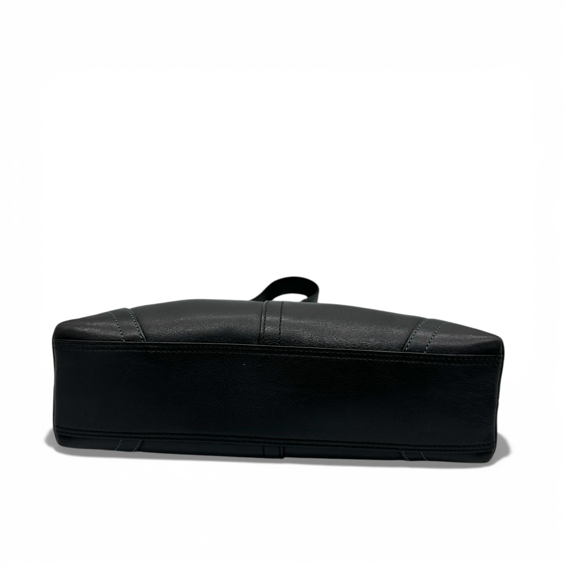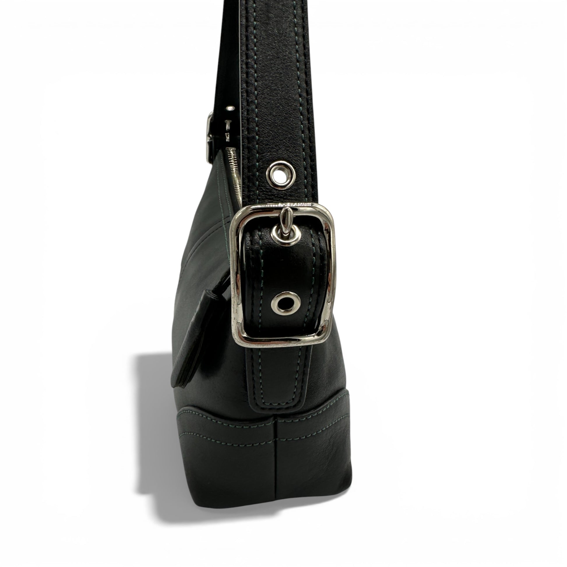Vintage Coach 8A64 Baguette Shoulder Bag. A Y2K piece from 2005. In black natural cowhide leather, with silver-tone hardware and teal stitching, lined with black signature monogram lining.