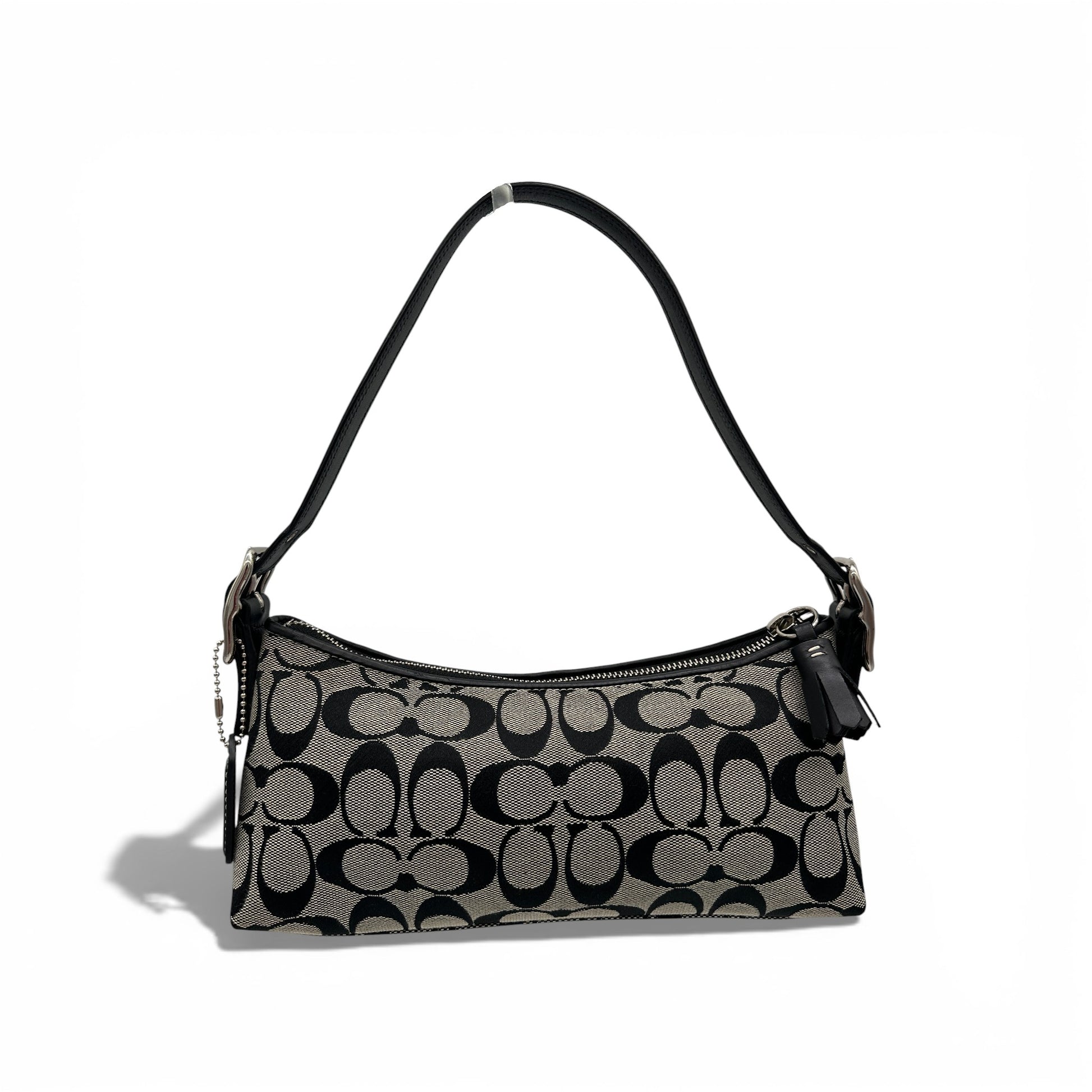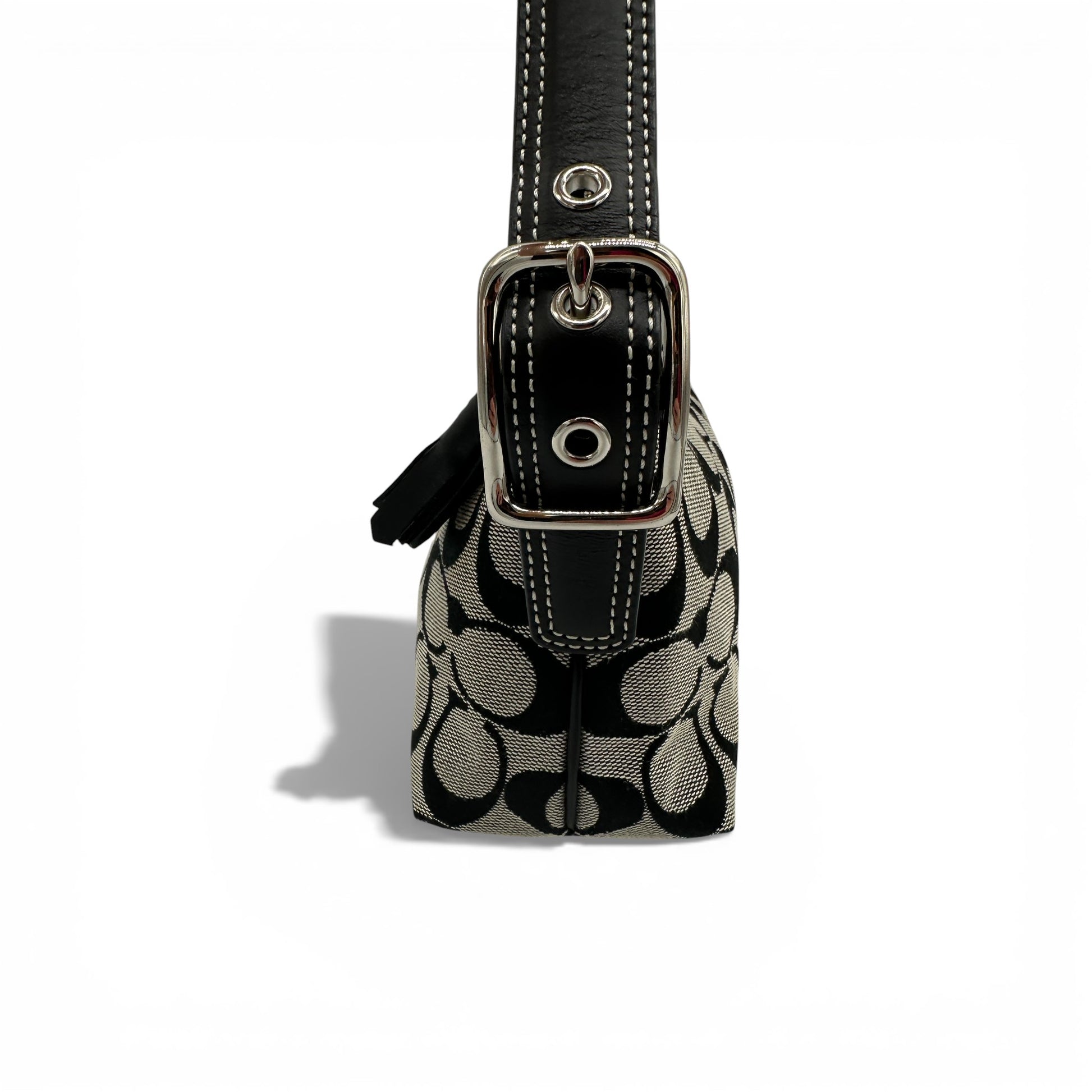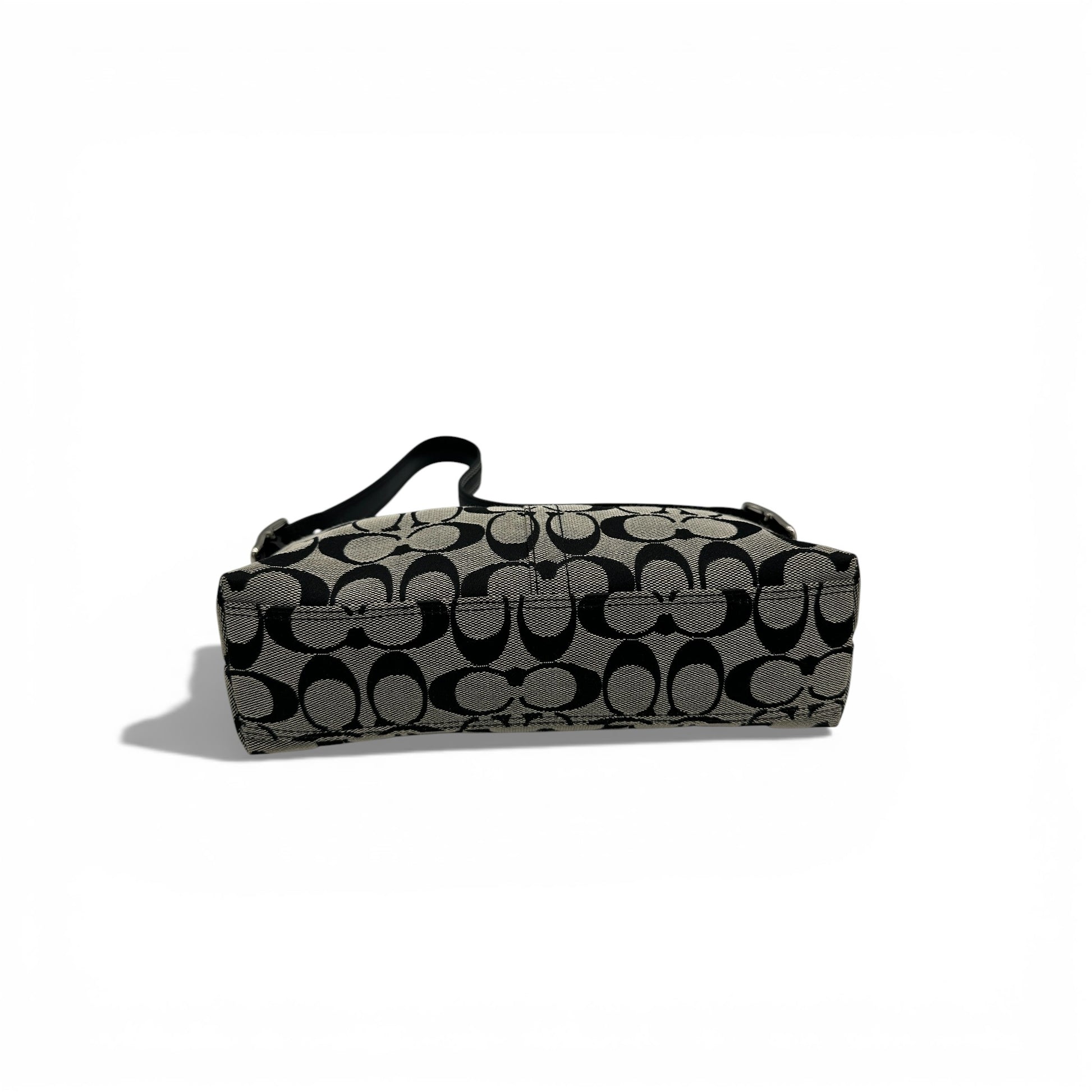 Vintage Coach 8K01 East West Baguette Shoulder Bag in Black and grey signature monogram with black leather trim and silver toned hardware. A sought after Coach baguette style bag from 2005.